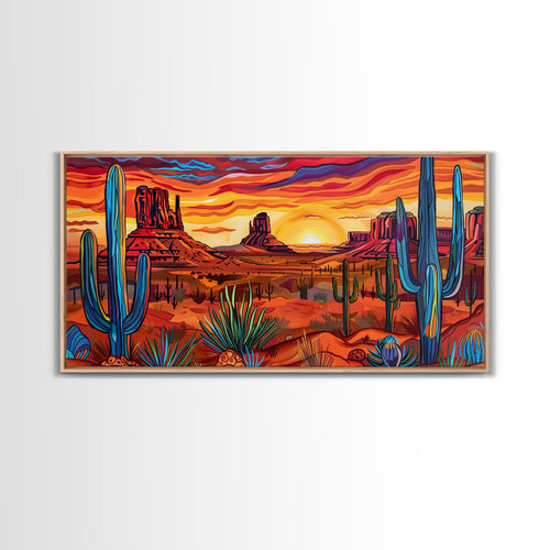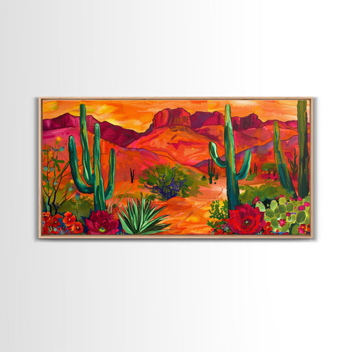 Colorful Desert Landscape with Cacti and Mountains, Stunning Framed Canvas Print for Living Room, Boho Wall Art, Nature Decor