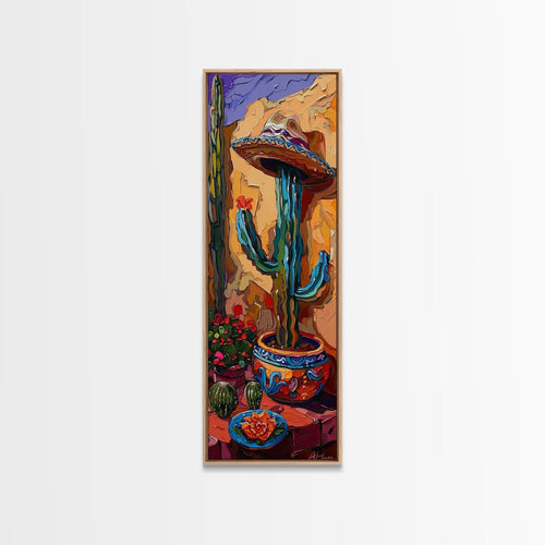 Colorful Canvas Painting of Cactus Framed, Botanical Wall Art Print, Spanish Inspired Canvas Painting, Long and Narrow Living Room Wall Art