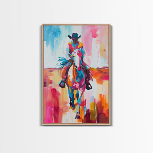 Colorful Cowboy Riding Horse Art - Framed Canvas Print, Vibrant Western Decor, Unique Living Room Wall Art, Home Decor