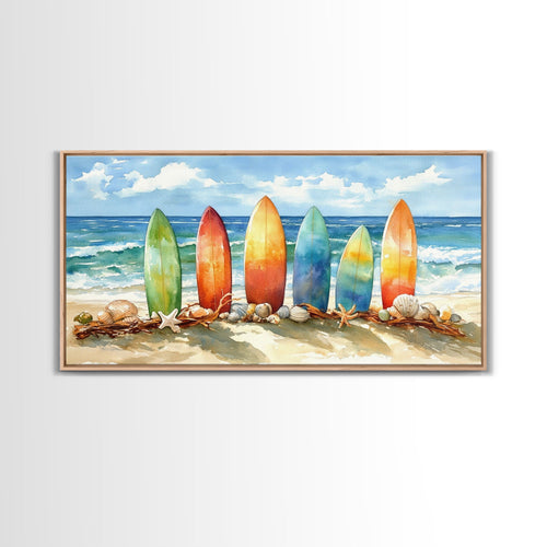 Colorful surfboards Christmas wall art, beach holiday decor, coastal Christmas art, framed canvas print, tropical Christmas art gift