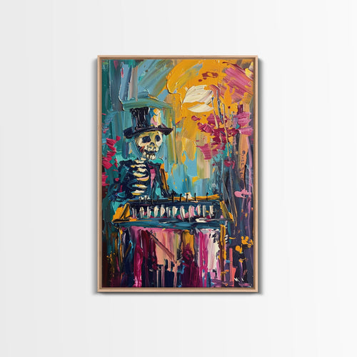 Colorful Skeleton with Top Hat Framed Canvas Print, Halloween Art, Creepy Wall Art, Spooky Home Decor, Scary Art, Vibrant Living Room Decor