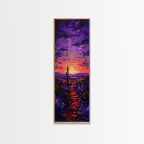 Colorful Sunset Over a Desert Landscape with a Saguaro Cactus and Dramatic Sky on a Framed Canvas Print Skinny Art Piece