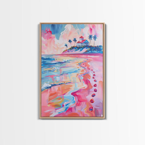Colorful Tropical Beach Scene with Palm Tree - Framed Canvas Print, Vibrant Coastal Art, Living Room Decor, Beach Wall Art