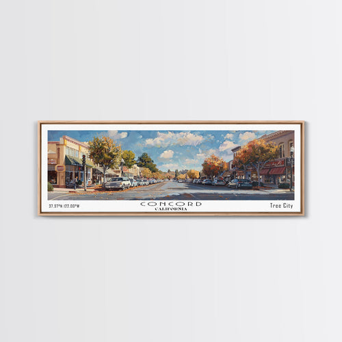 Concord California Panoramic Painting, Mid Century Modern Framed Canvas Print, Retro Pop Art Travel Poster, City Wall Decor, Office Decor
