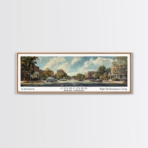 Concord North Carolina Panoramic Wall Art, Mid Century Modern Framed Canvas Print, Retro Pop Art Travel Poster, City Office Art, Home Decor