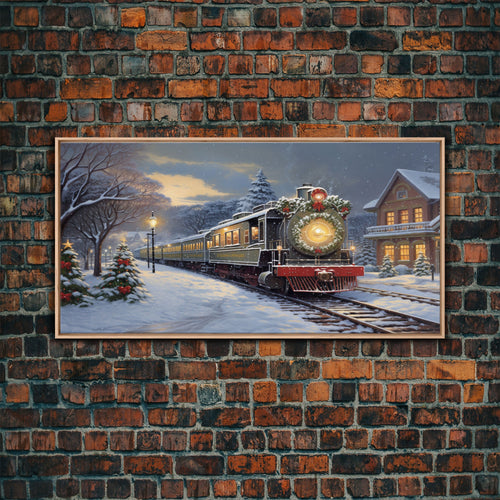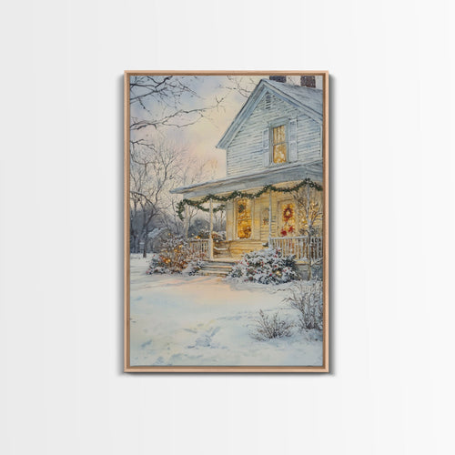 Farmhouse Christmas decor Framed Canvas Print snowy white farmhouse with wreath winter wonderland holiday decor best gift Christmas wall art