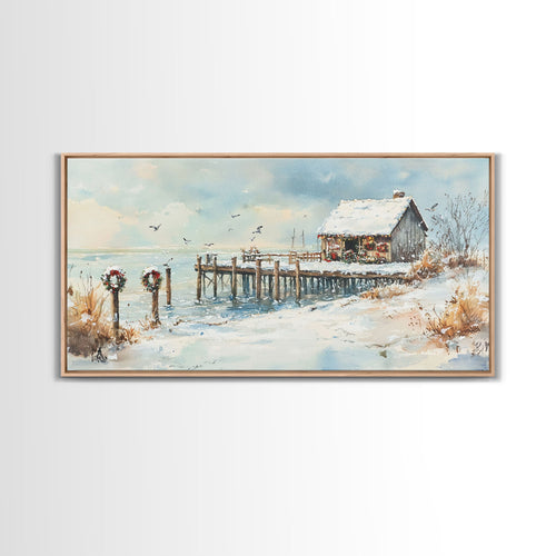 Farmhouse Christmas decor Framed Canvas Print rustic cabin snowy dock Christmas scene Christmas outdoor decor vintage holiday wall art