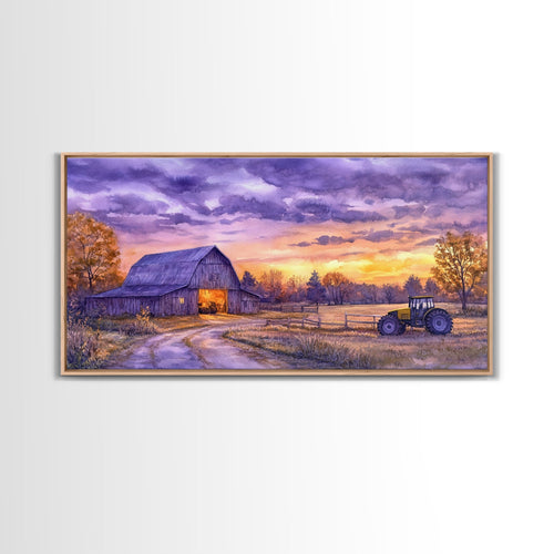 Farmhouse autumn decor Framed Canvas Print evening barn scene with tractor warm fall colors gift idea autumn seasonal wall art rustic decor