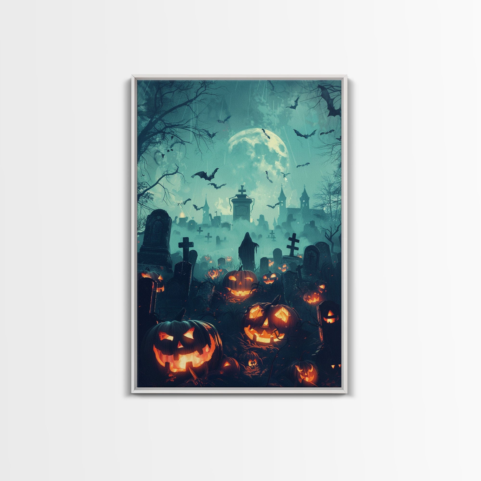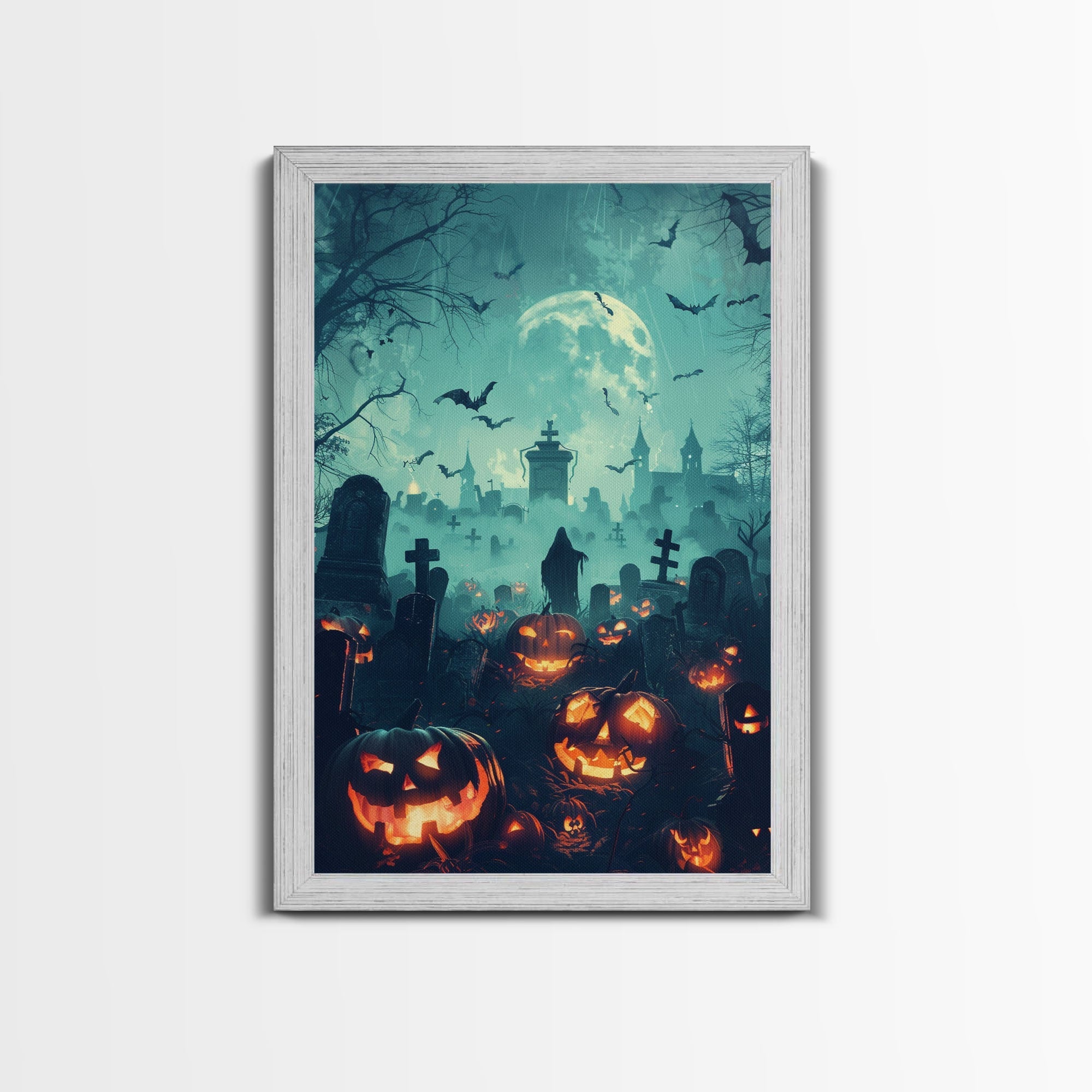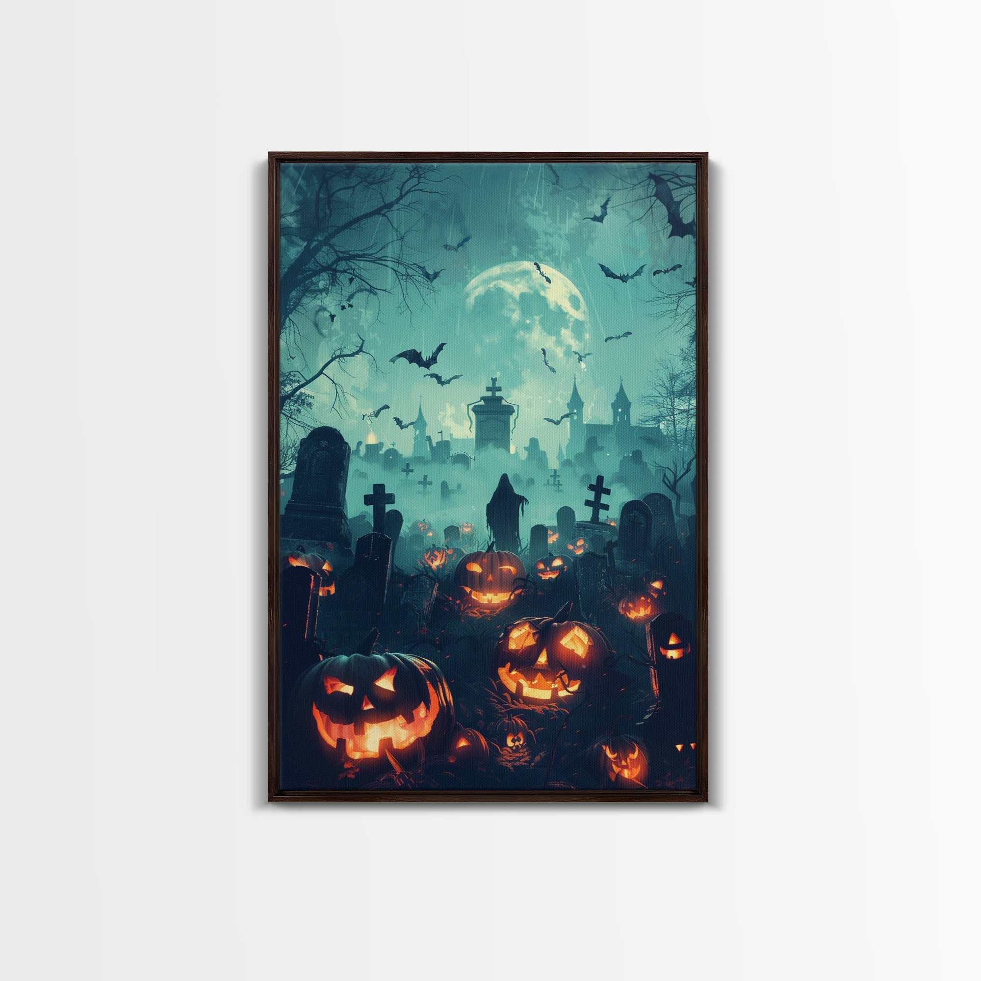 Bats and Jack-O-Lanterns Framed Canvas Print, Halloween Wall Art, Haunted Graveyard, Home Decor, Spooky Art, Living Room Decor, Gothic Art