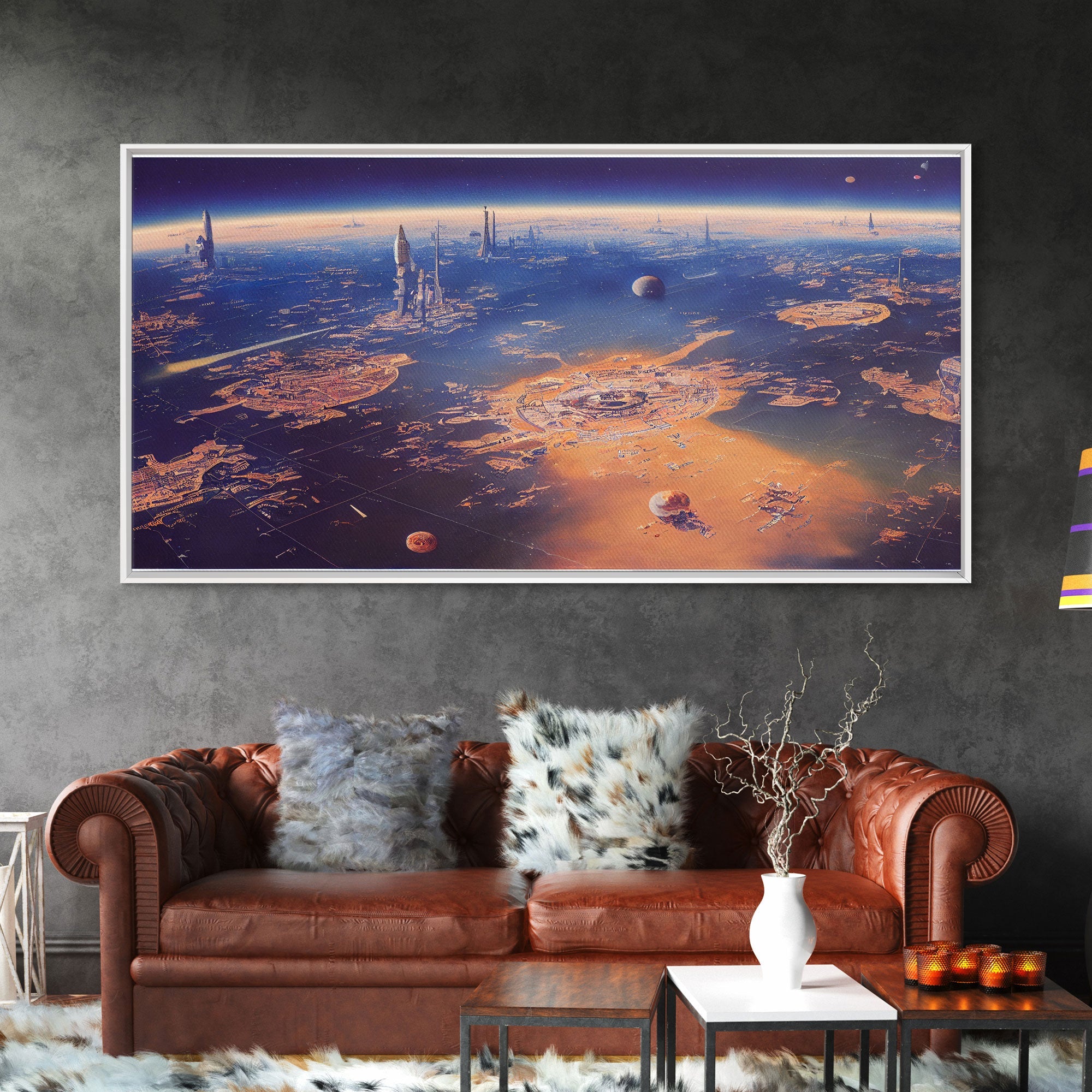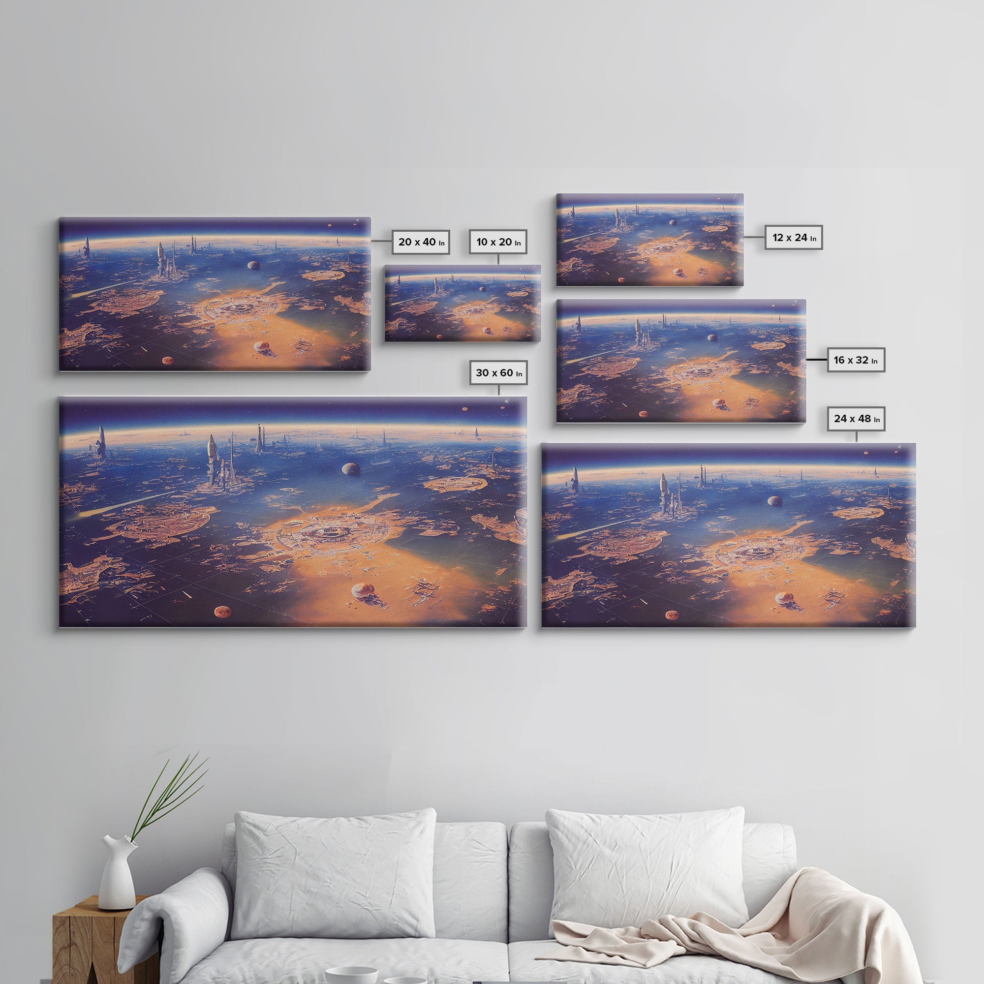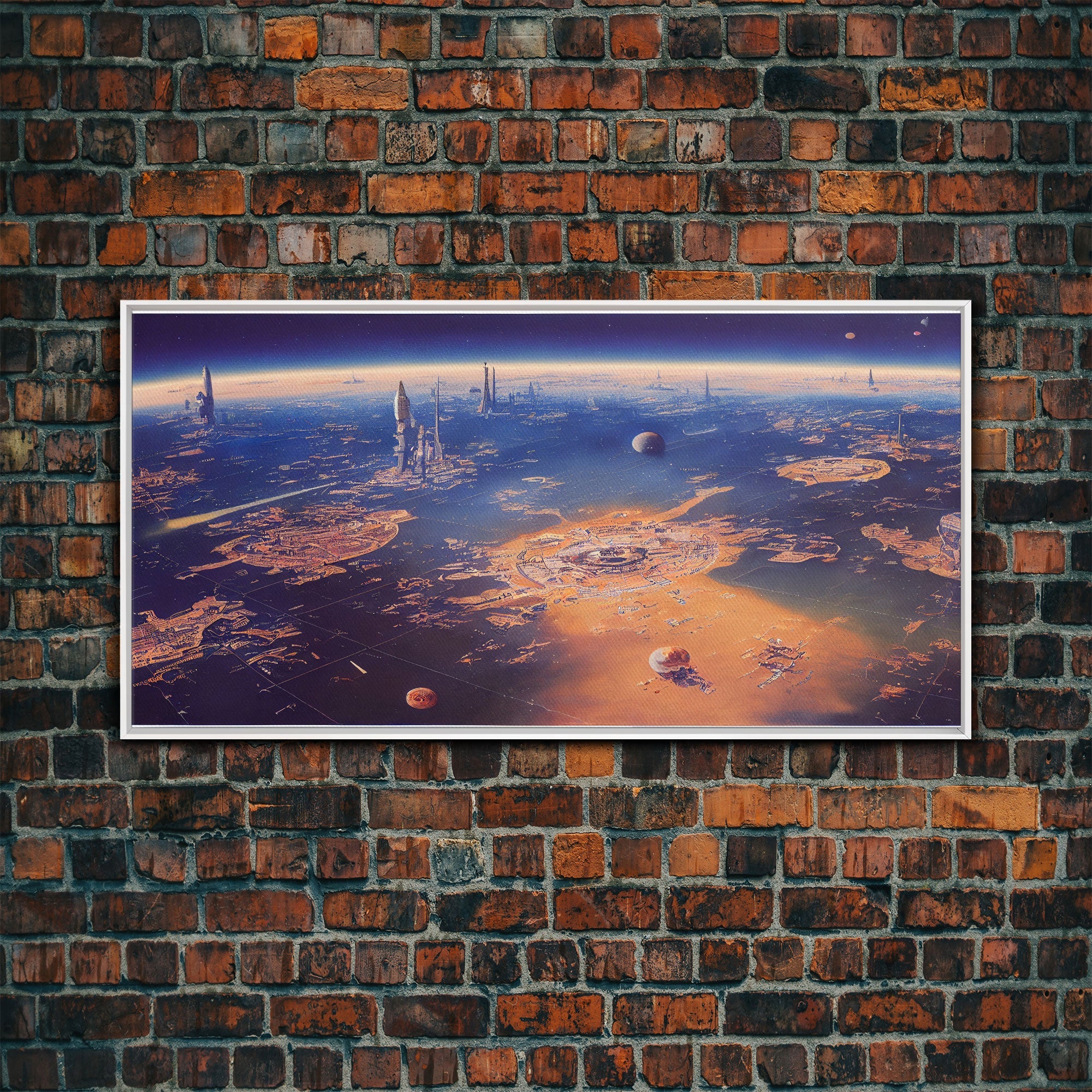 Bird's eye view of a futuristic city-planet, cool scifi art, framed canvas print, ready to hang framed wall art
