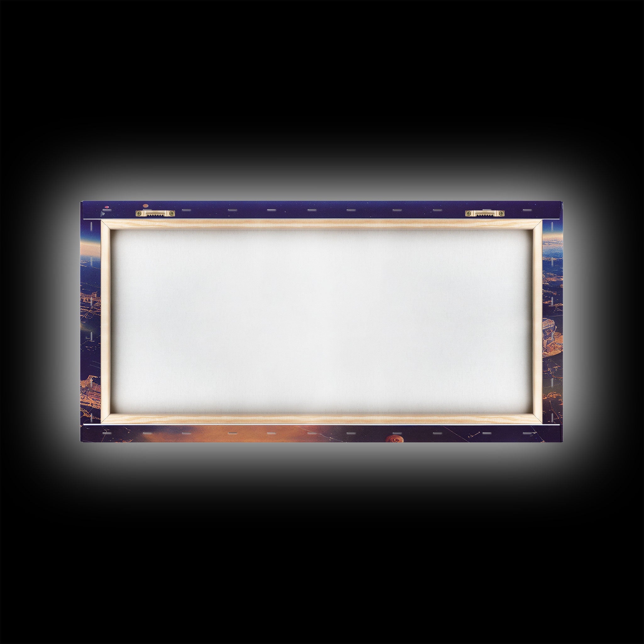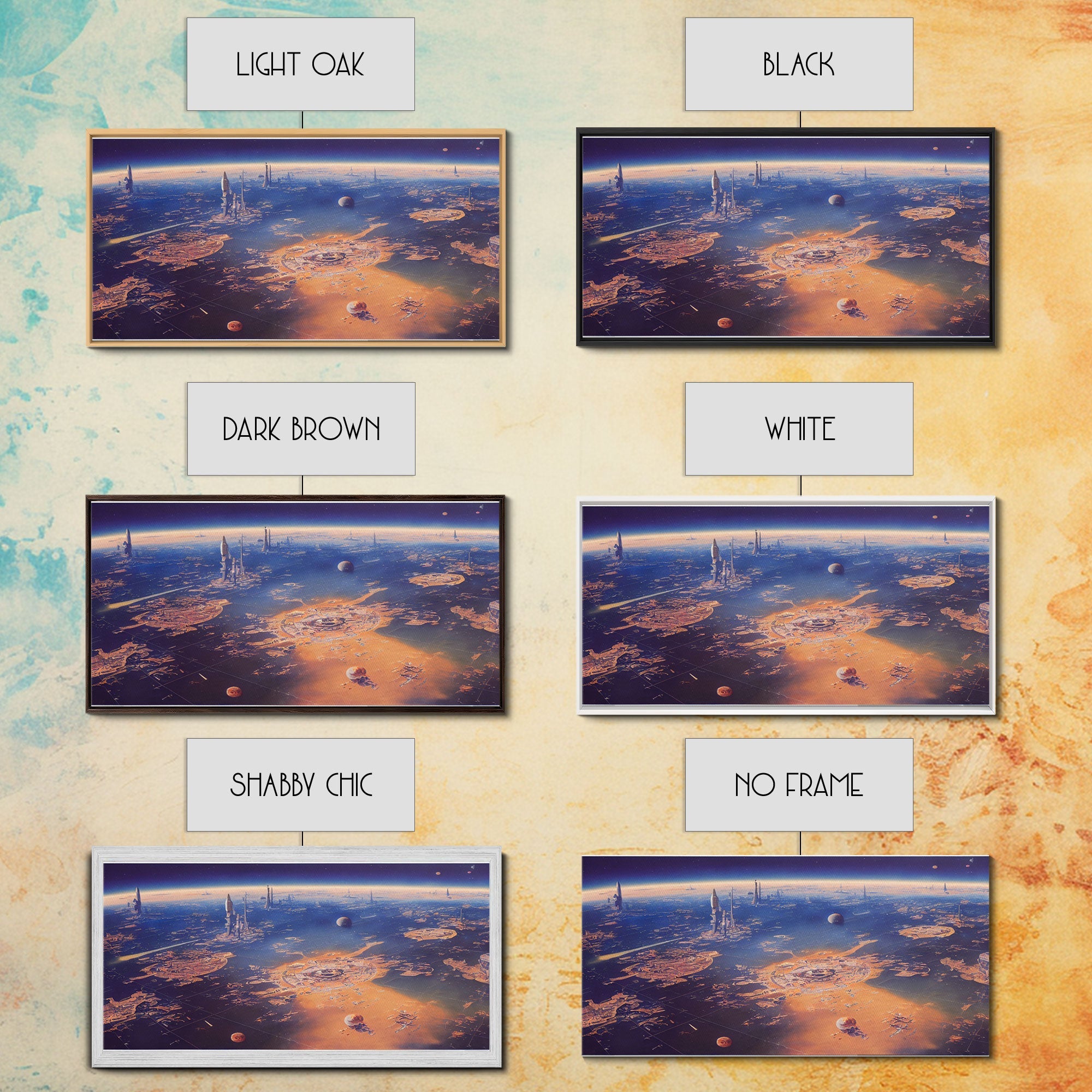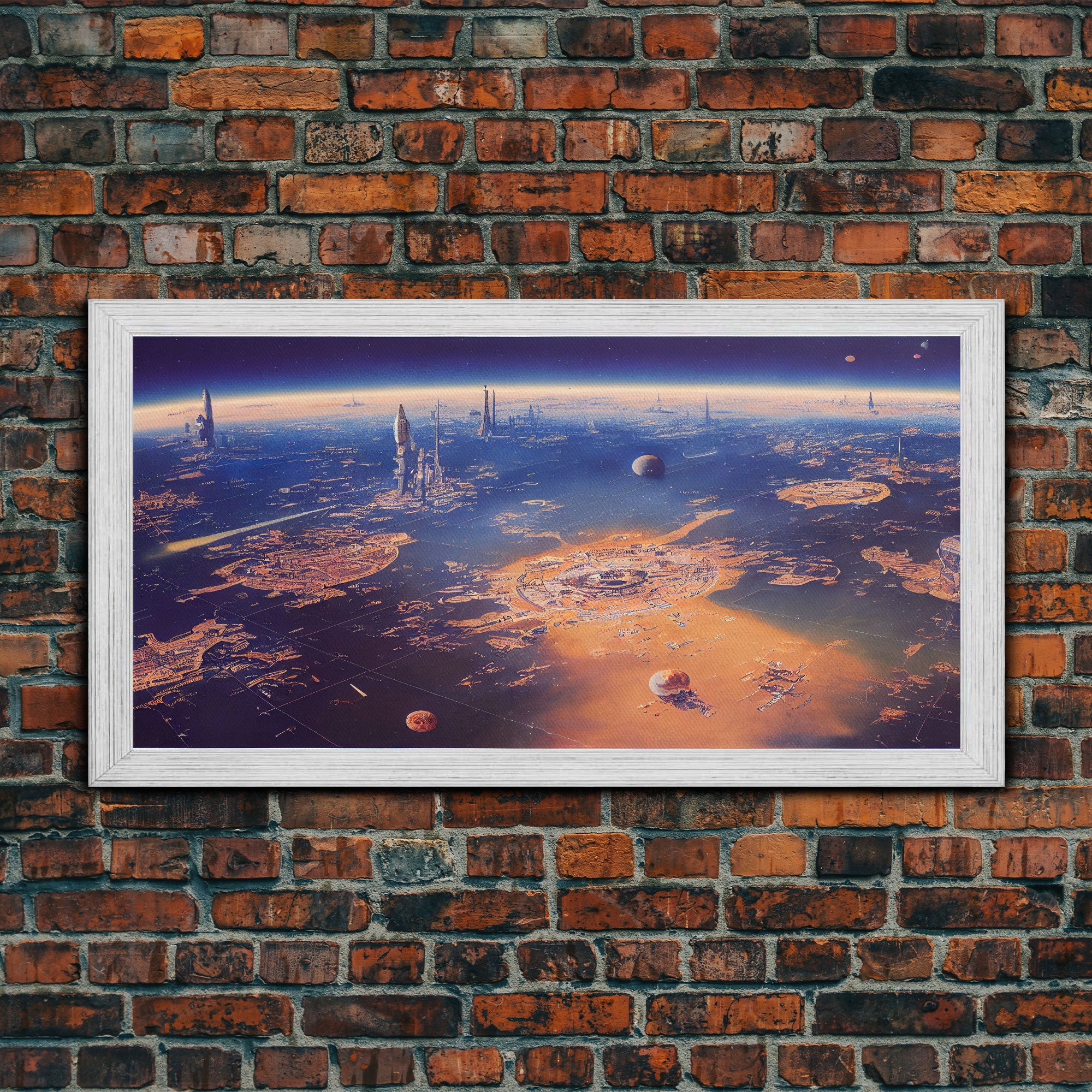 Bird's eye view of a futuristic city-planet, cool scifi art, framed canvas print, ready to hang framed wall art
