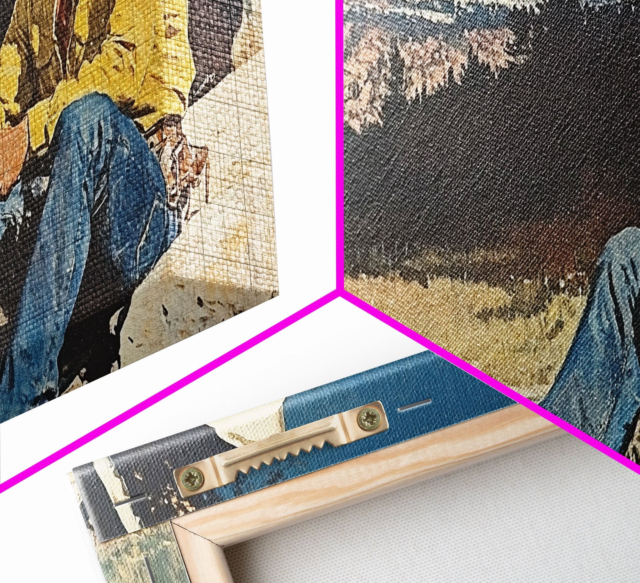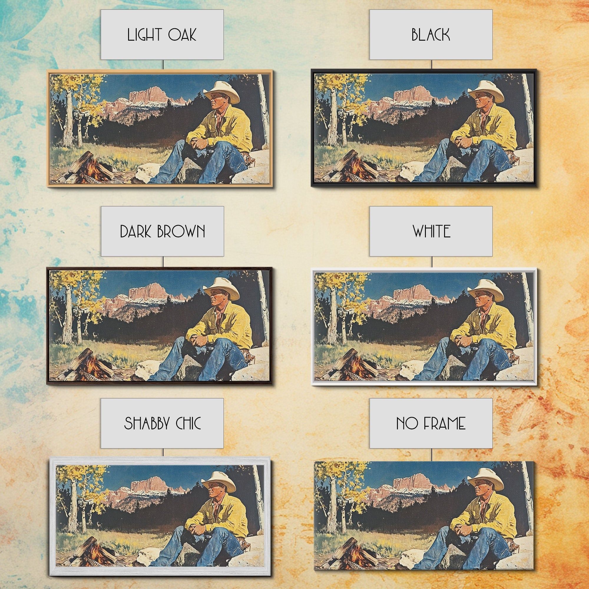 Bold monochromatic Framed Canvas Print showcasing a woman in a cowboy hat with horses in a snowy mountain landscape, rustic winter wall art