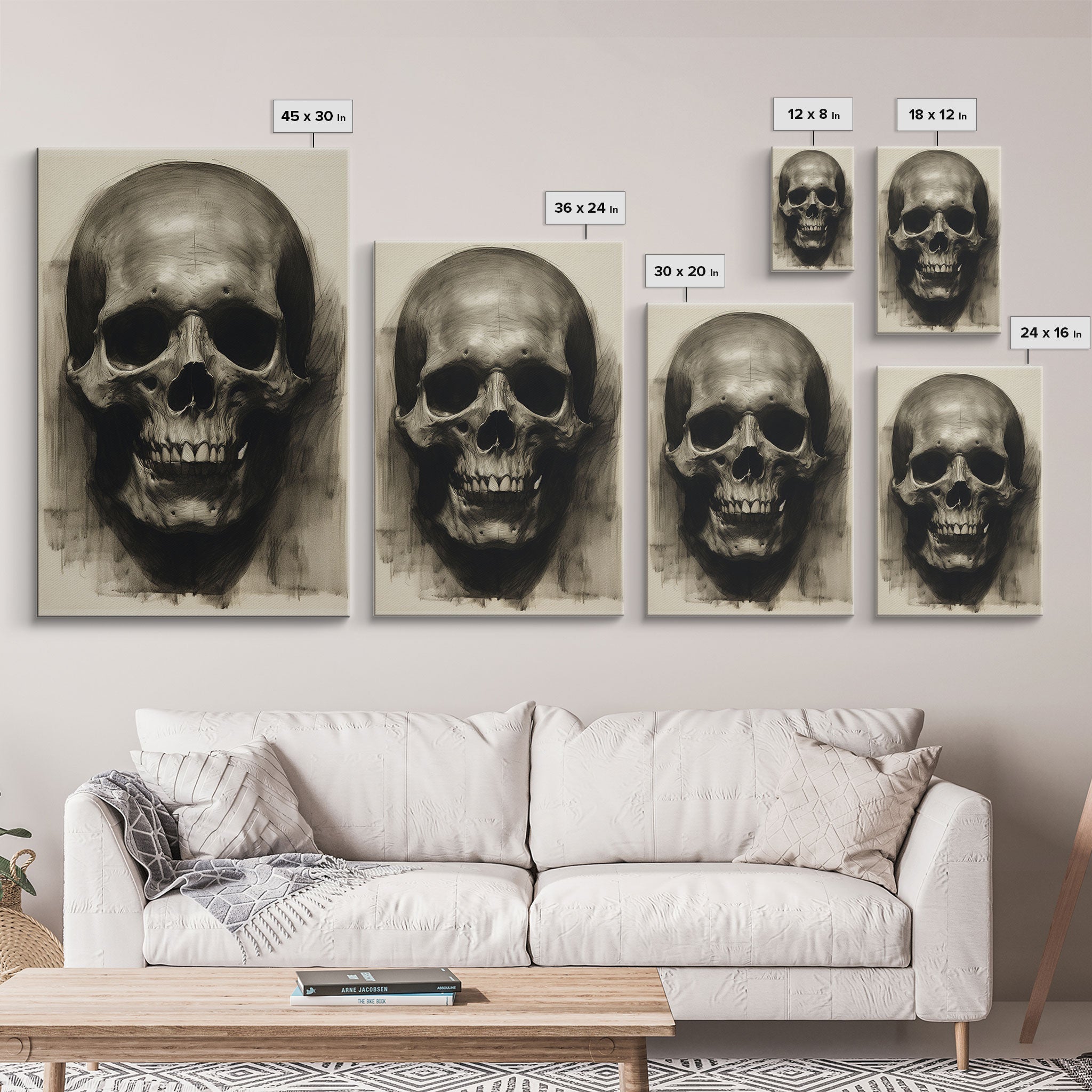 Charcoal Drawing, Gothic Art Print, Human Skull Decor, Canvas Print, Wall Art, Vertical Art, Entryway Prints, Wall Hanging, Birthday Gift