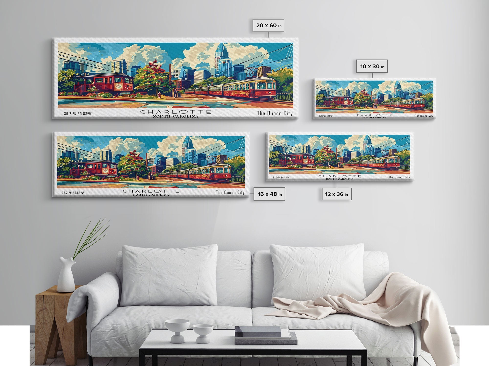 Charlotte North Carolina Panoramic Painting Framed Canvas Print, Mid Century Modern Art, Pop Art Style, Travel Poster, Wall Art Decor