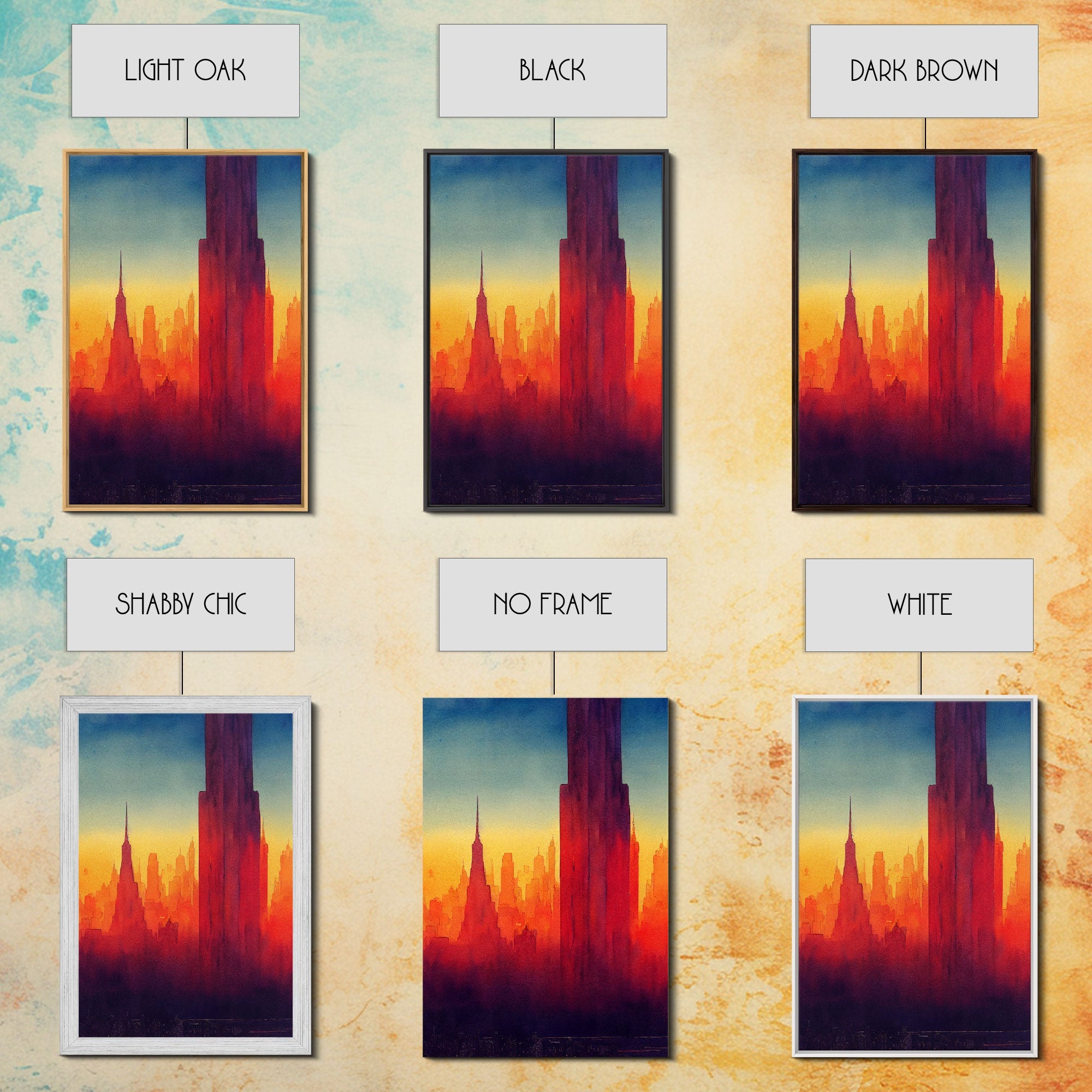 Chicago at sunset concept art, synthwave style, framed canvas print, ready to hang wall art with frame