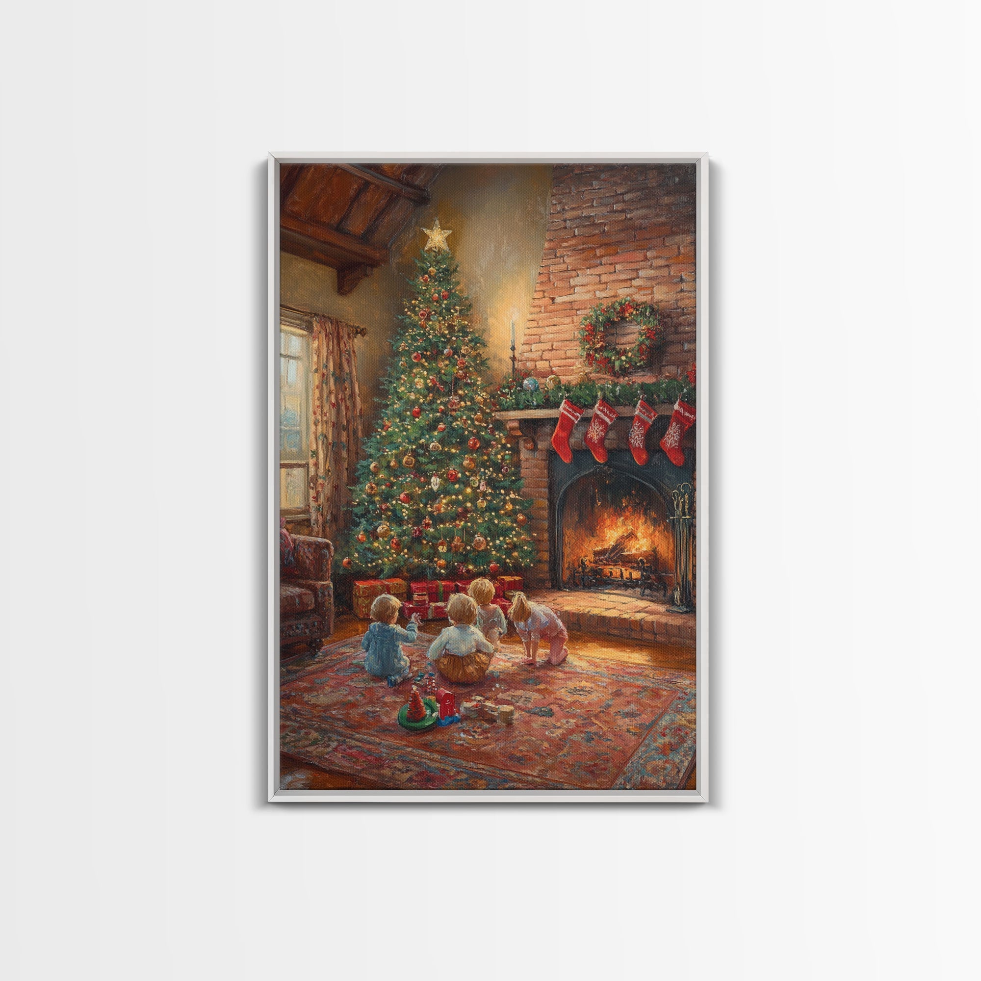 Children By Fireplace And Christmas Tree Framed Canvas Print Cozy Holiday Home Decor With Warm Fire And Festive Decorations Christmas Art