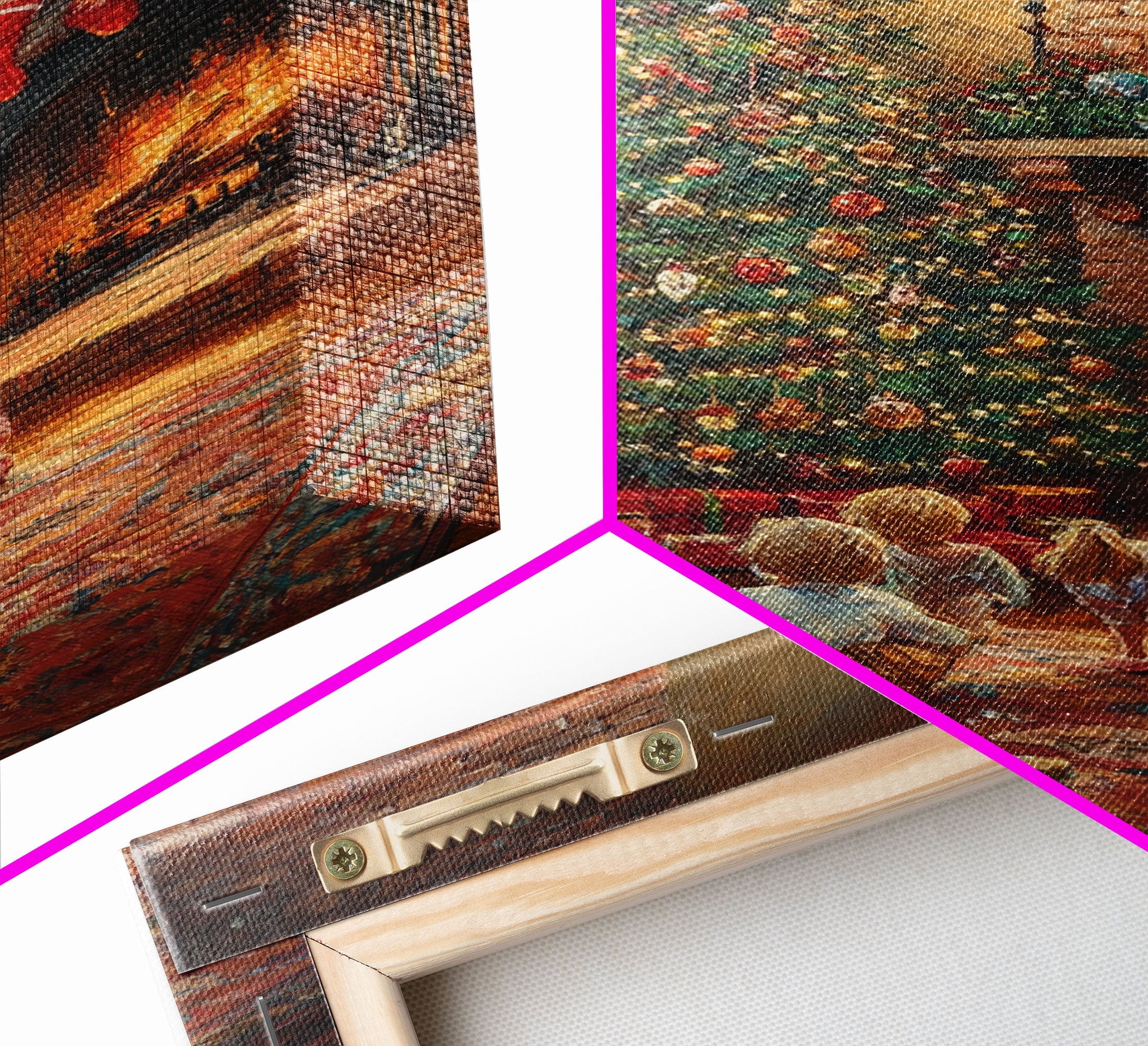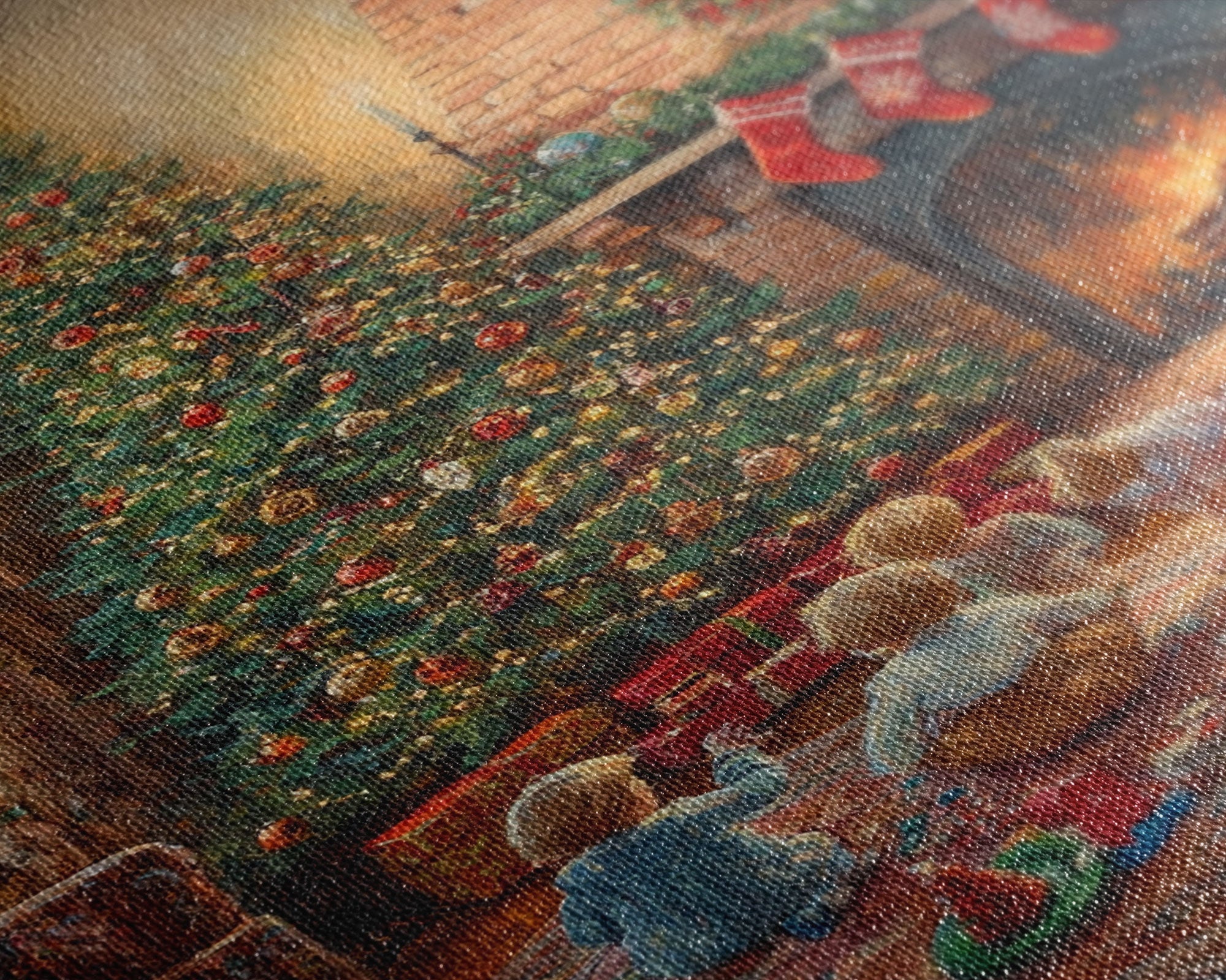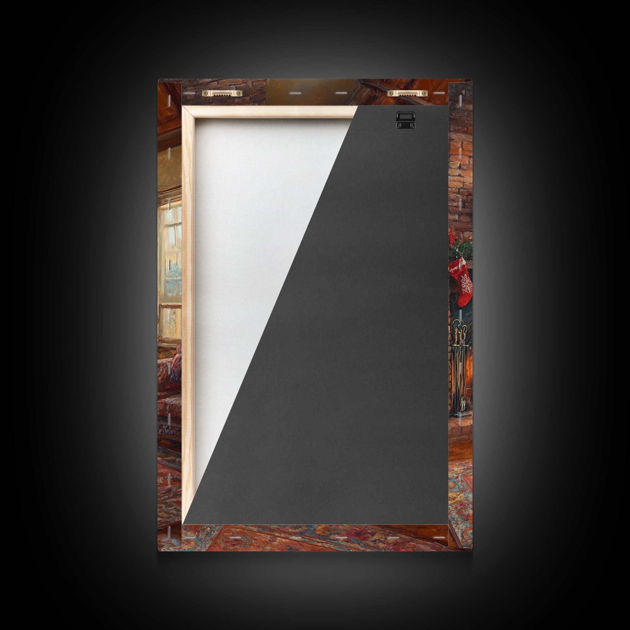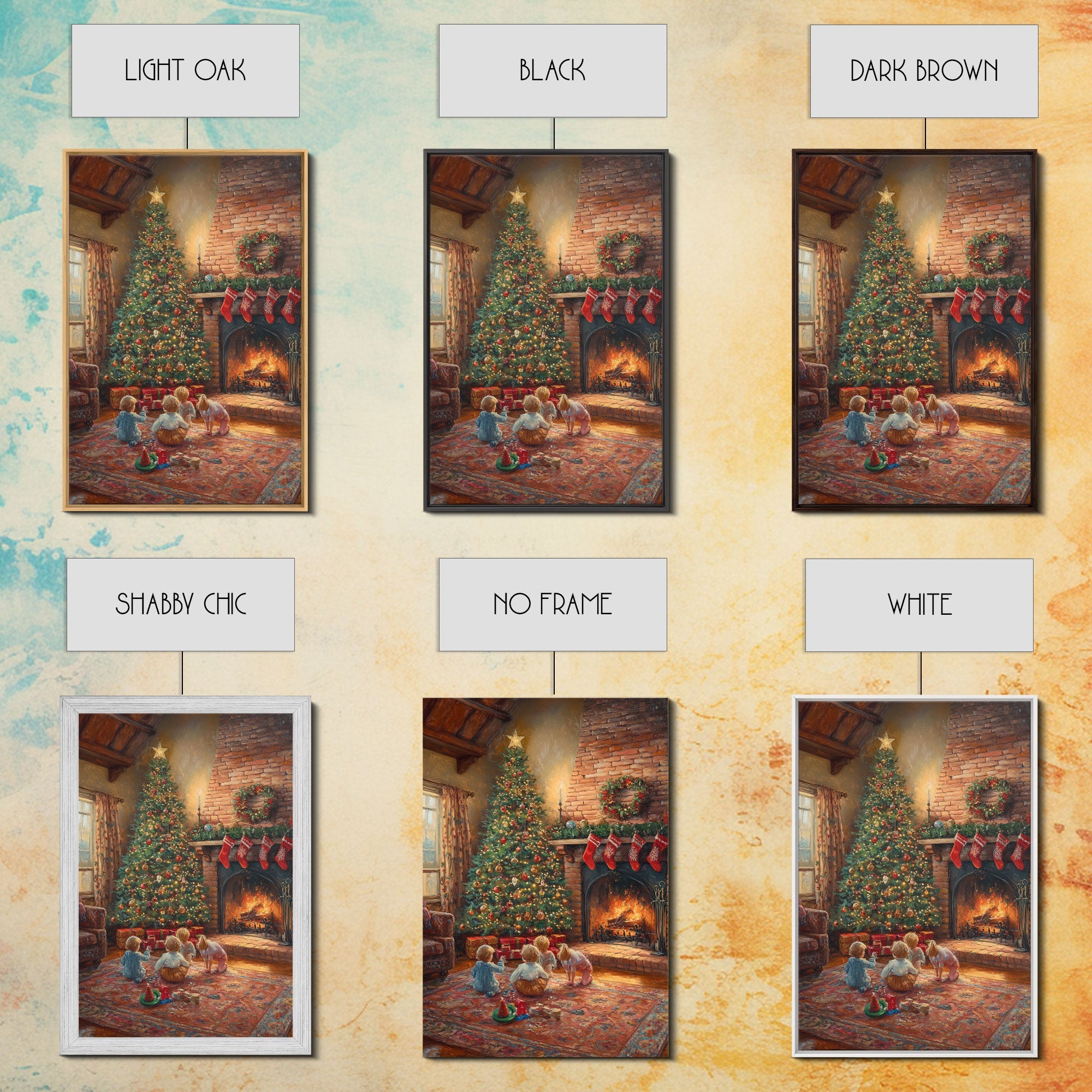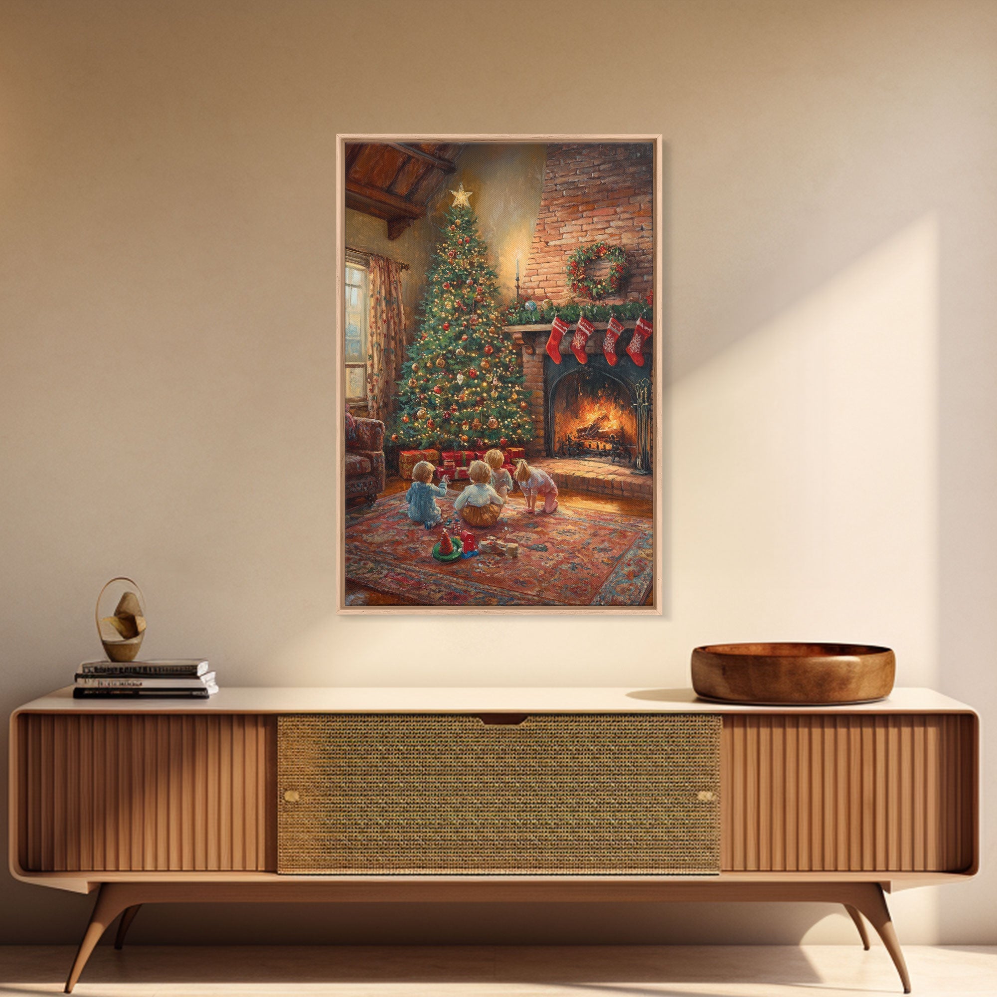 • Cargar imagen en el visor de la galería, Children By Fireplace And Christmas Tree Framed Canvas Print Cozy Holiday Home Decor With Warm Fire And Festive Decorations Christmas Art