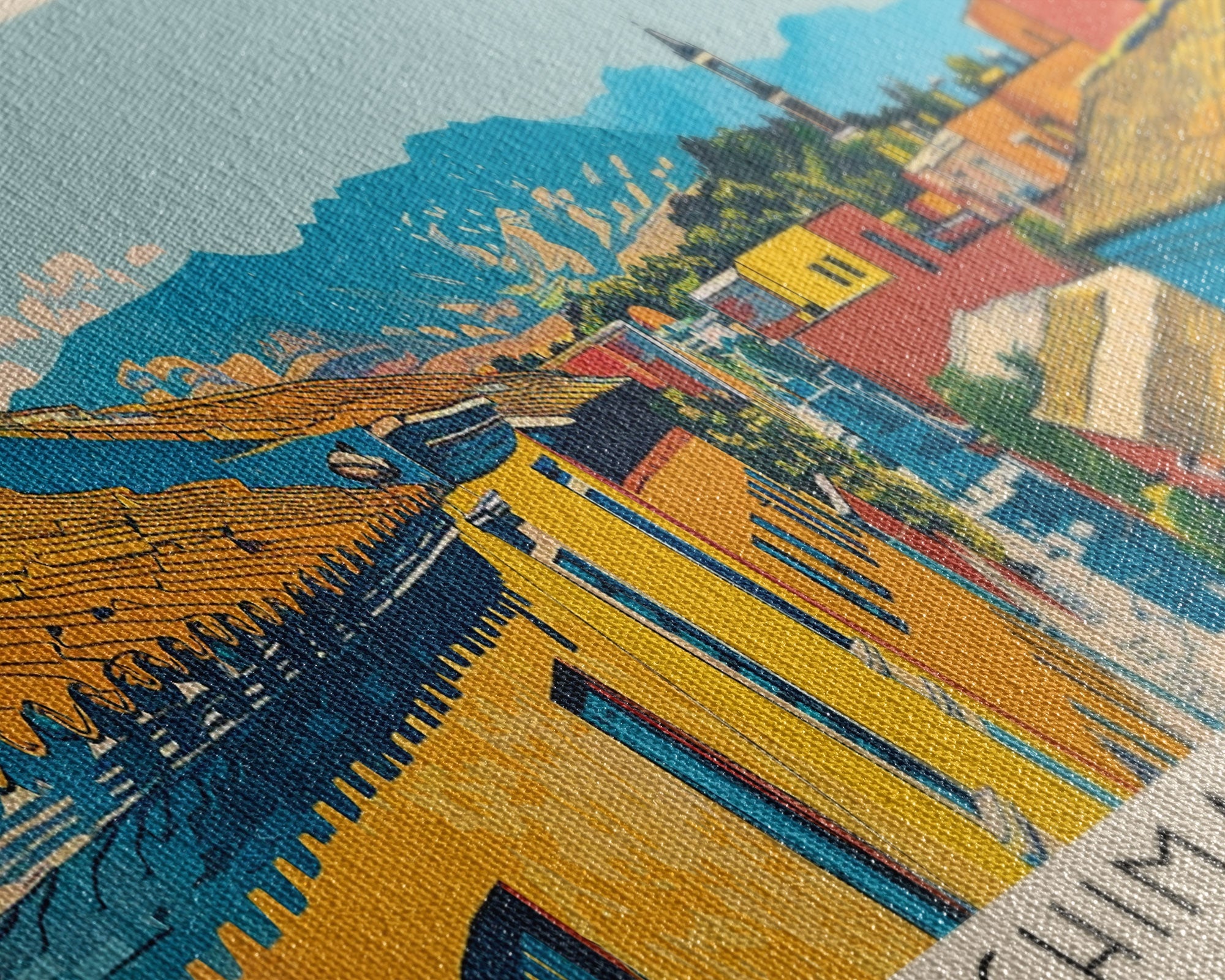 Most of our canvases are made in the USA, with the exception of canvases ordered with the light oak unstained frames, and any large canvases (24x48, 30x60, 16x48 and 20x60) ordered WITH a frame. These are temporarily made in and shipped from Europe, while we try to find a more consistent supplier in the USA.