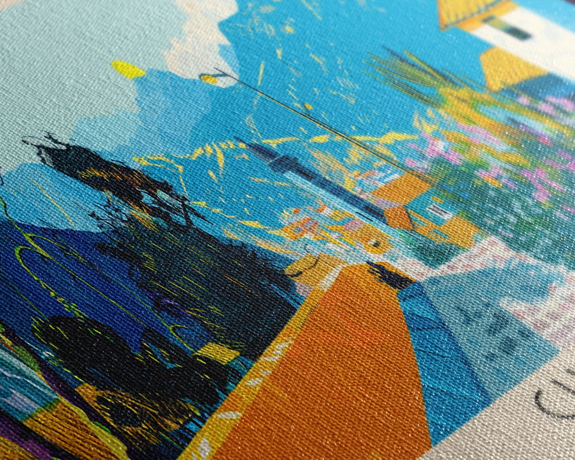 Most of our canvases are made in the USA, with the exception of canvases ordered with the light oak unstained frames, and any large canvases (24x48, 30x60, 16x48 and 20x60) ordered WITH a frame. These are temporarily made in and shipped from Europe, while we try to find a more consistent supplier in the USA.