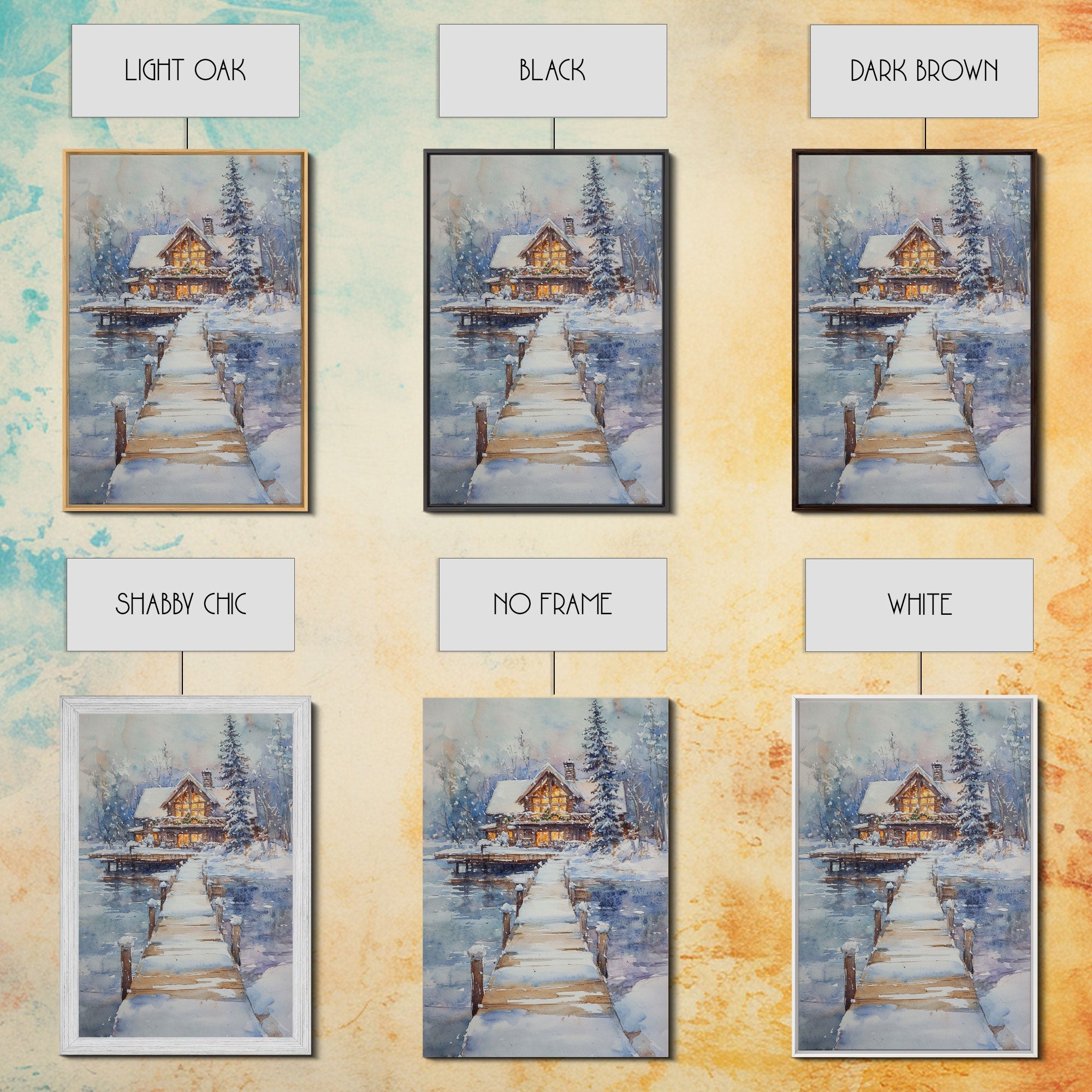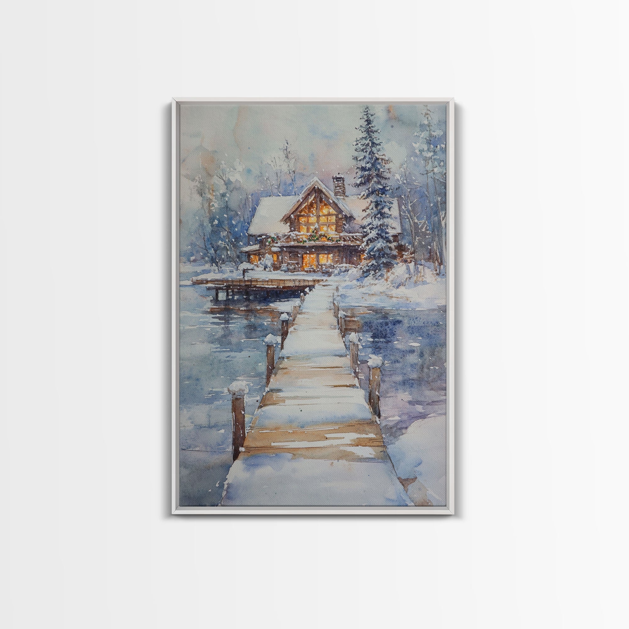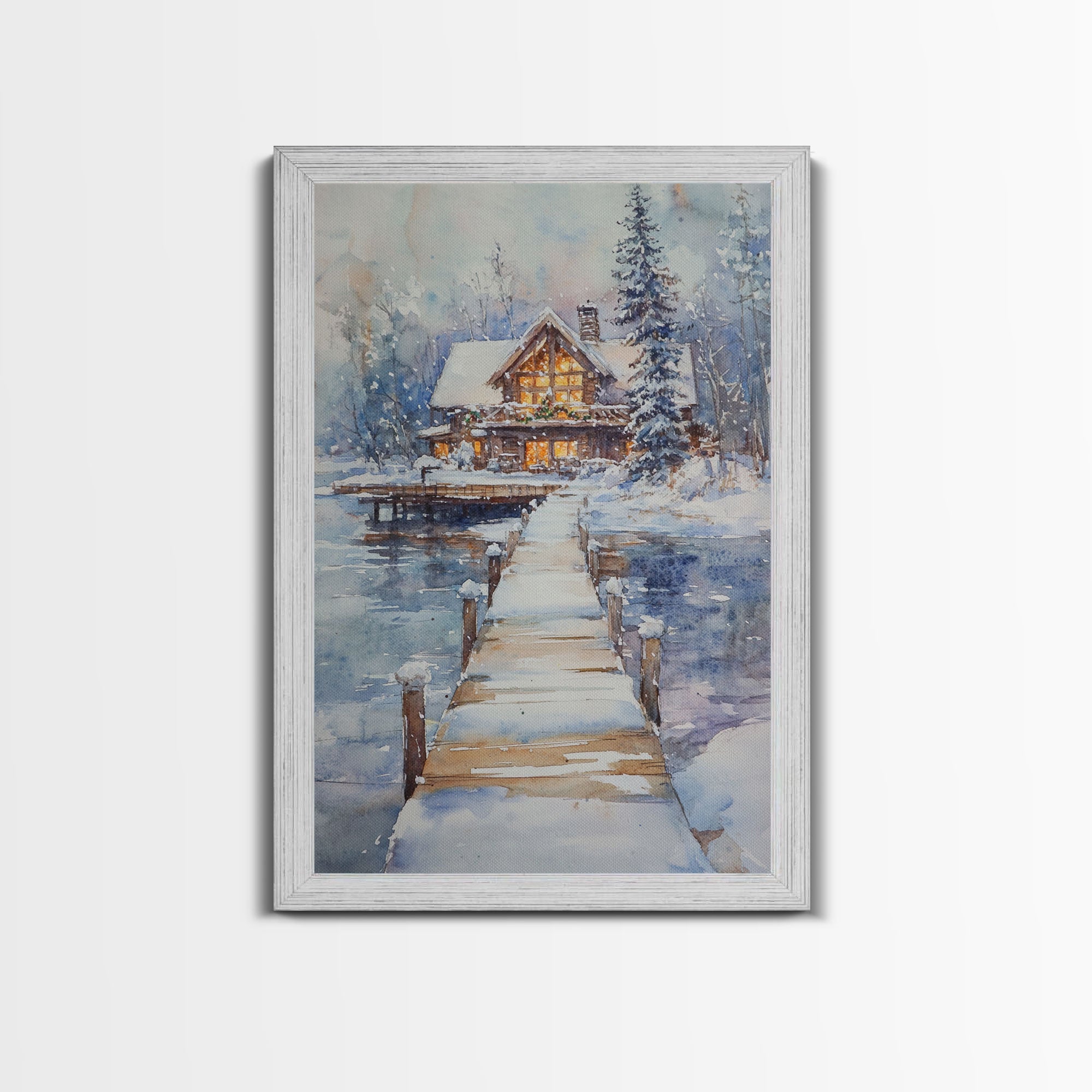 Christmas At The Lake, Framed Canvas Print, Wood Frame Lake House Decor, Winter Lakehouse Art