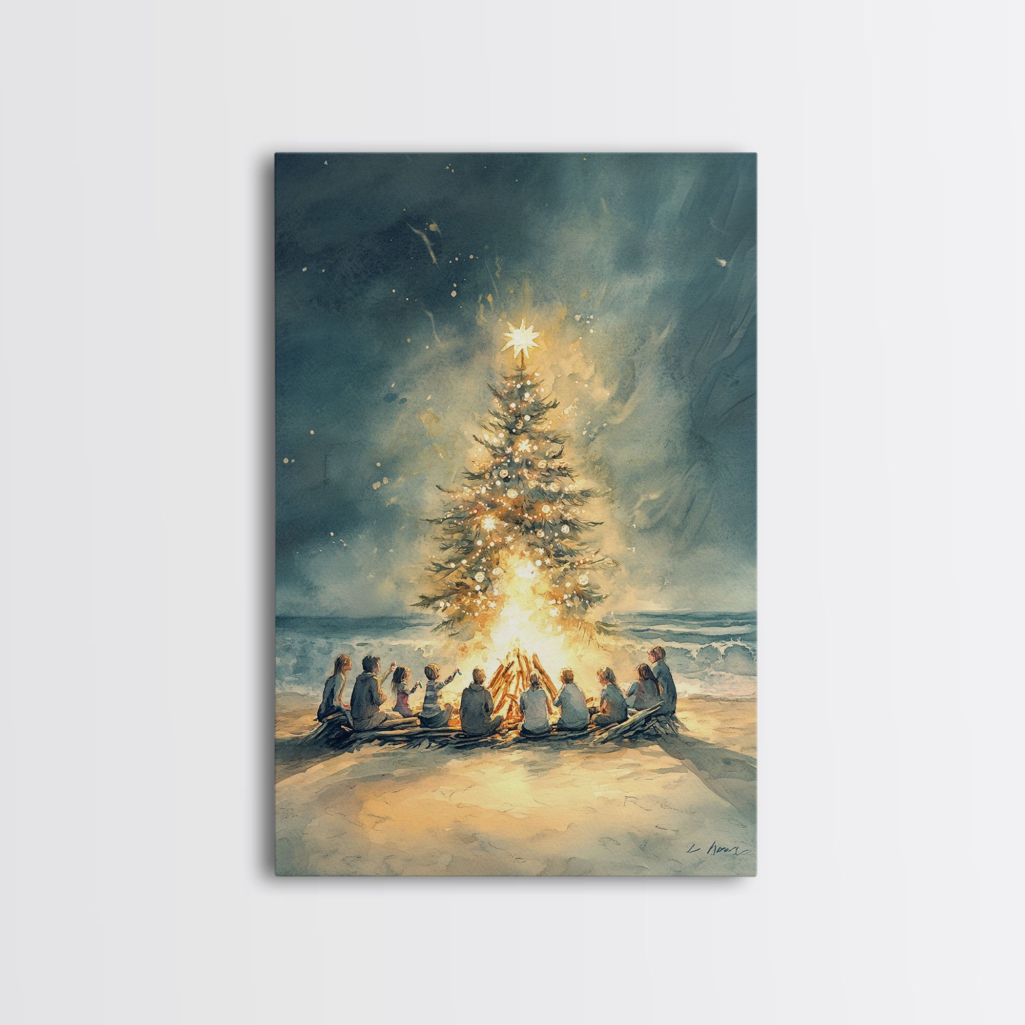Christmas Beach Bonfire Framed Canvas Print, Christmas Painting Wall Art, Christmas Handmade Art, Best Gift Christmas Decor
