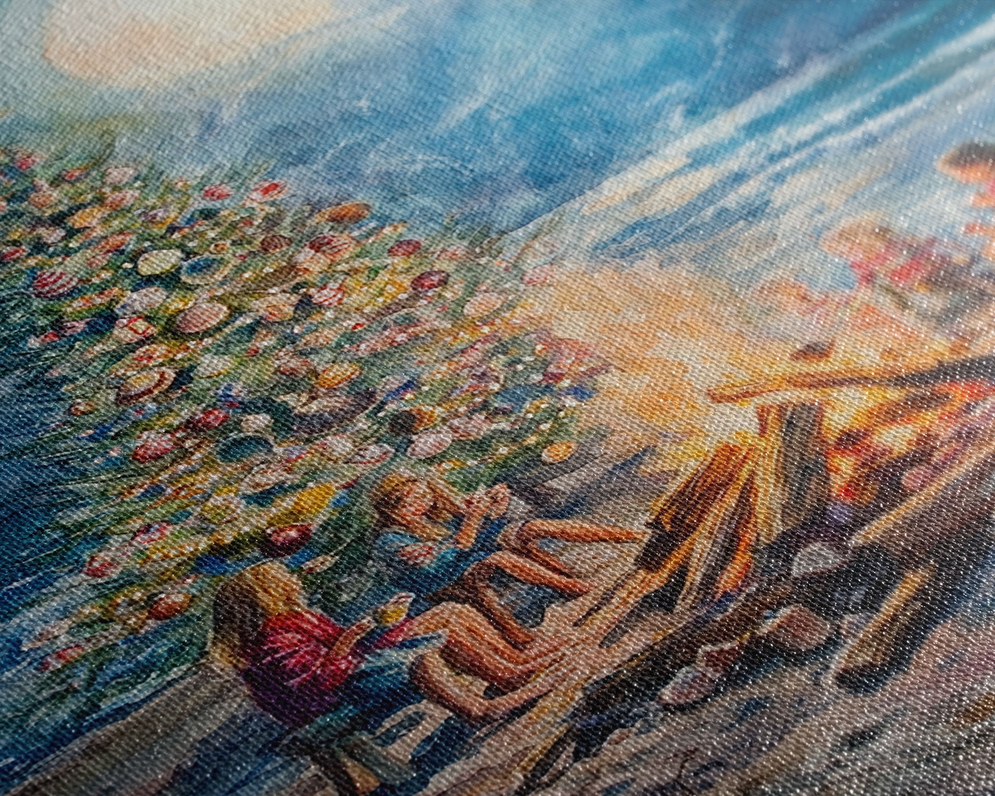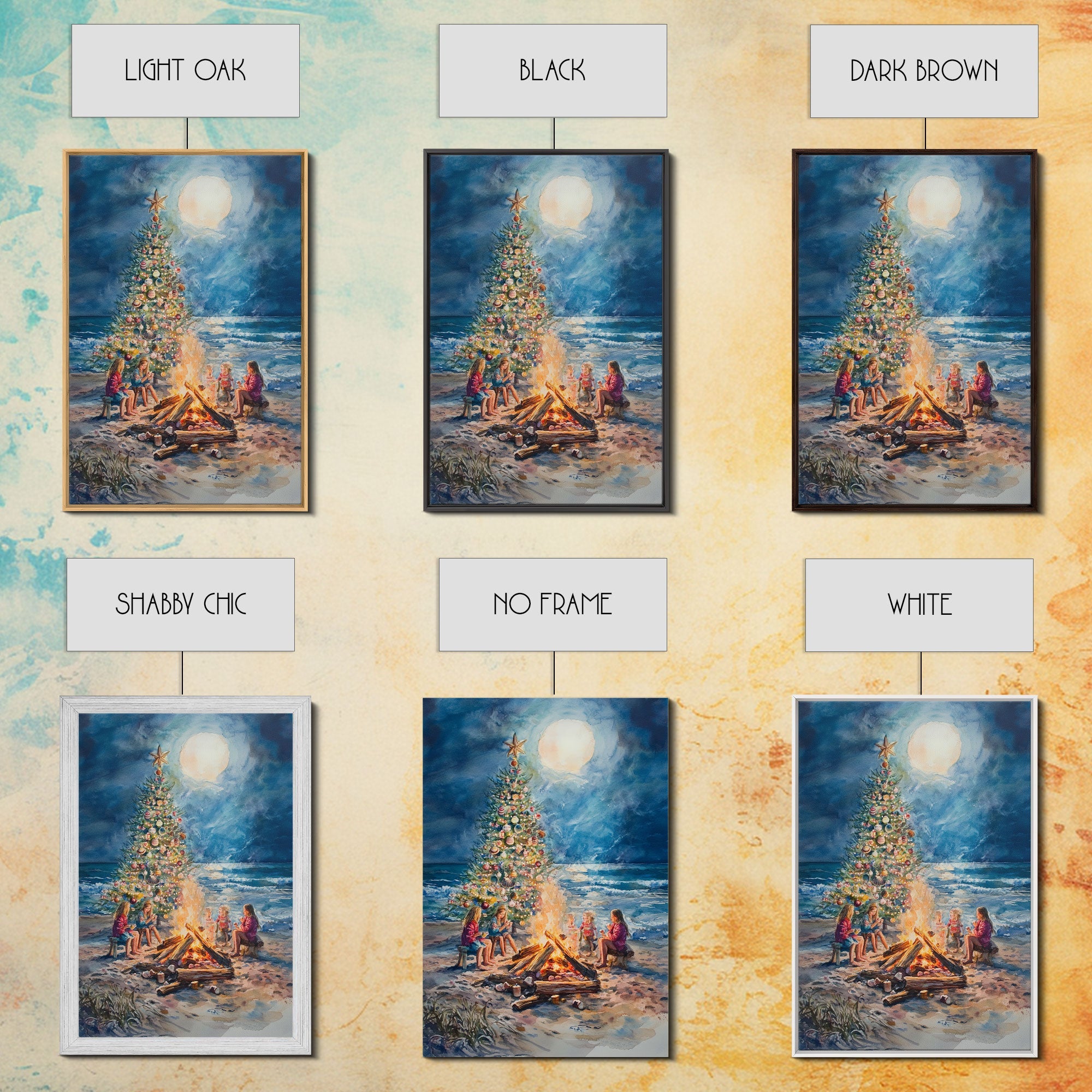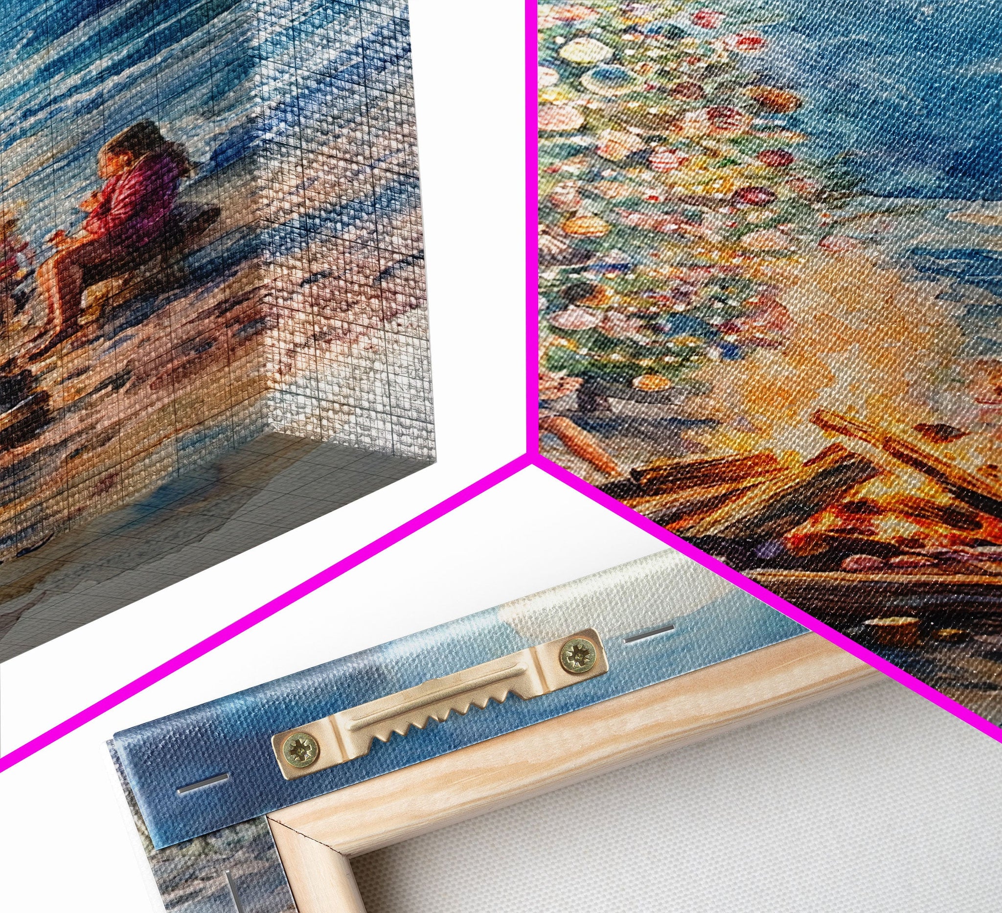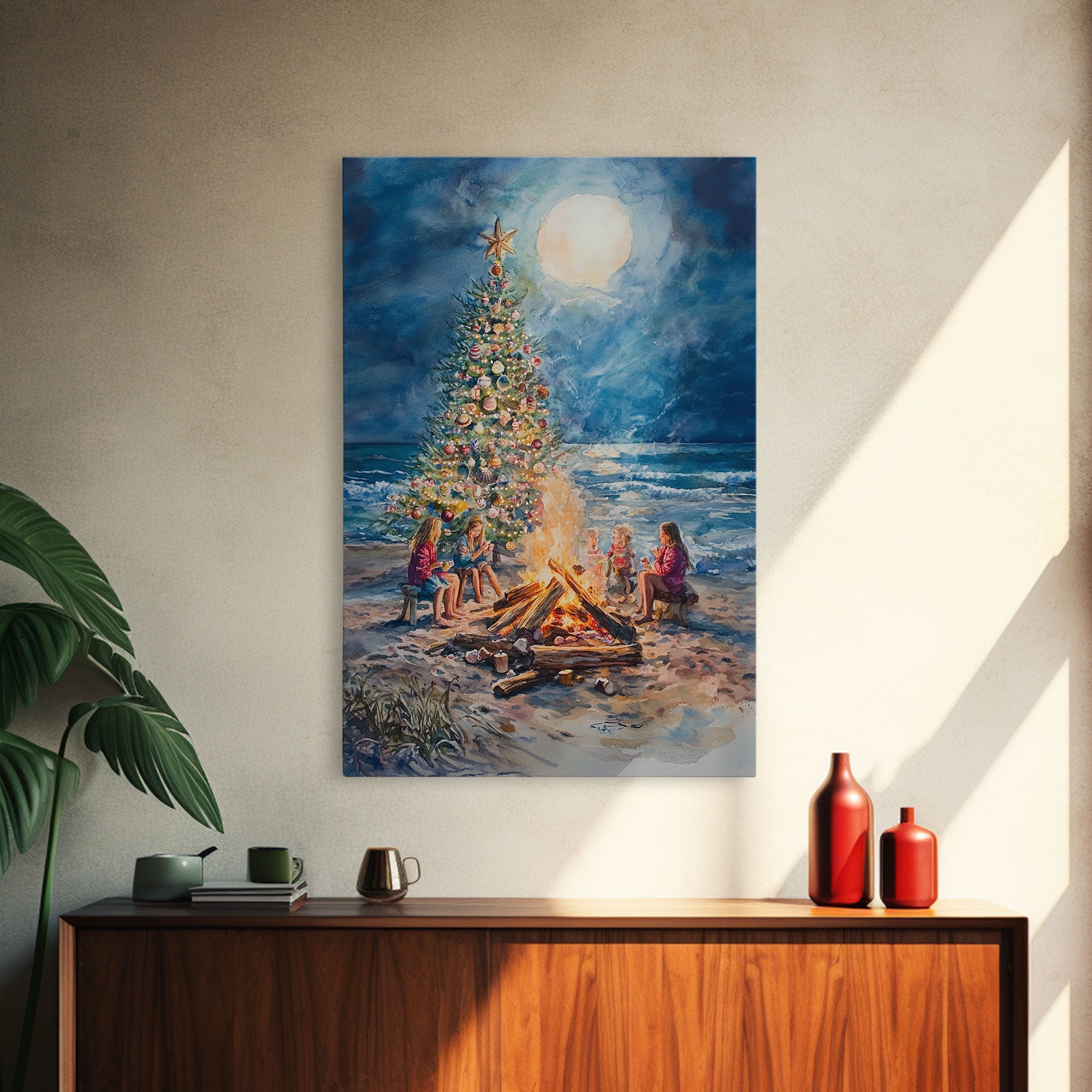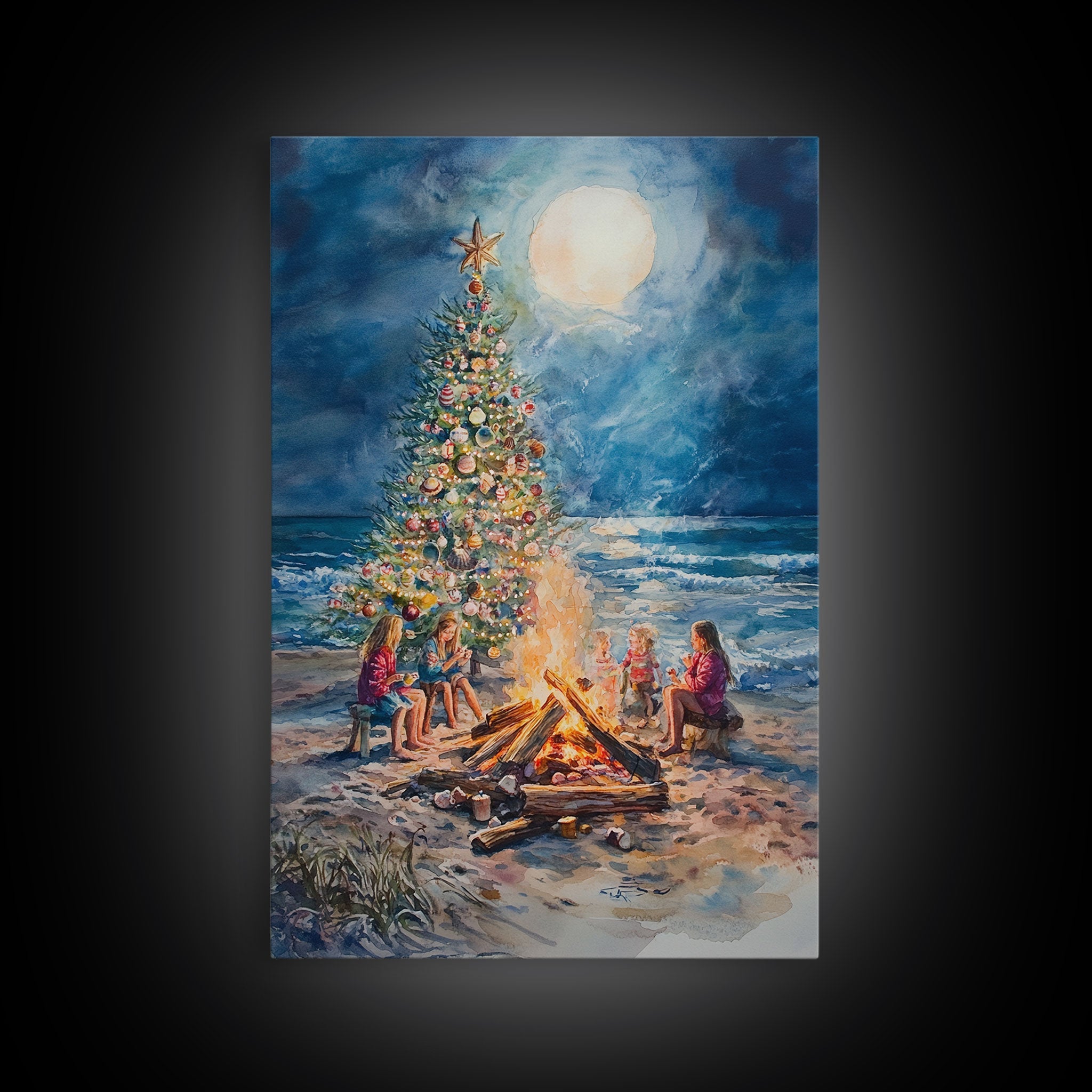 Christmas by the Bonfire Framed Canvas Print Family Gathering Around Christmas Tree Beach, Coastal Holiday Wall Art Nautical Christmas Decor
