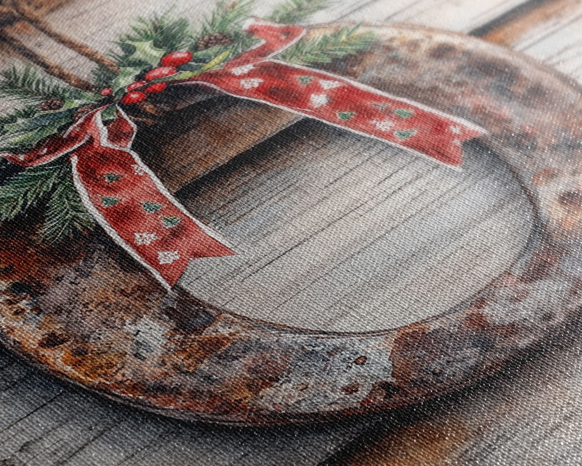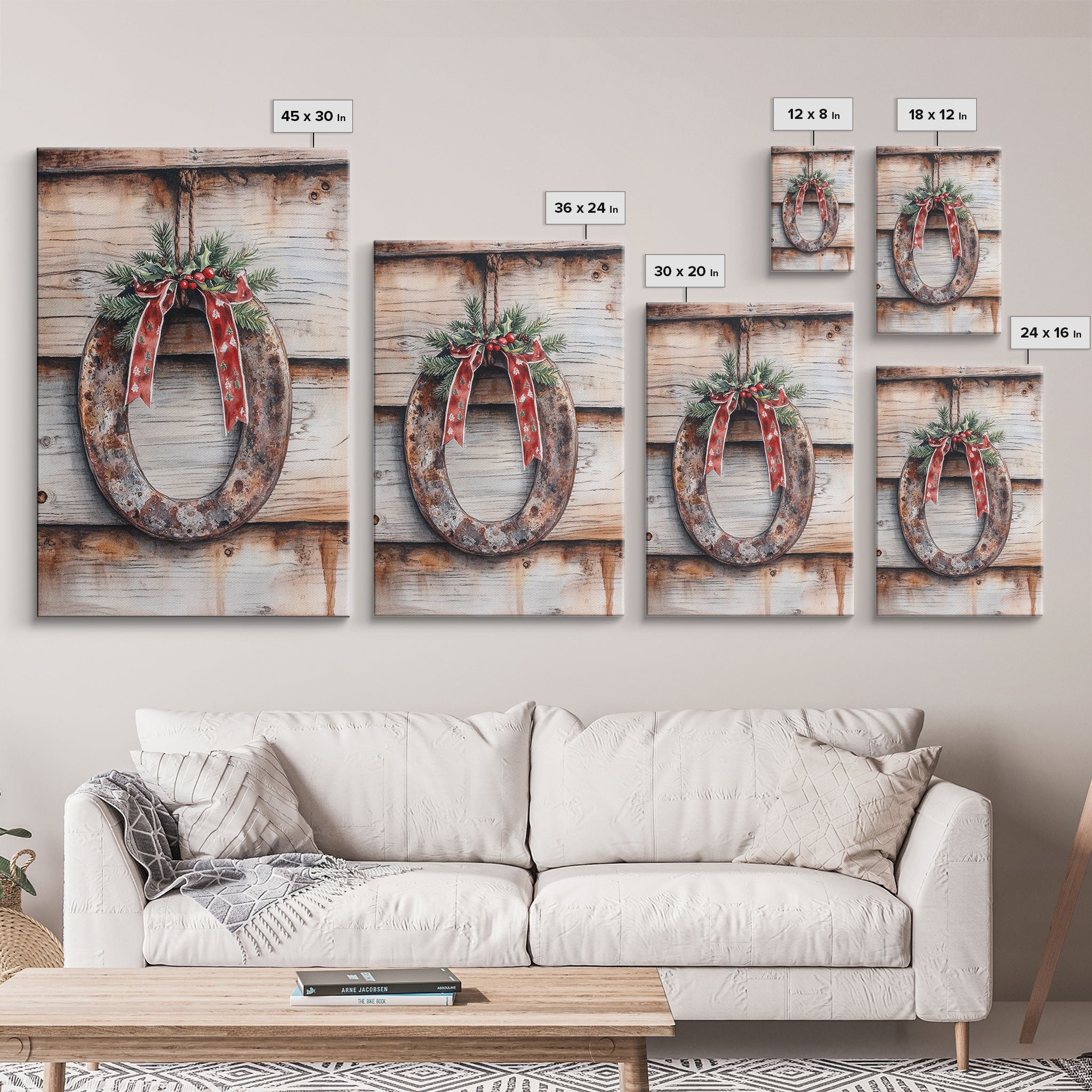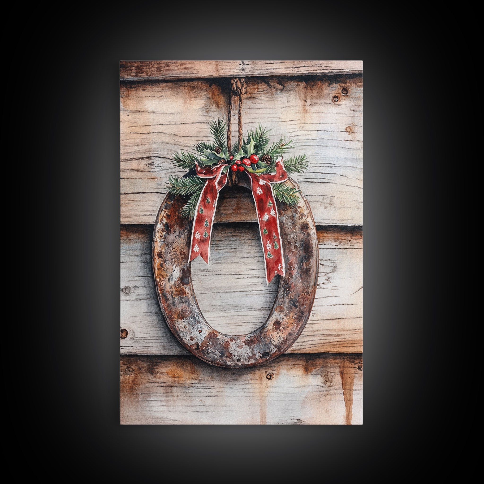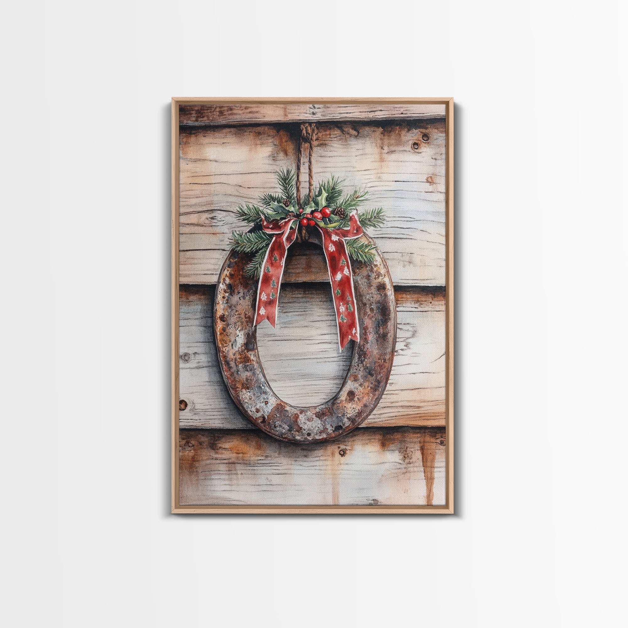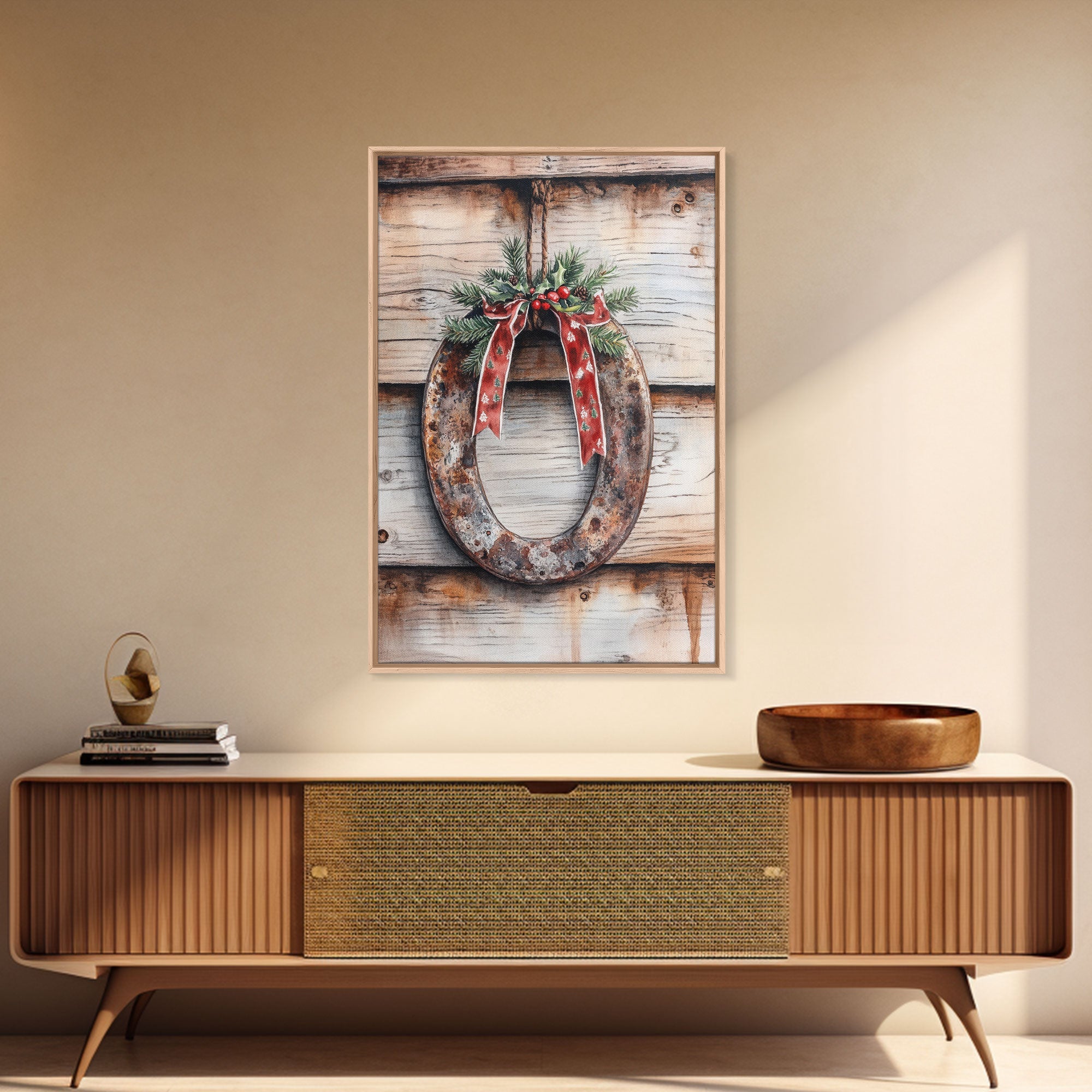 Christmas Horseshoe Framed Canvas Print, Horse Shoe With Mistletoe, Wood Framed Christmas Art, Western Decor, Boho Christmas, Minimalist