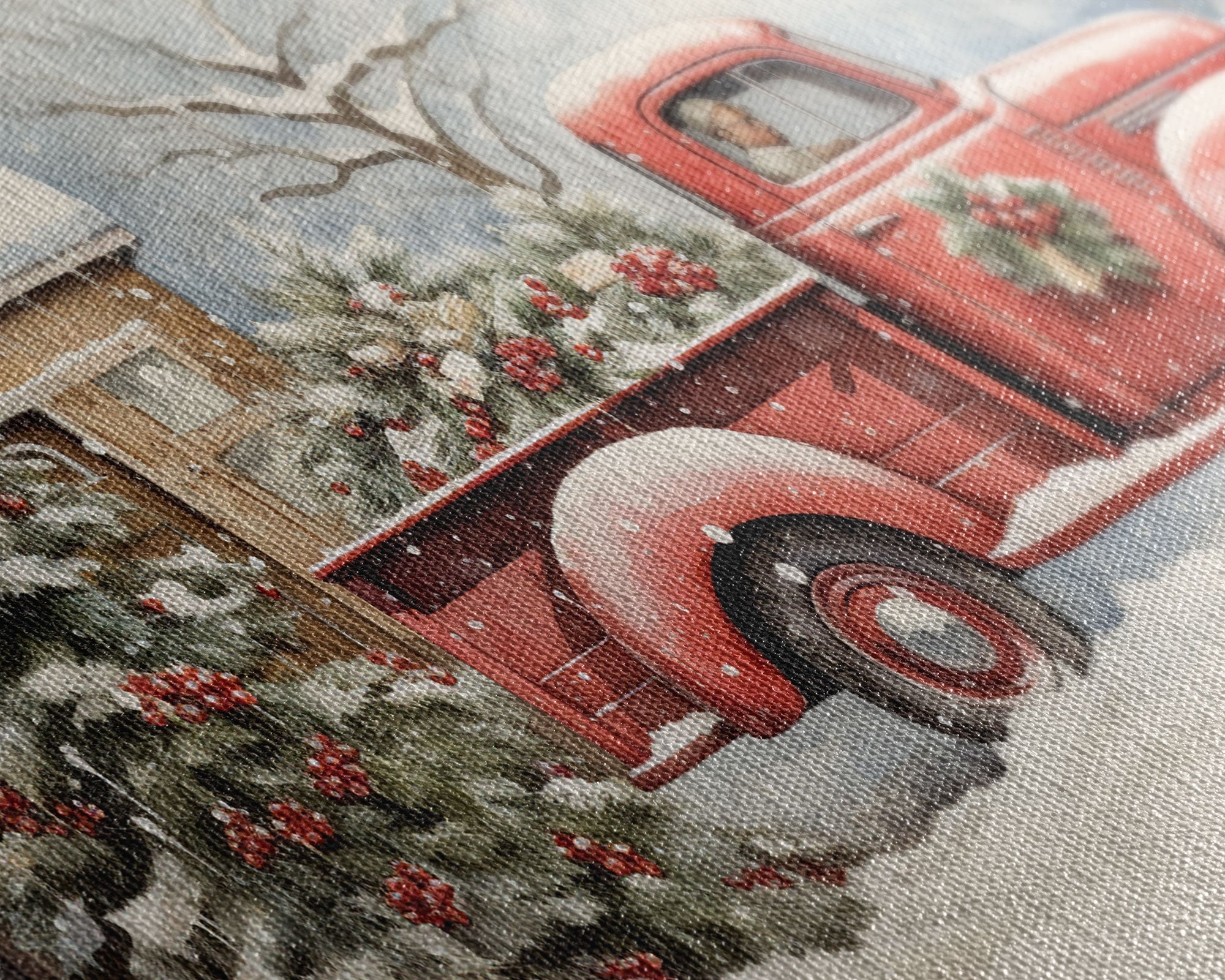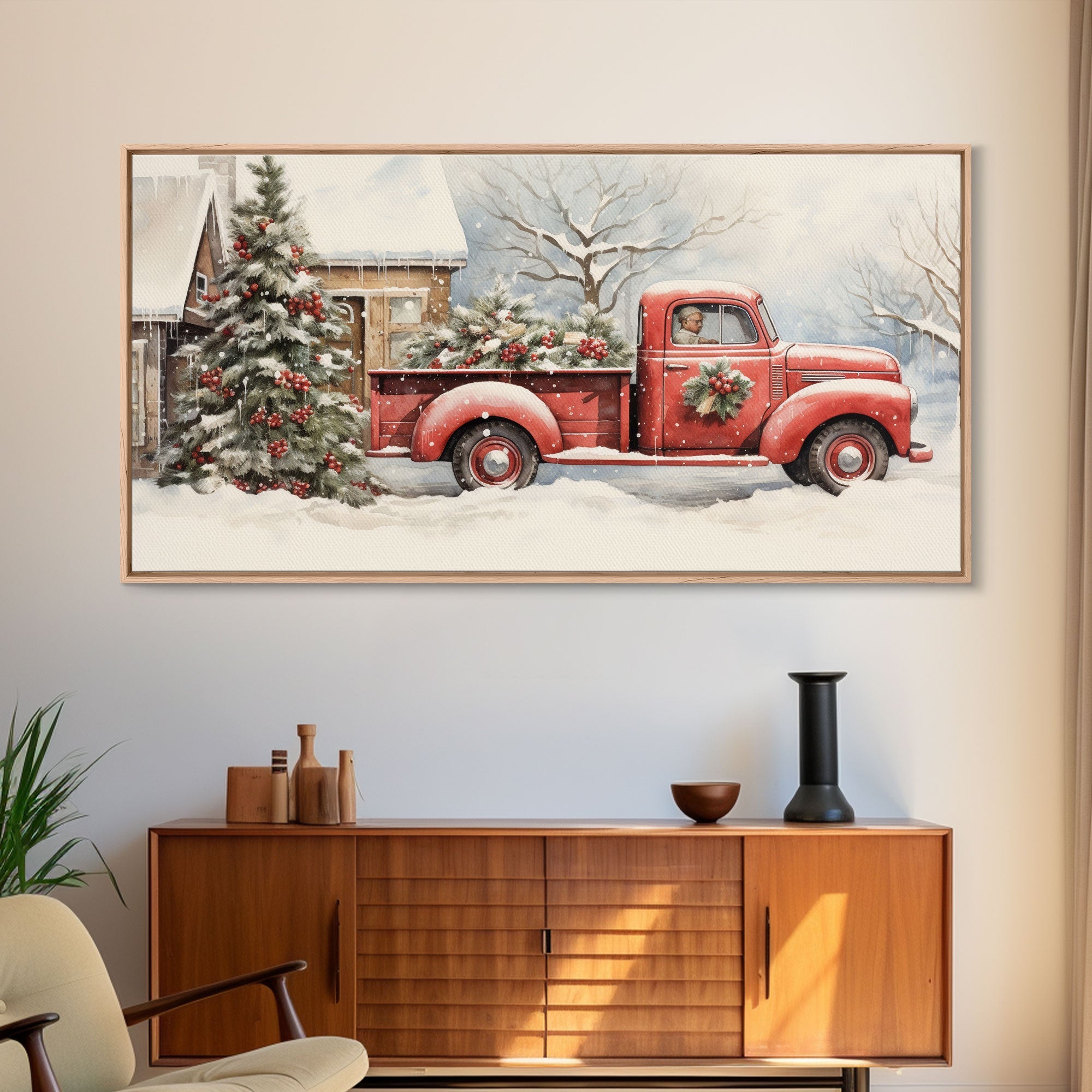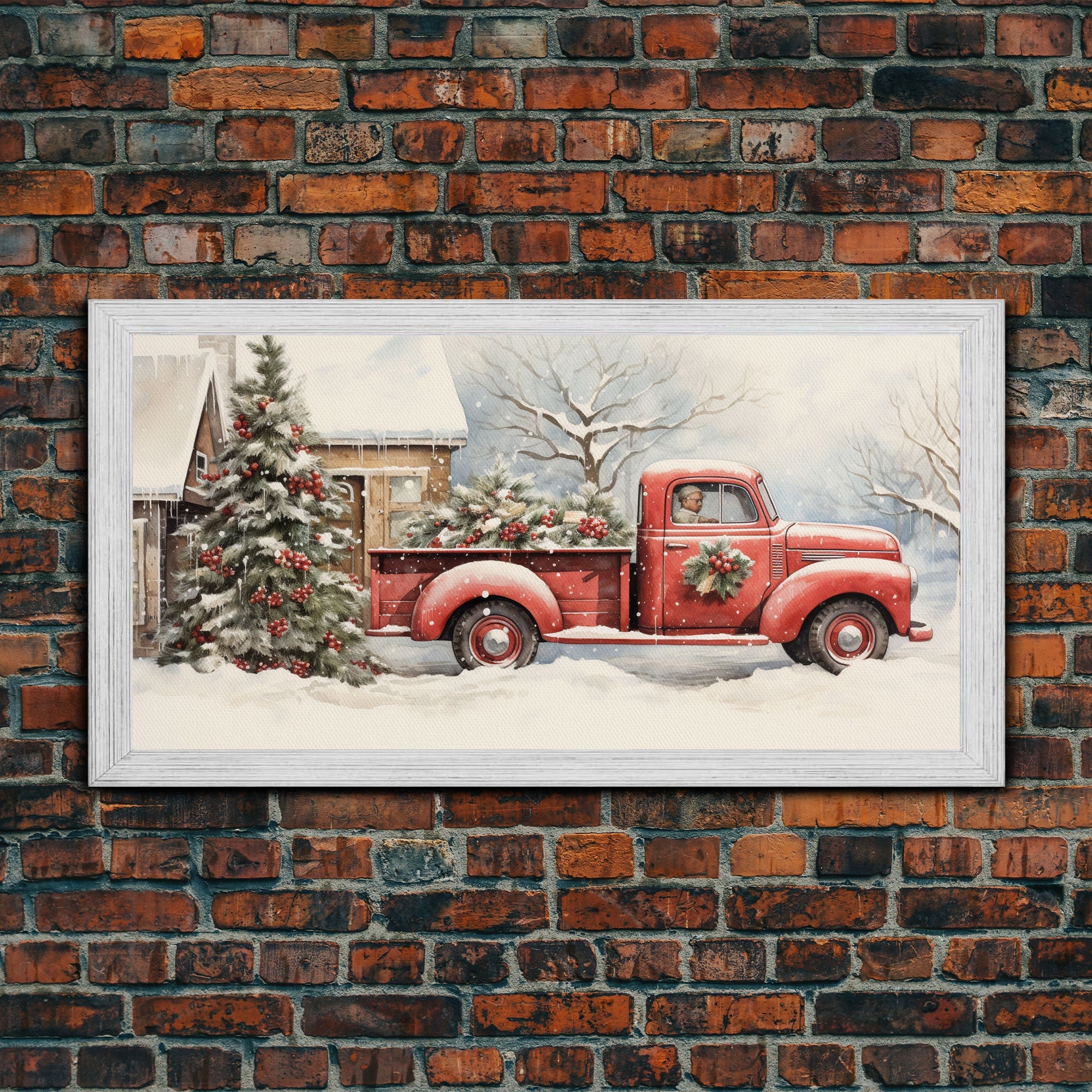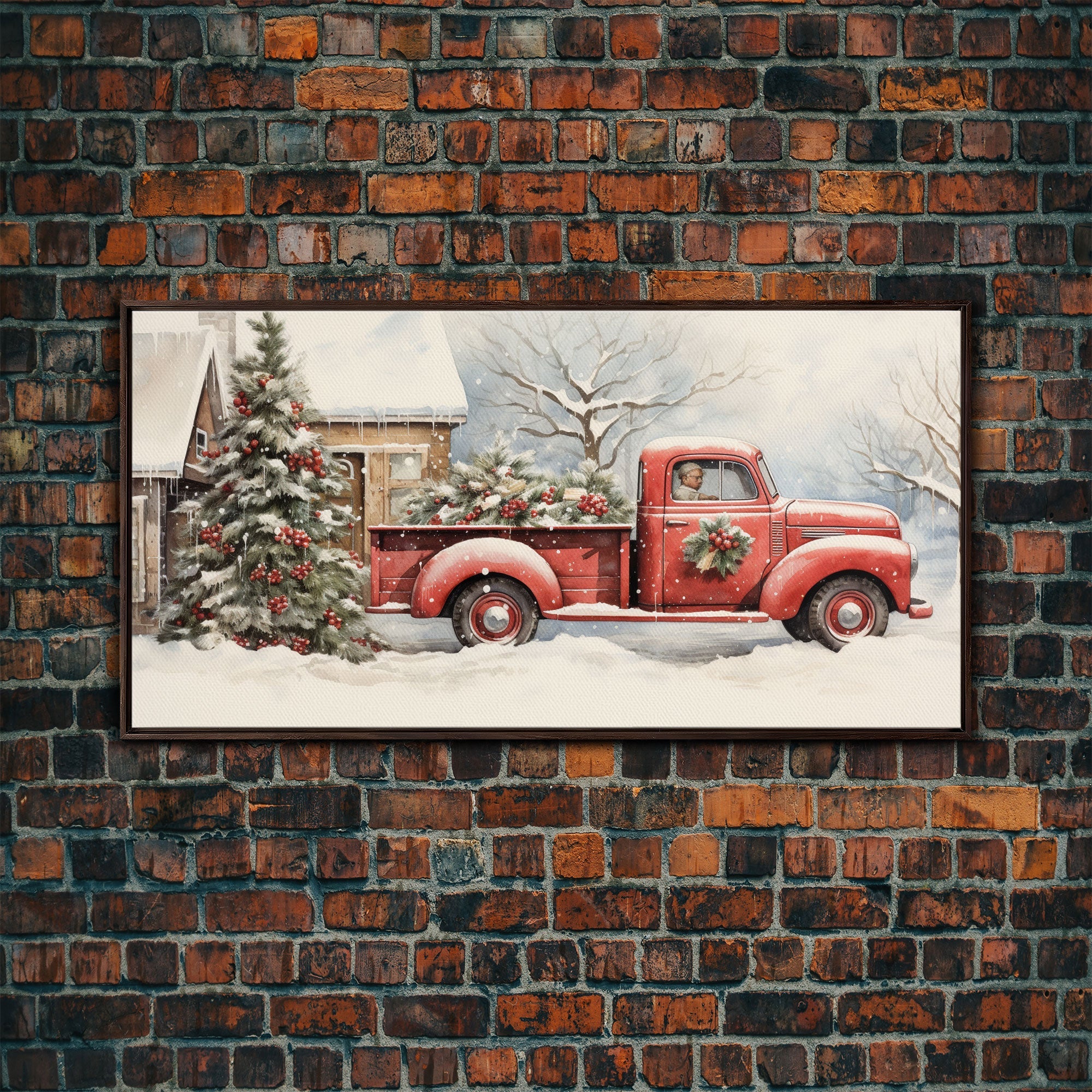Christmas Tree Delivery - Retro Farmhouse Christmas Decor - Old Red Truck Delivering Christmas Trees - Framed Canvas Print - Holiday Decor