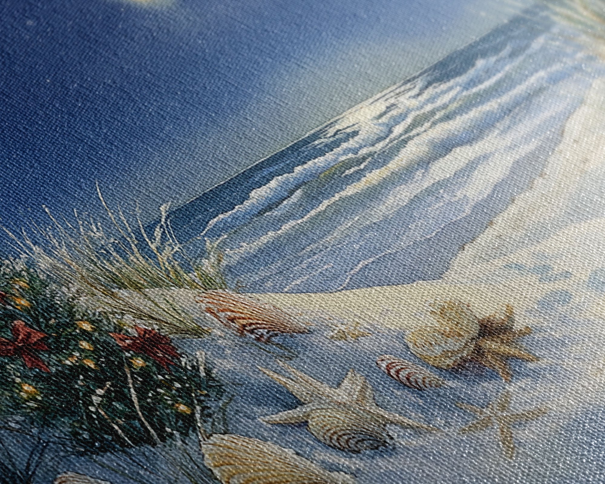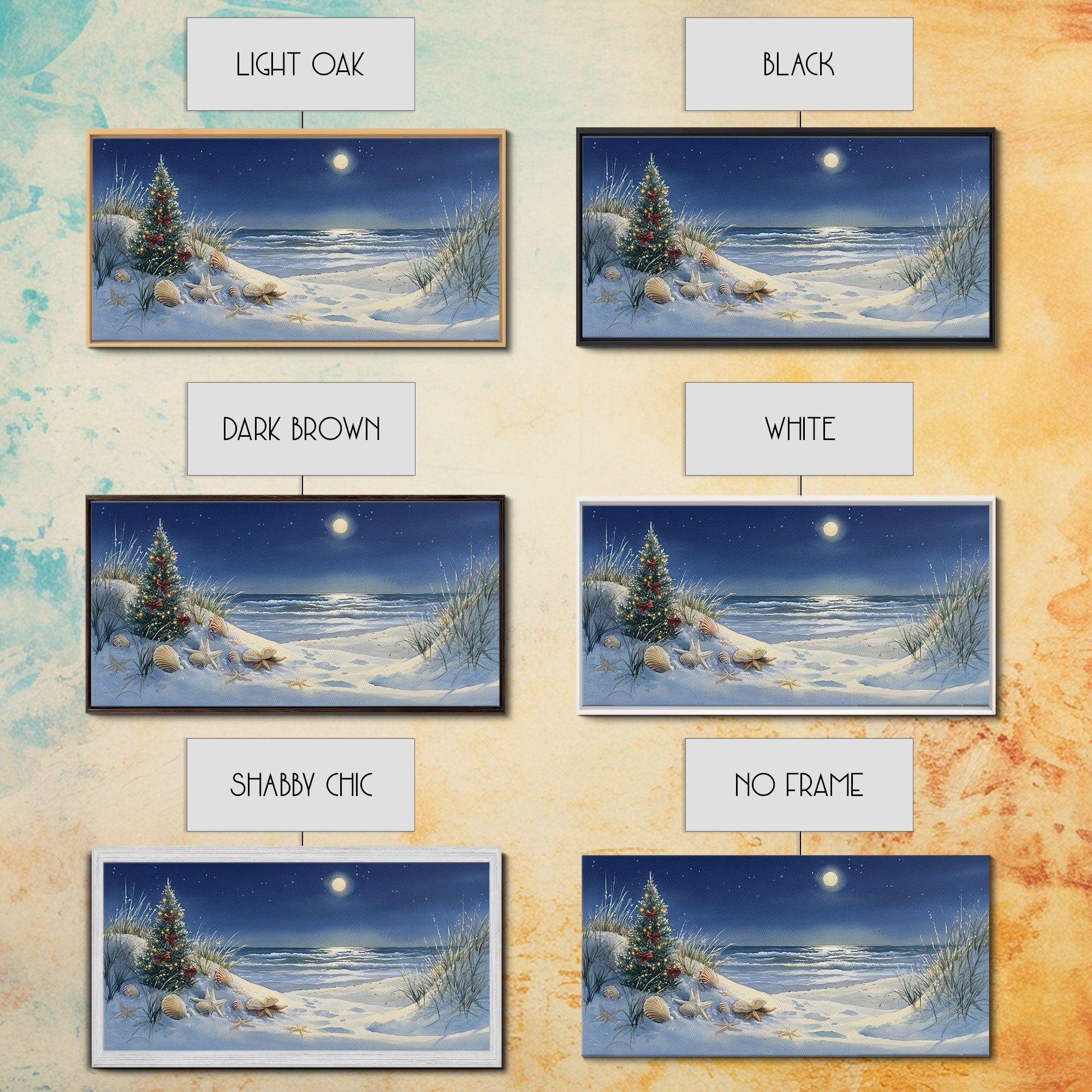 Christmas Tree on Snowy Beach with Full Moon, Framed Canvas Print, Coastal Christmas Art, Nautical Holiday Decor, Winter Wonderland, Beach
