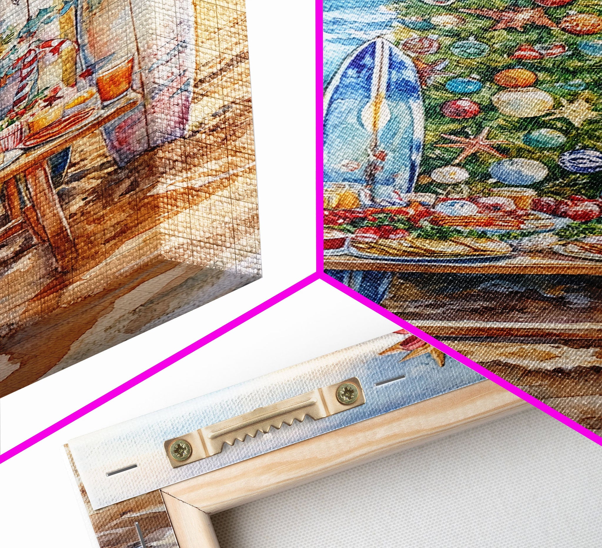 • Cargar imagen en el visor de la galería, Christmas tree with surfboards on the beach, Framed Canvas Print tropical holiday wall art perfect beach Christmas decor holiday gift idea