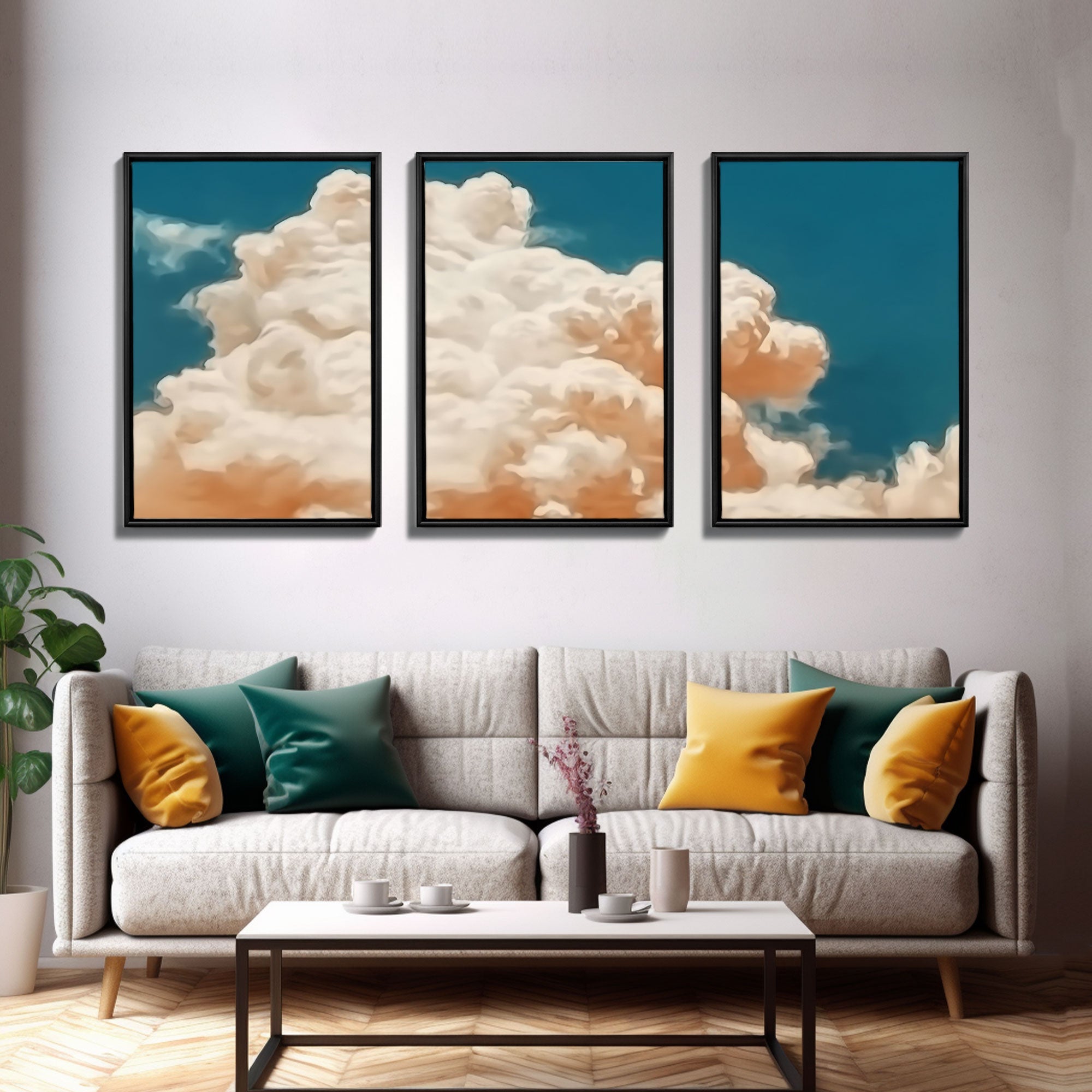 Clouds On Canvas, Framed Wall Art Set of 3 Pastel Cloud Navy Blue Sky Nature Landscape Prints Minimalist Modern Art Nature Wall Decor