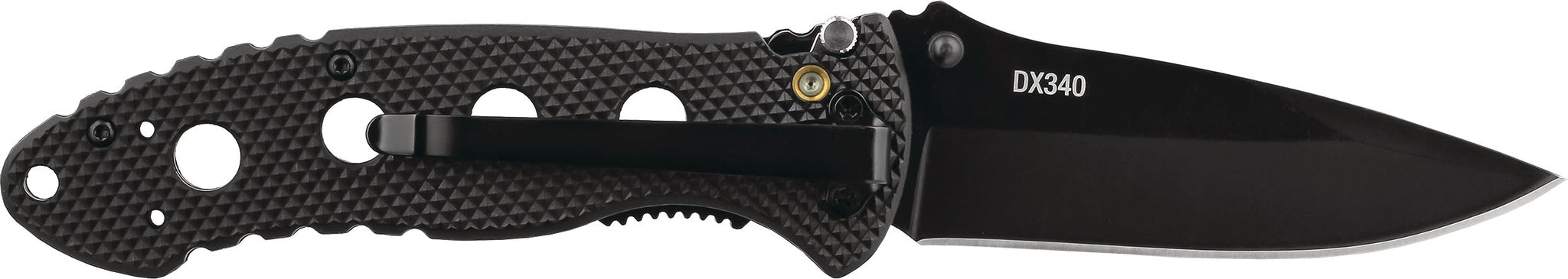 The DX340 Knife comes with a checkered fiberglass-filled nylon handle and thumb notches on top of the blade for a secure grip. Utilizing our Double Lock technology, anyone can work with confidence knowing that the added safety prevents the knife from accidentally closing. It easily opens with one hand using thumb studs on the blade, and you can adjust the 3-position pocket clip to adapt to your carrying style.