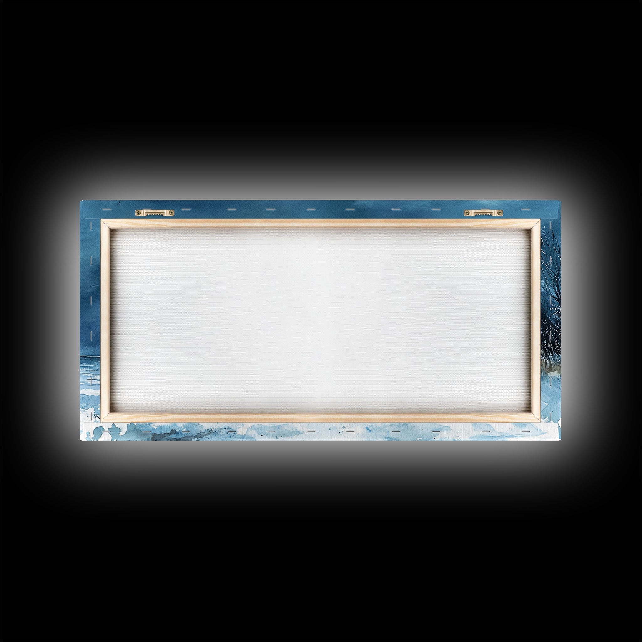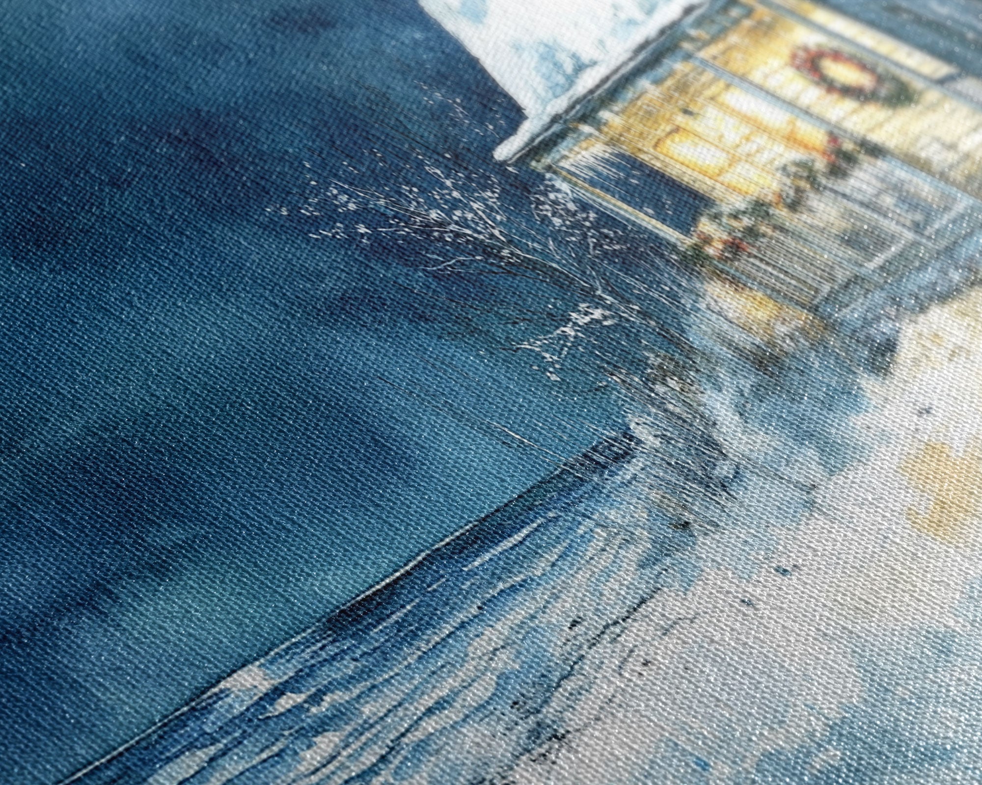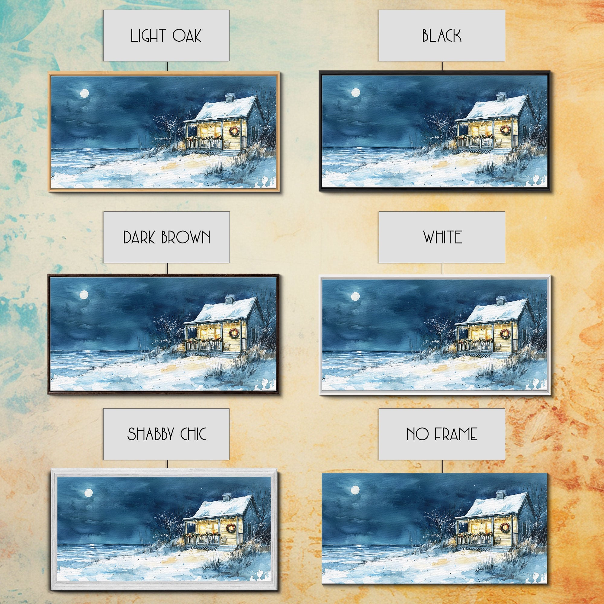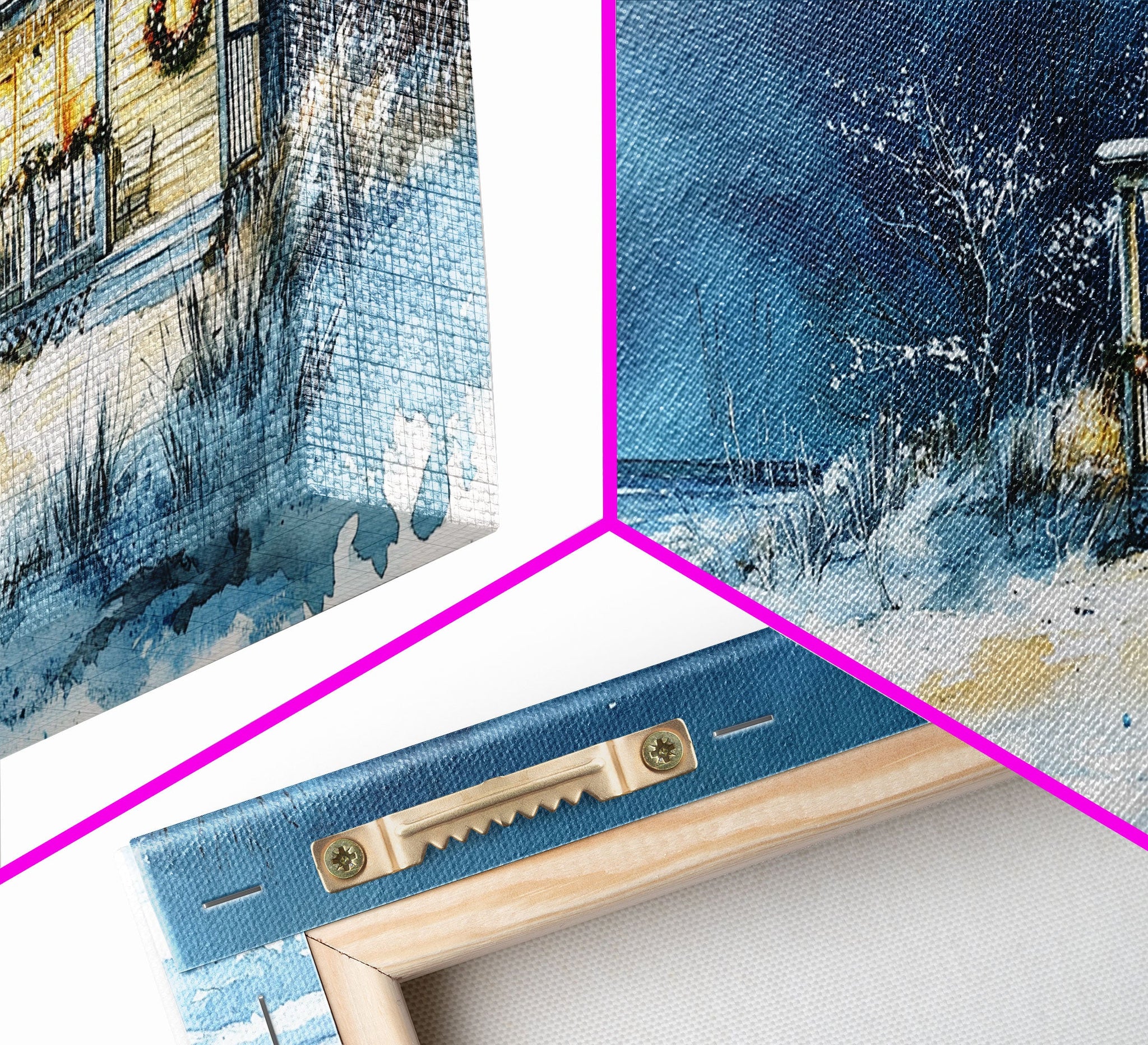 Coastal Christmas cabin decor, winter beach house art, snowy holiday seaside print, cozy Christmas wall art, framed canvas print