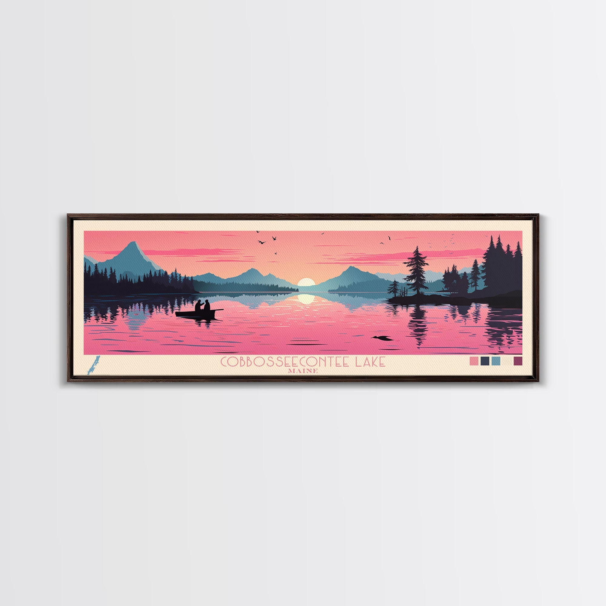 Cobbosseecontee Lake Maine Framed Canvas Print, Midcentury Modern Panoramic Wall Art, Living Room Decor, Pop Art, Travel Poster Art, Scenic Nature Painting, Lake House Decor