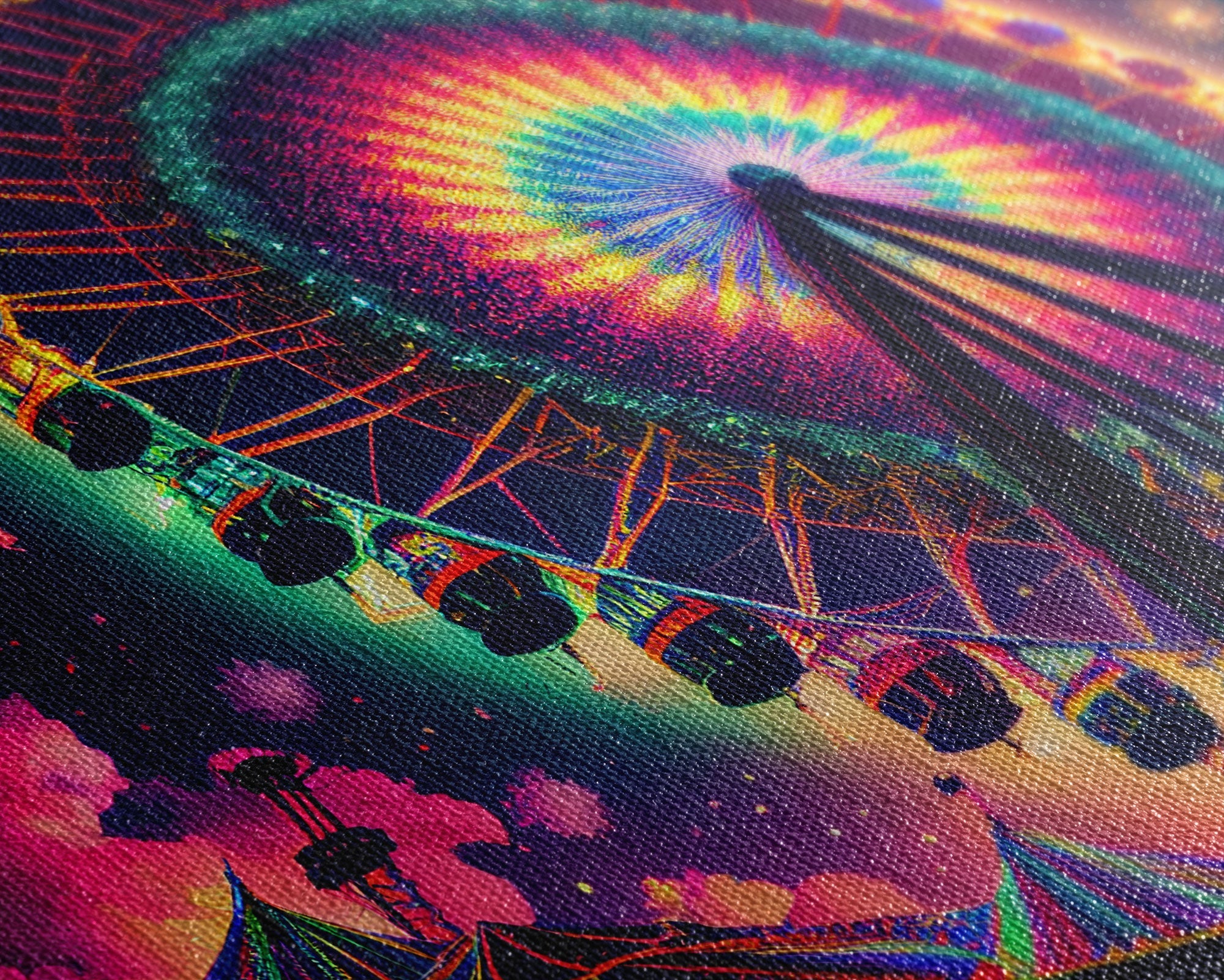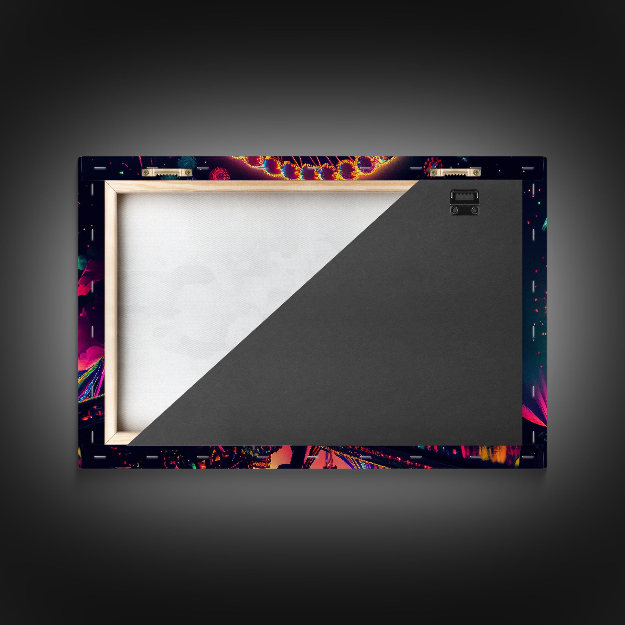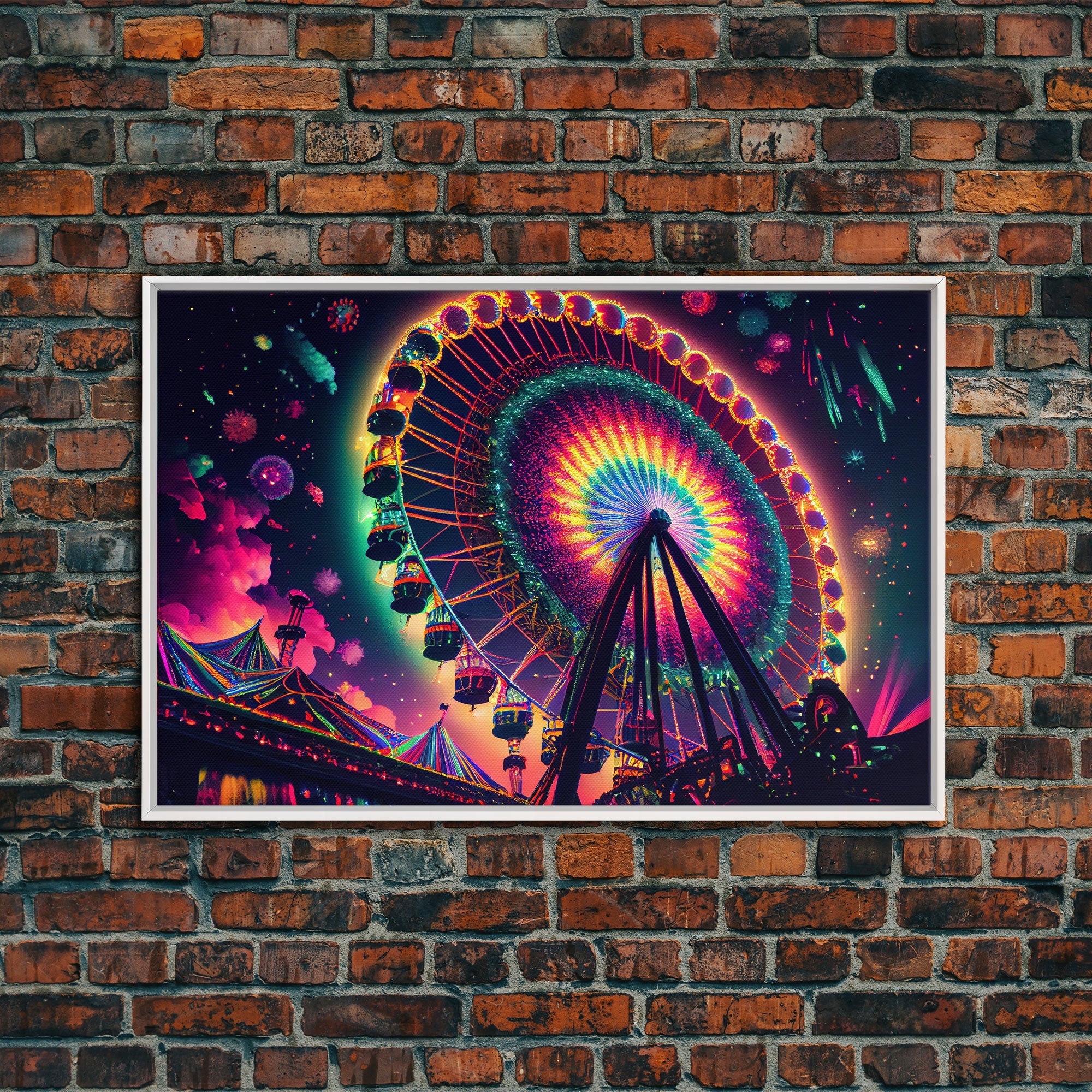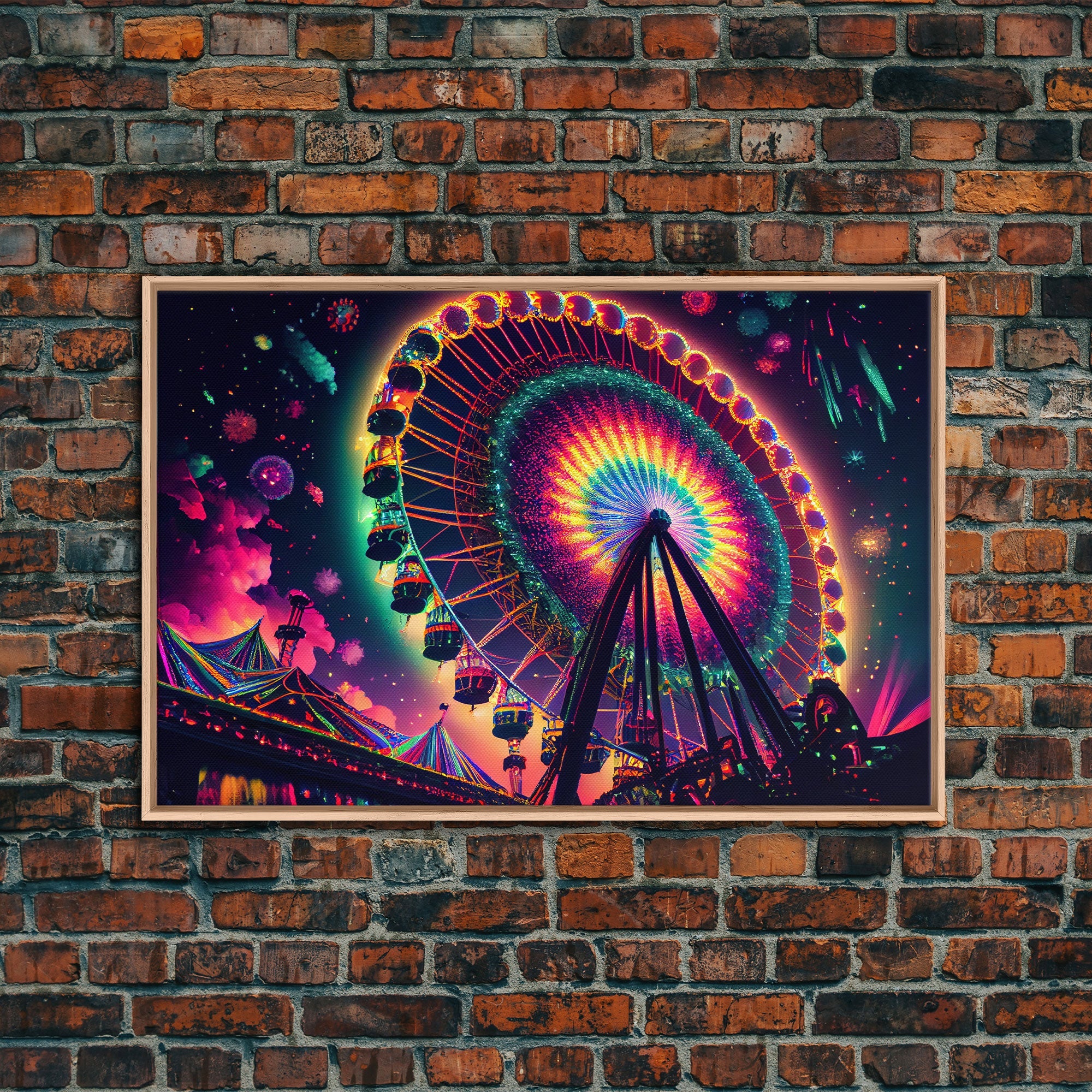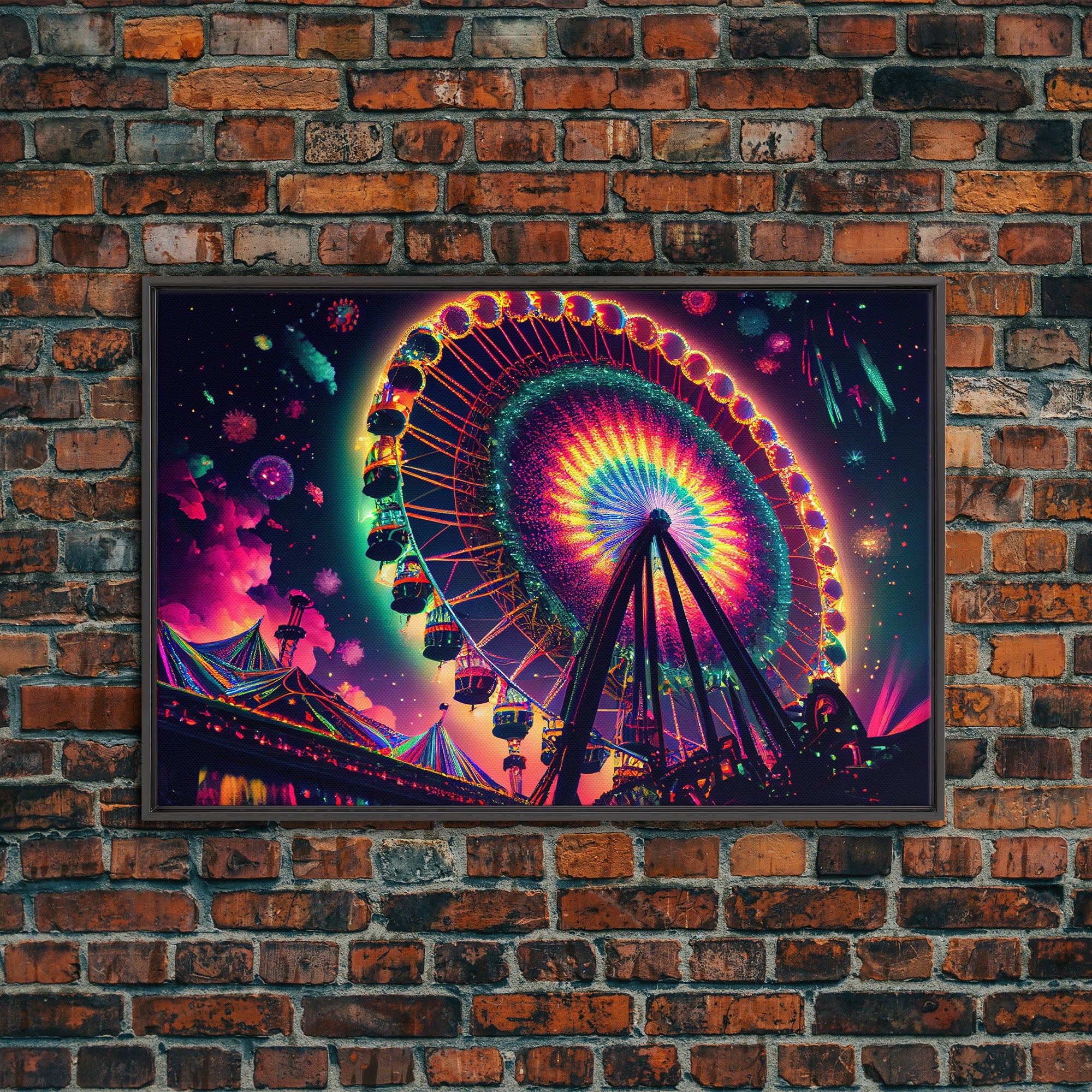 Colorful boardwalk art, neon lit night time ferris wheel, framed canvas print, framed wall art