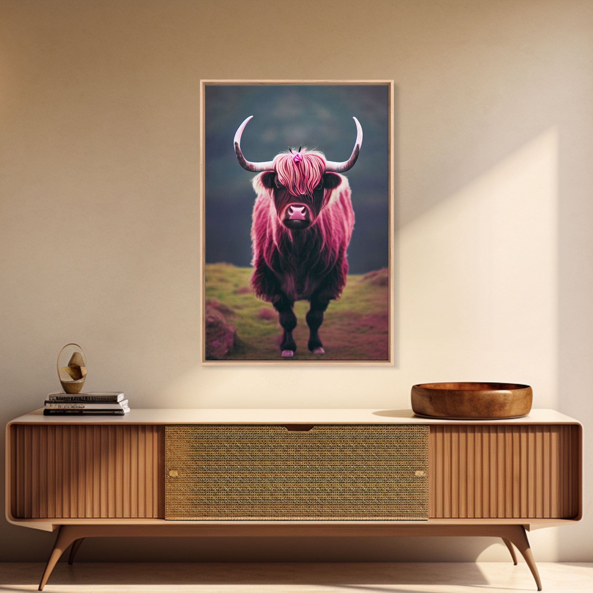 Colorful farmhouse art, Highland cow, Scotland cattle, framed canvas print, pink cow
