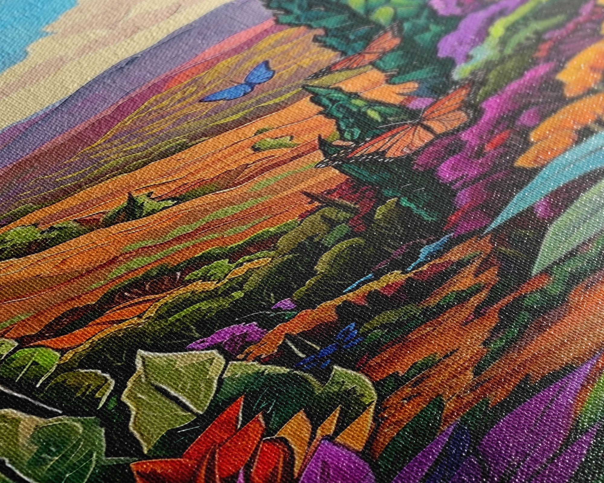 Colorful Landscape Art, Mountain Wall Art Print, Botanical Art for Kitchen, Impasto Canvas Painting Framed and Printed, Modern Wall Art