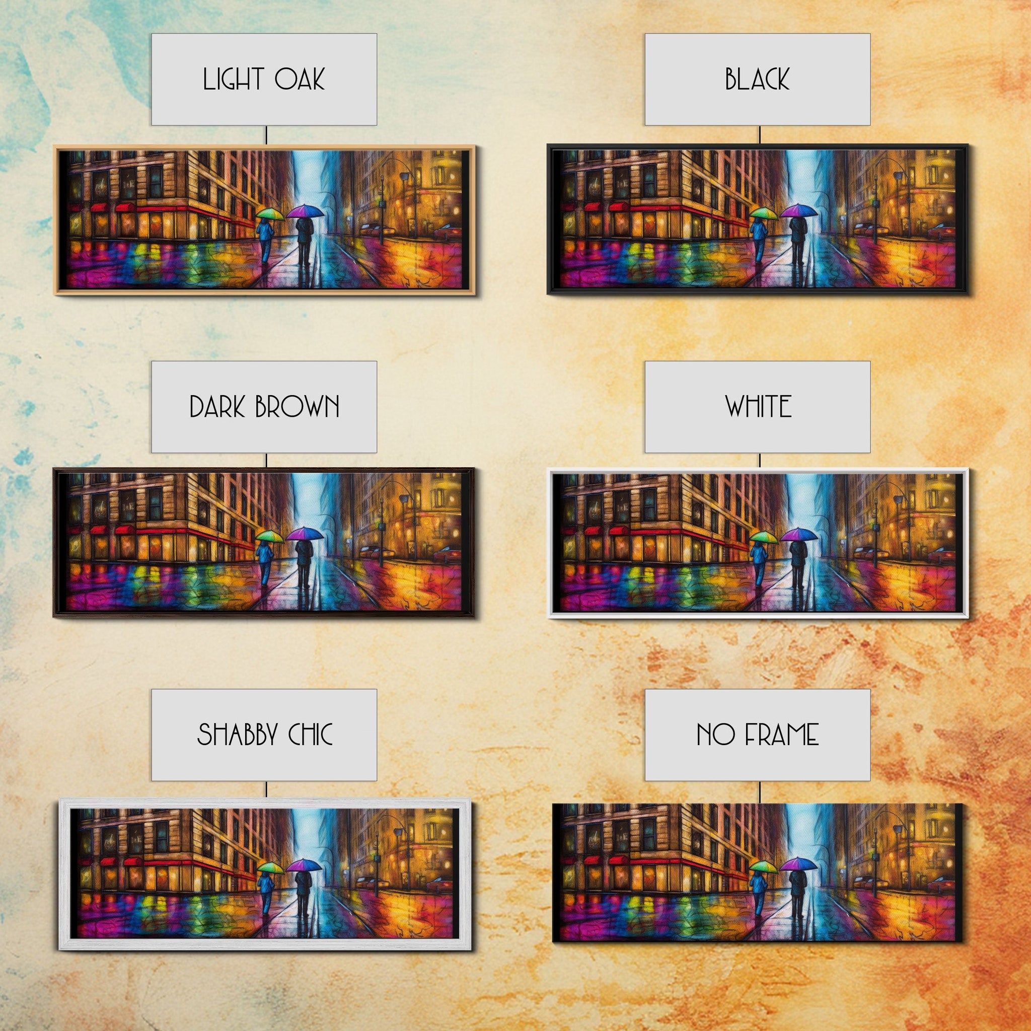Colorful Umbrellas City Canvas Print, Large Urban Art Print, Two People Walking On Street, Vibrant Art, Panoramic, Wall Art, Canvas Print