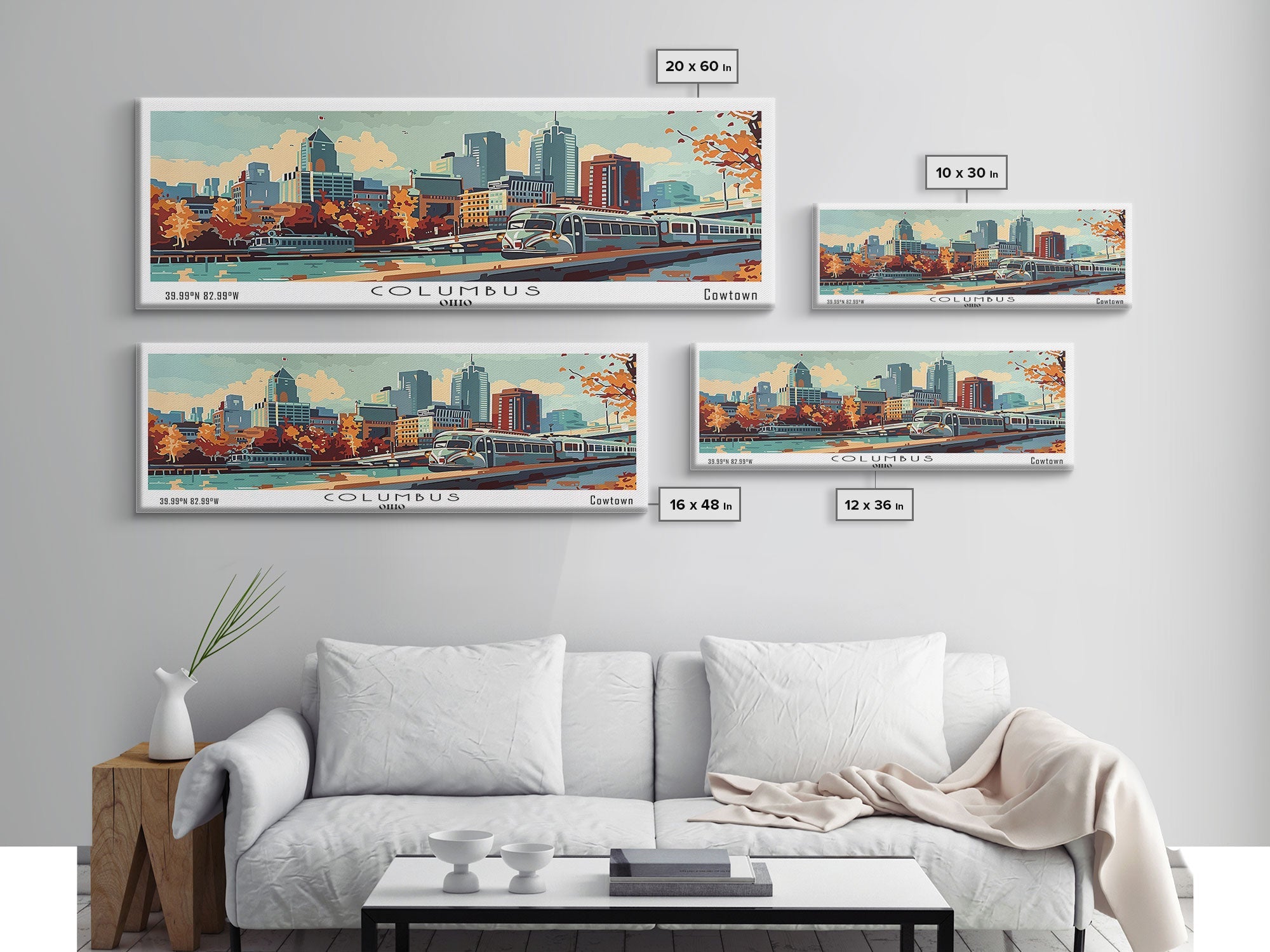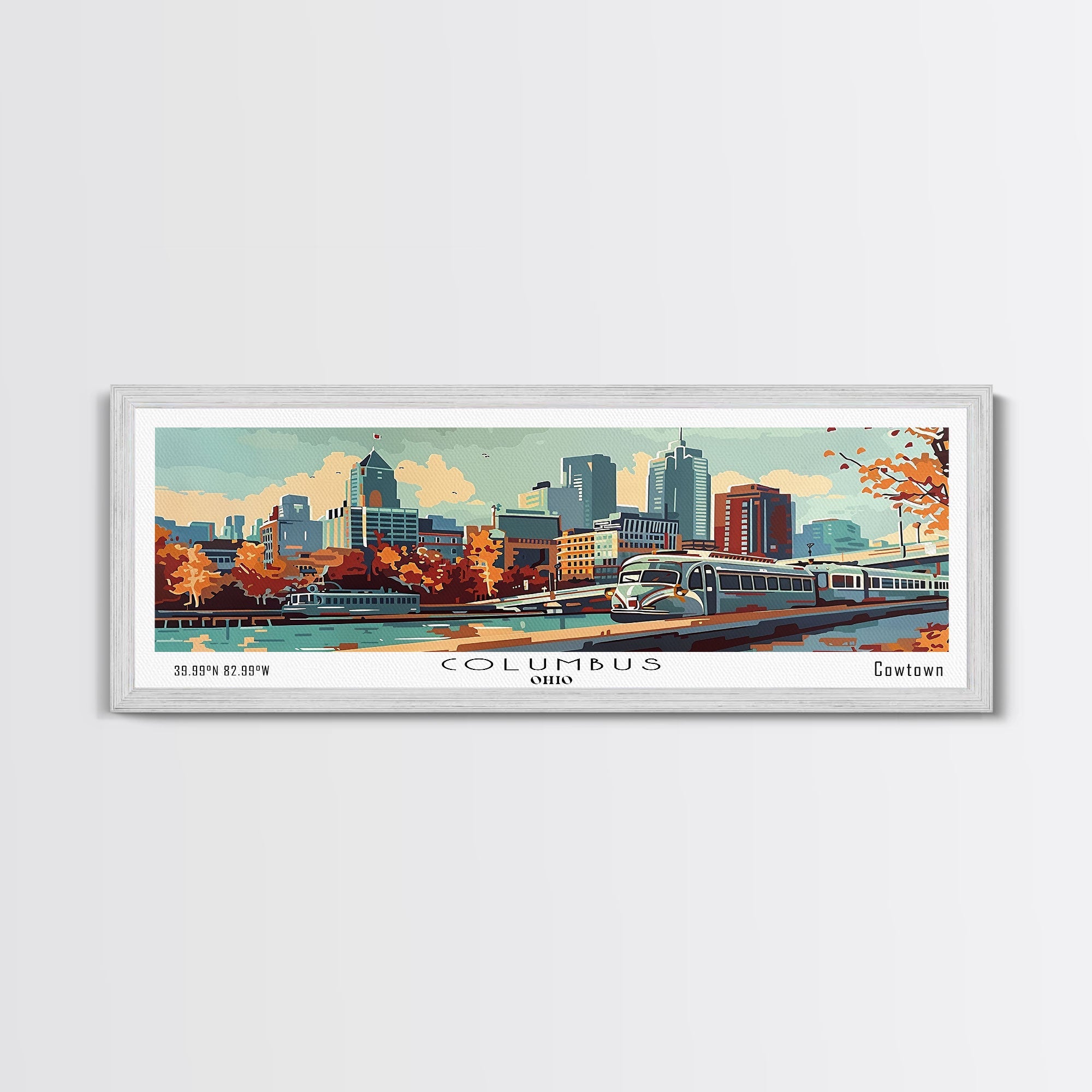 Columbus Ohio Panoramic Painting, Mid Century Modern Framed Canvas Print, Retro Pop Art Travel Poster, Wall Art, Home Decor, Office Art, Gift Idea