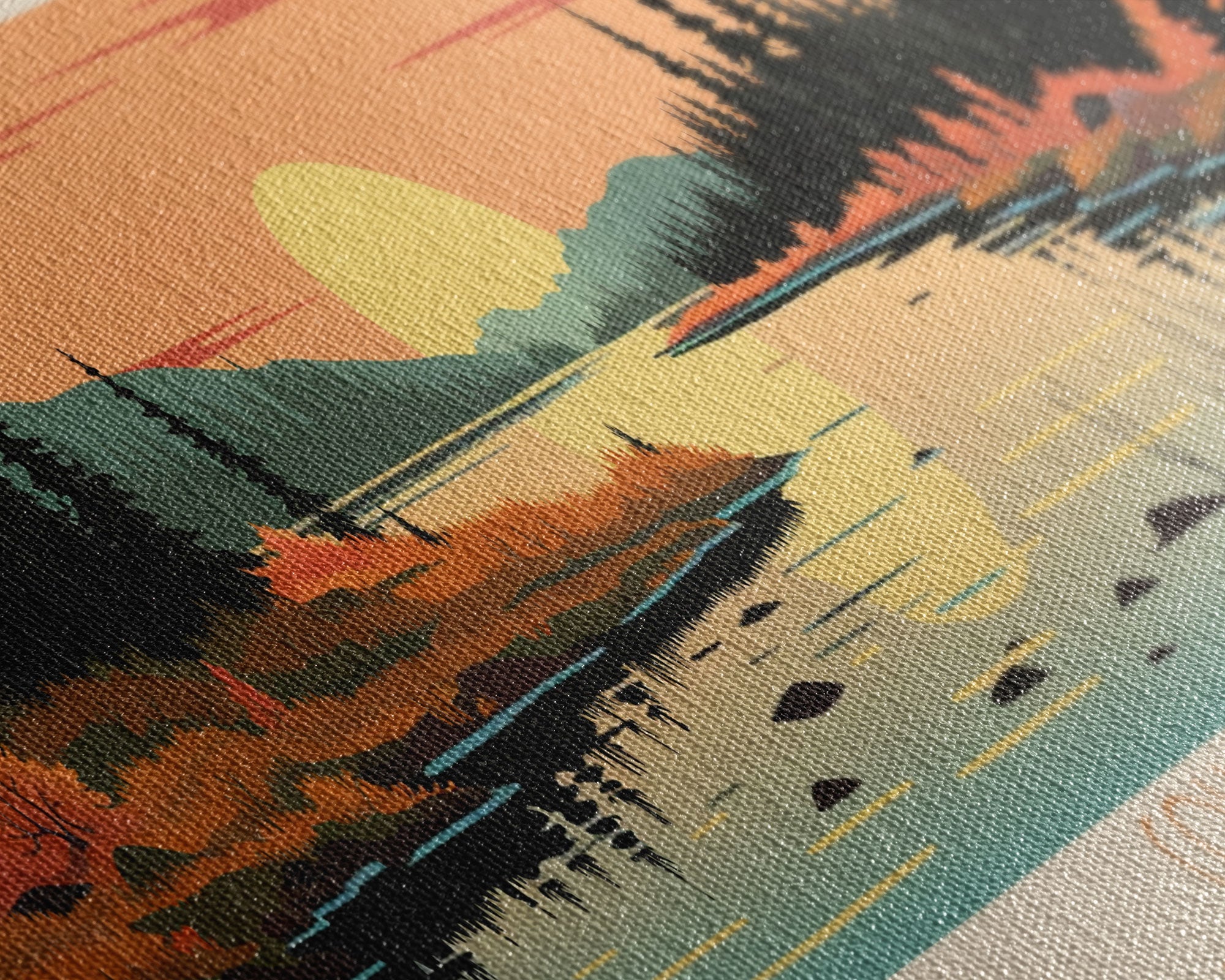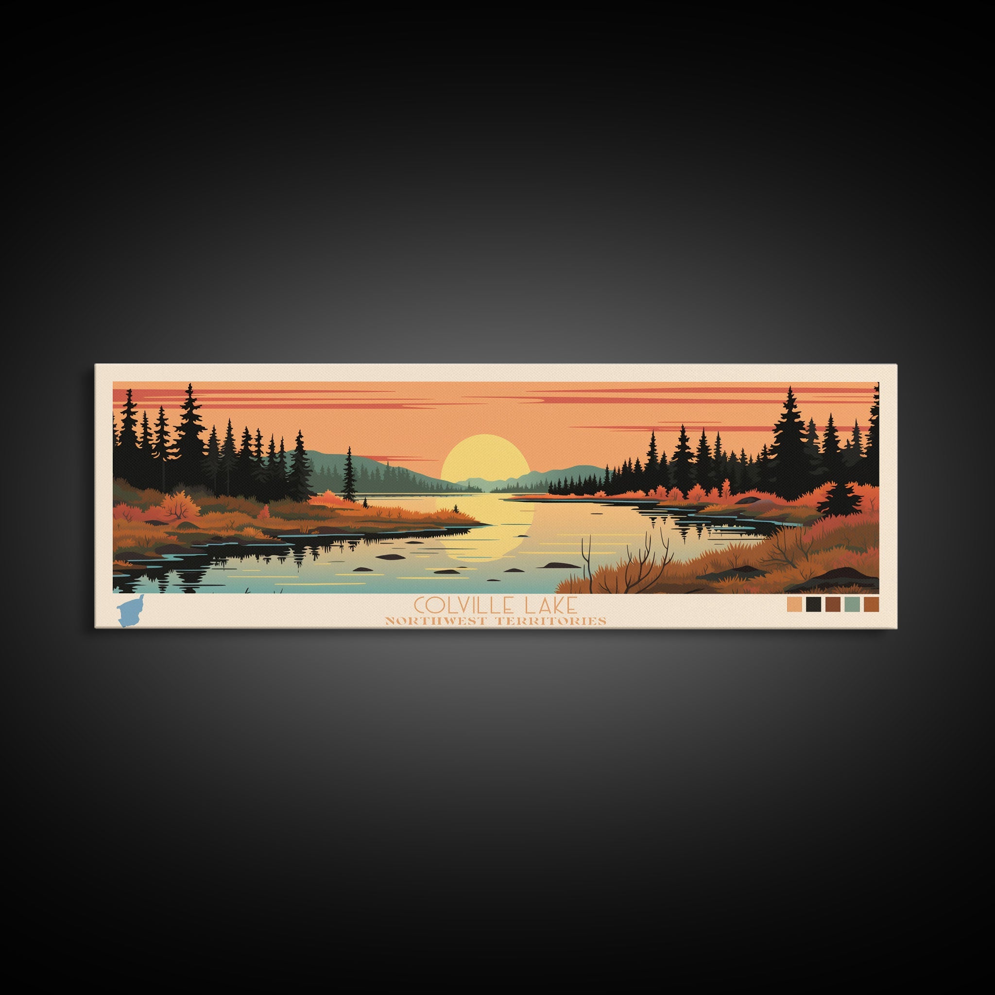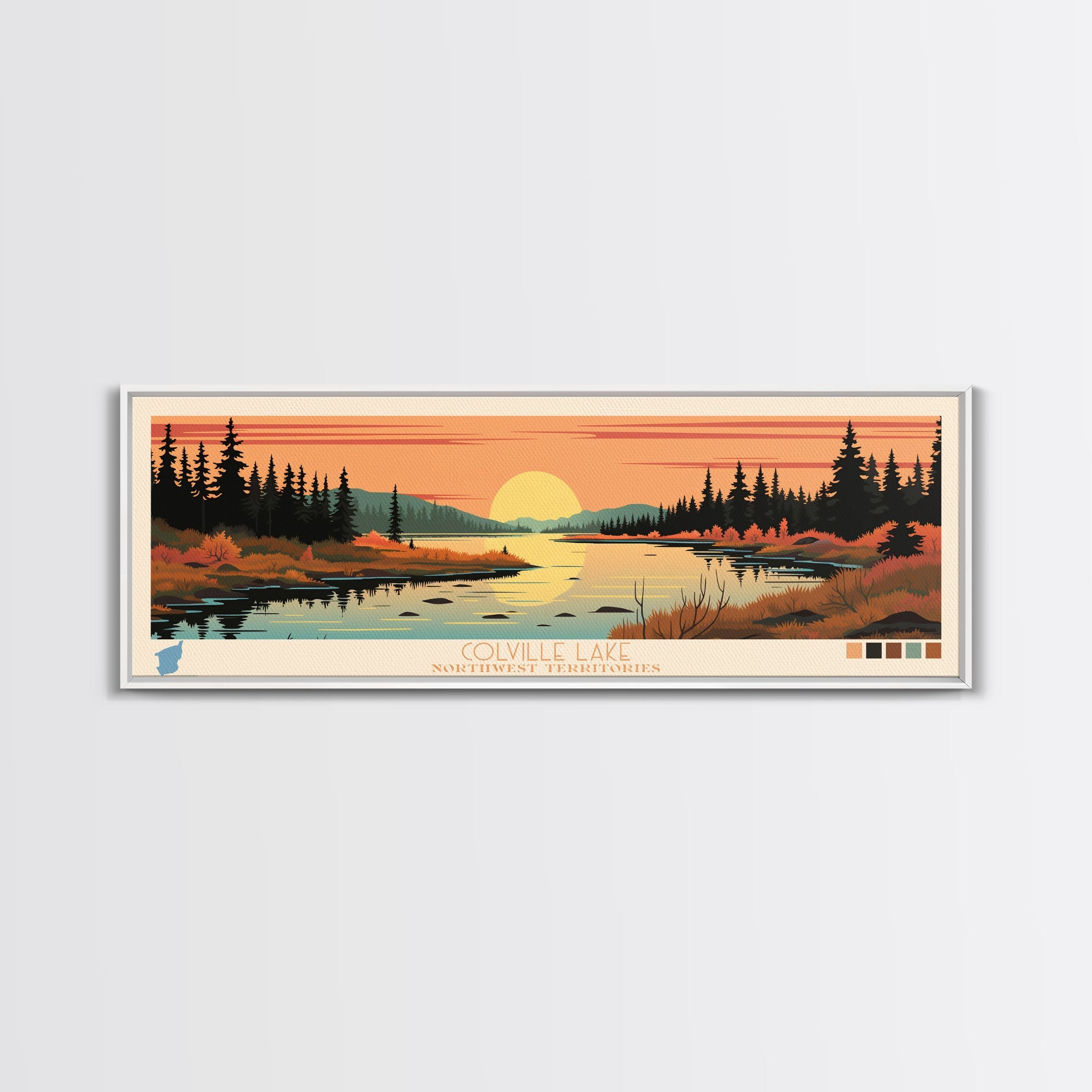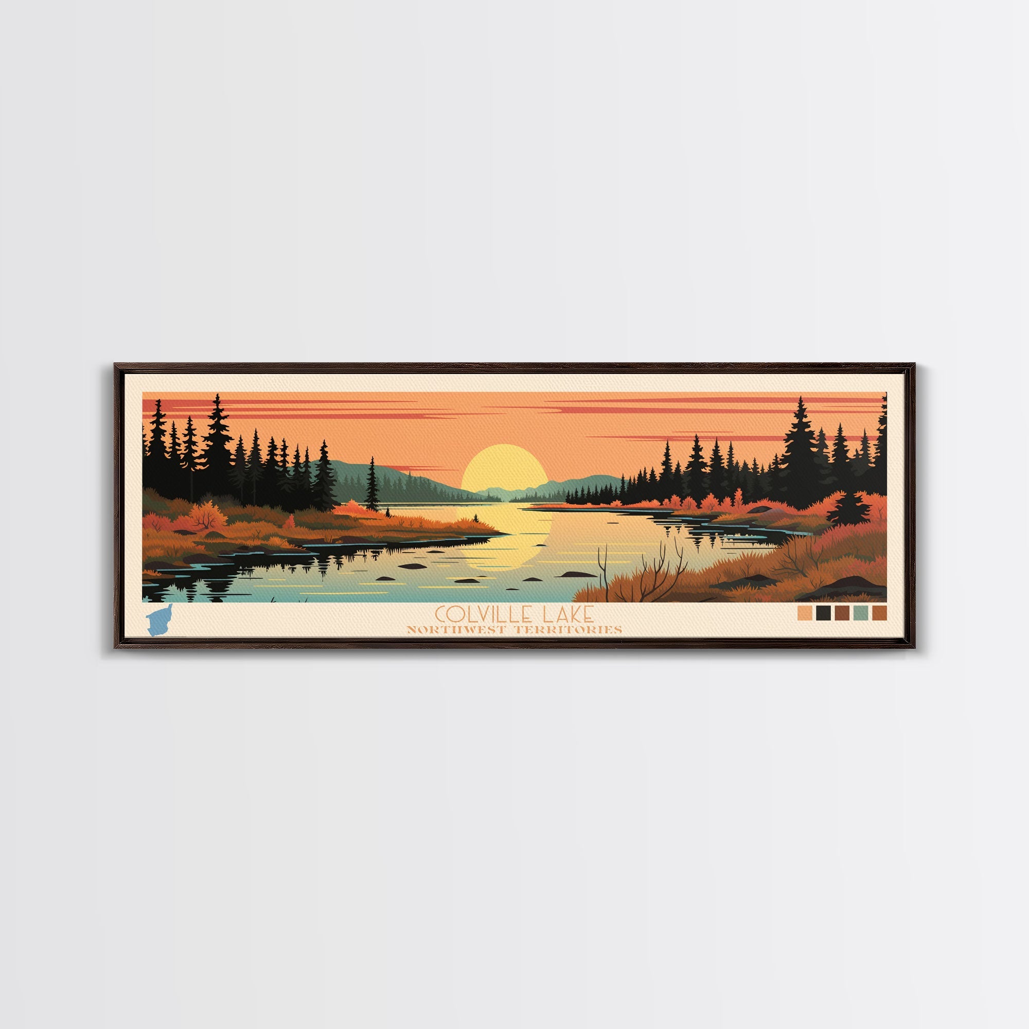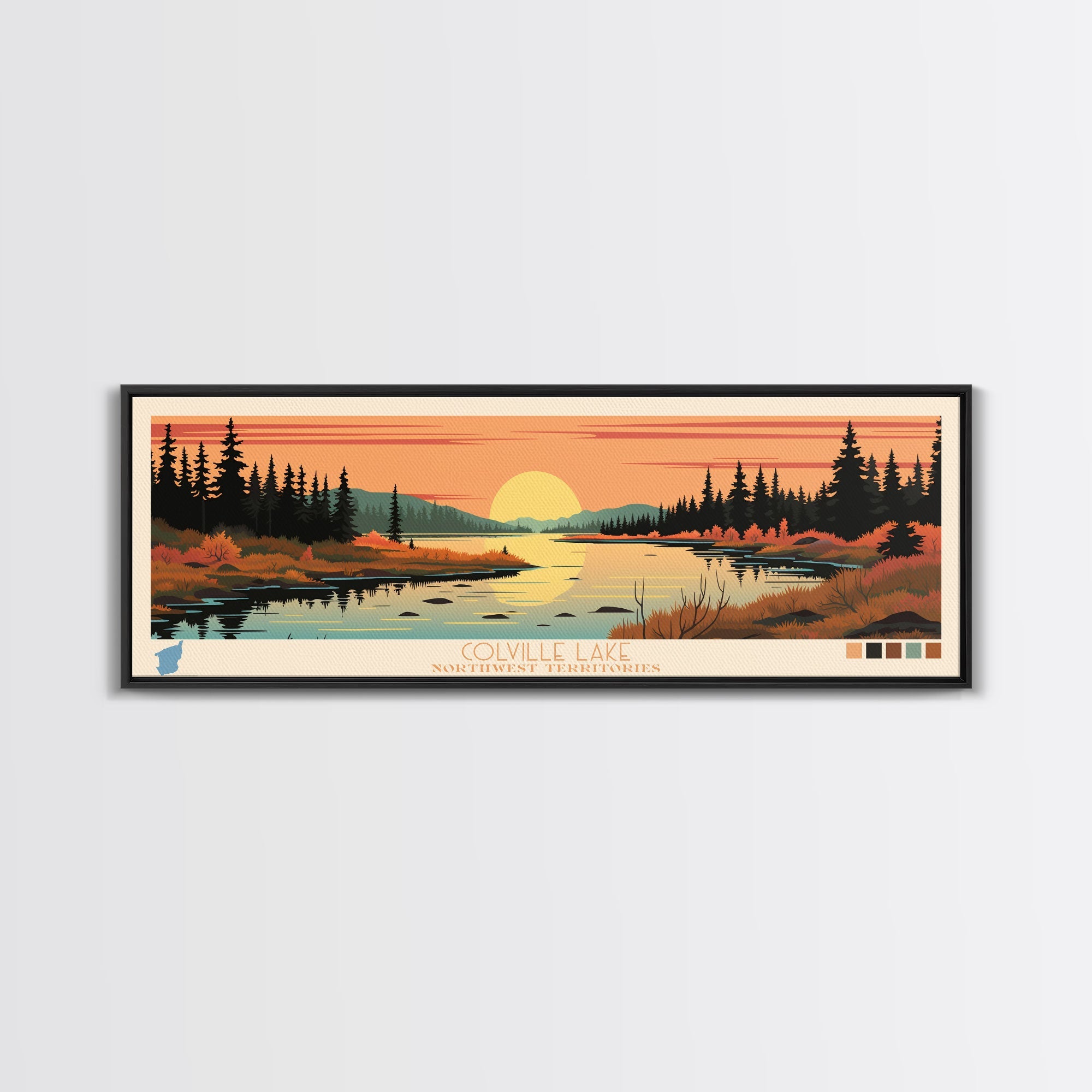 Colville Lake Northwest Territories Framed Canvas Print, Pop Art Panoramic Travel Poster, Bedroom Decor, Midcentury Modern, Wall Art, Scenic Lake House, Nature Art