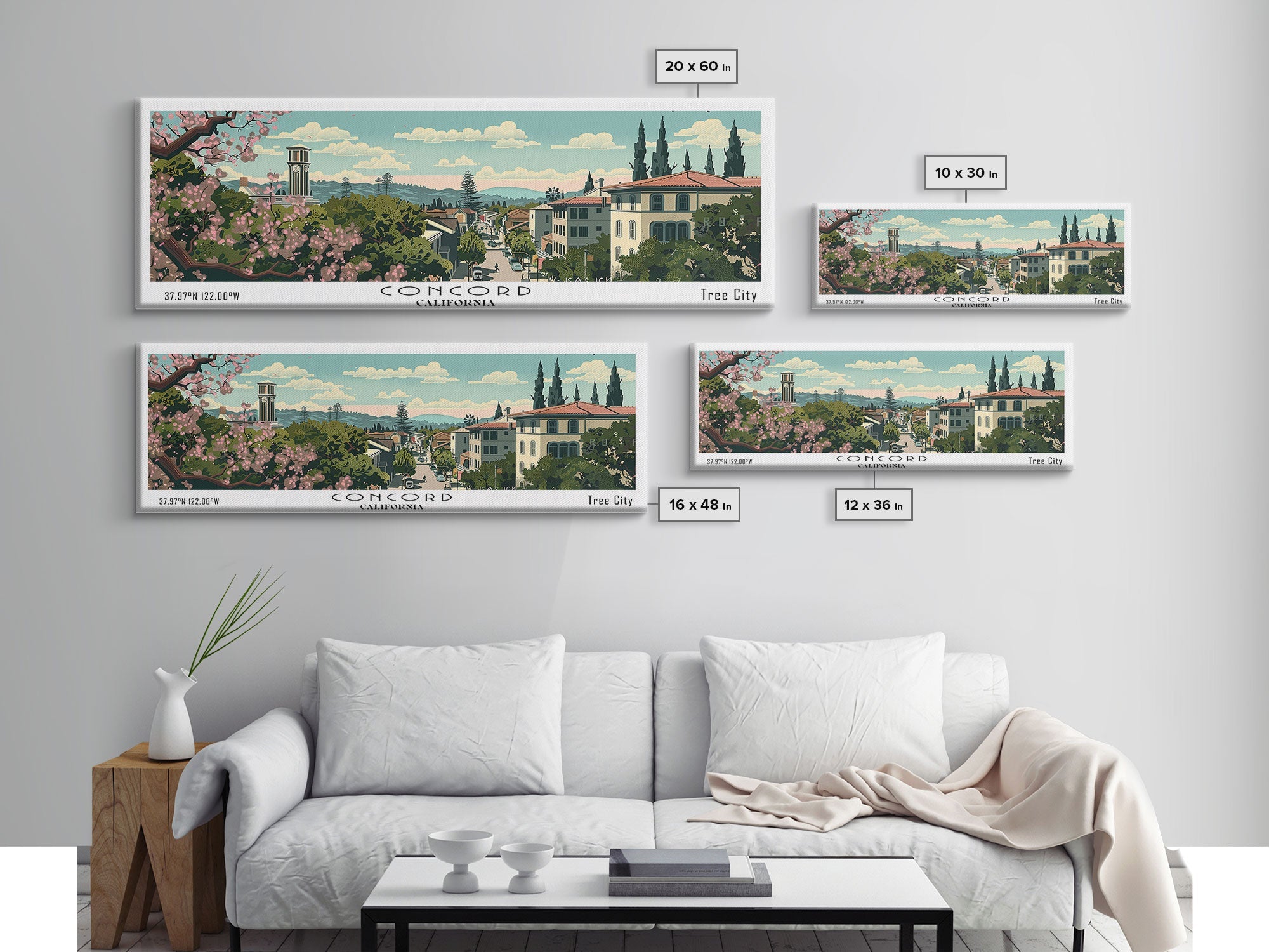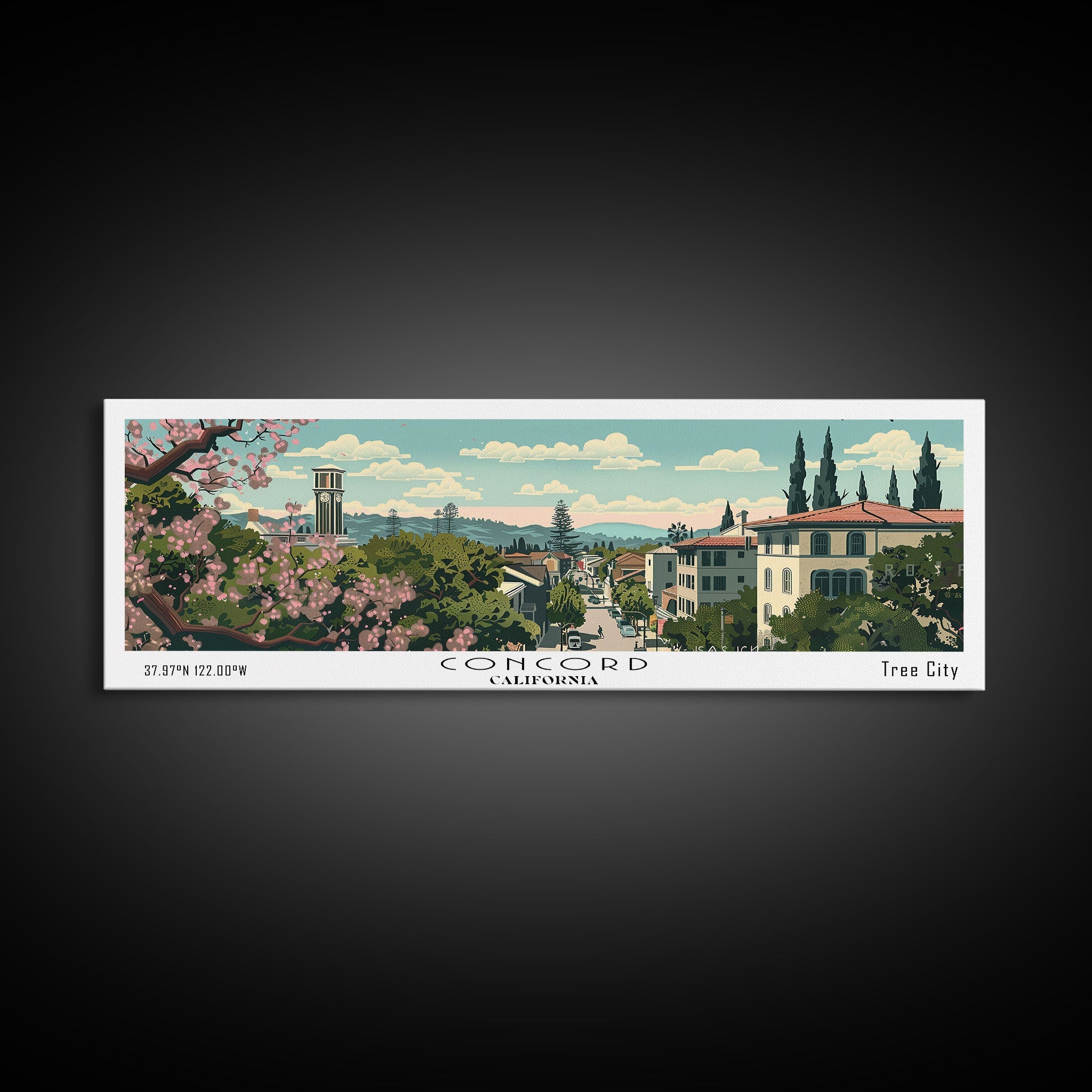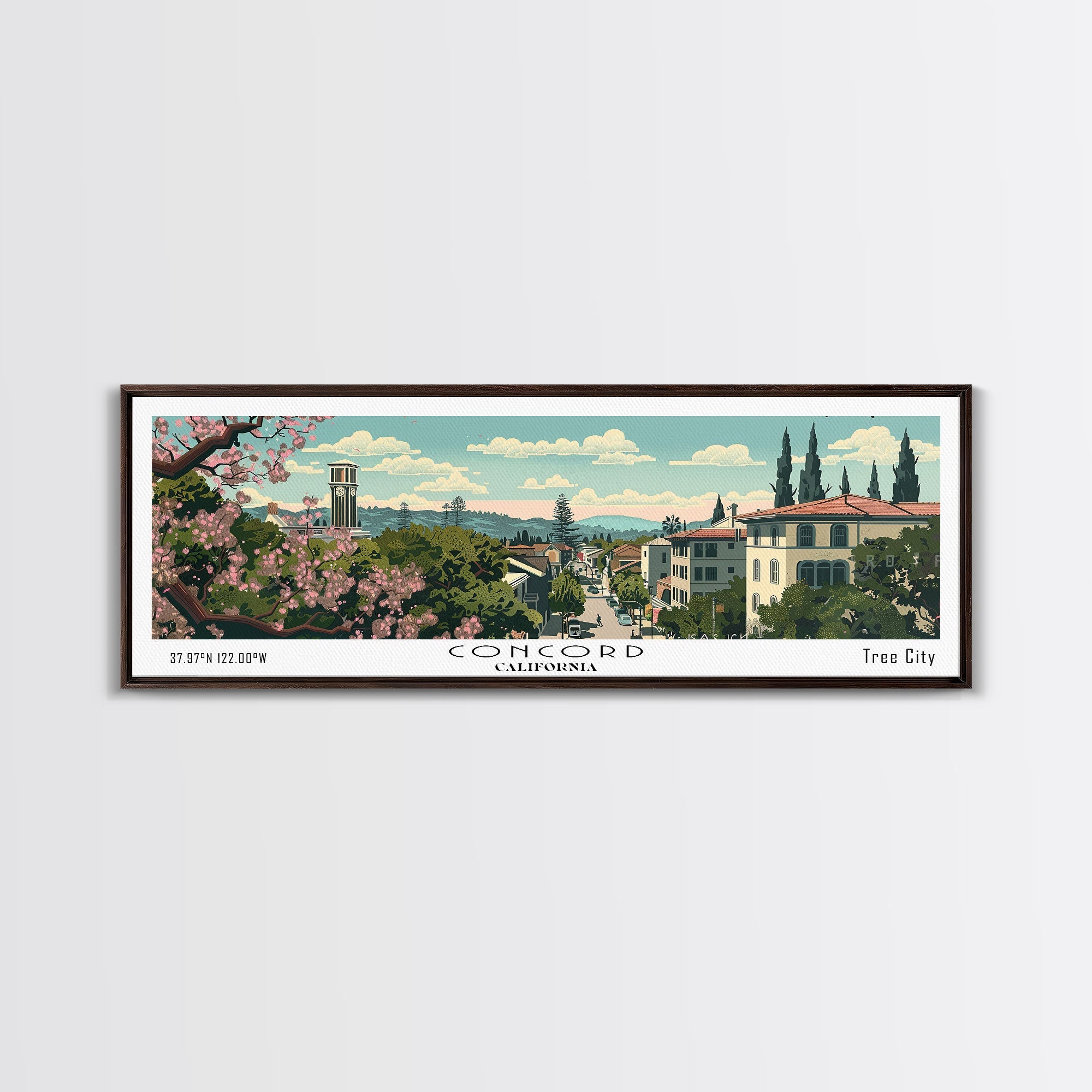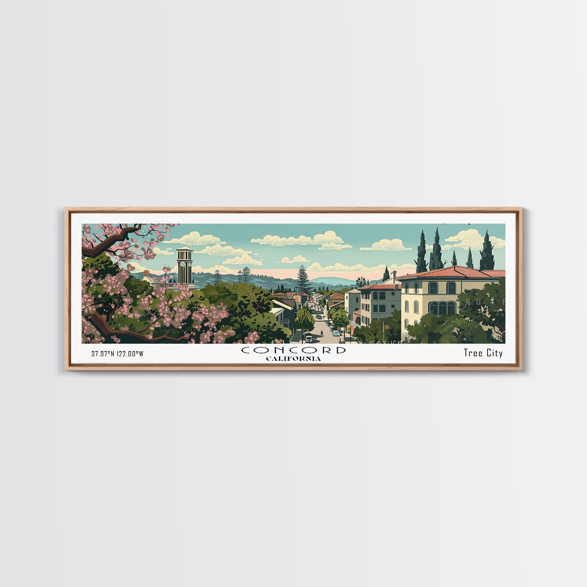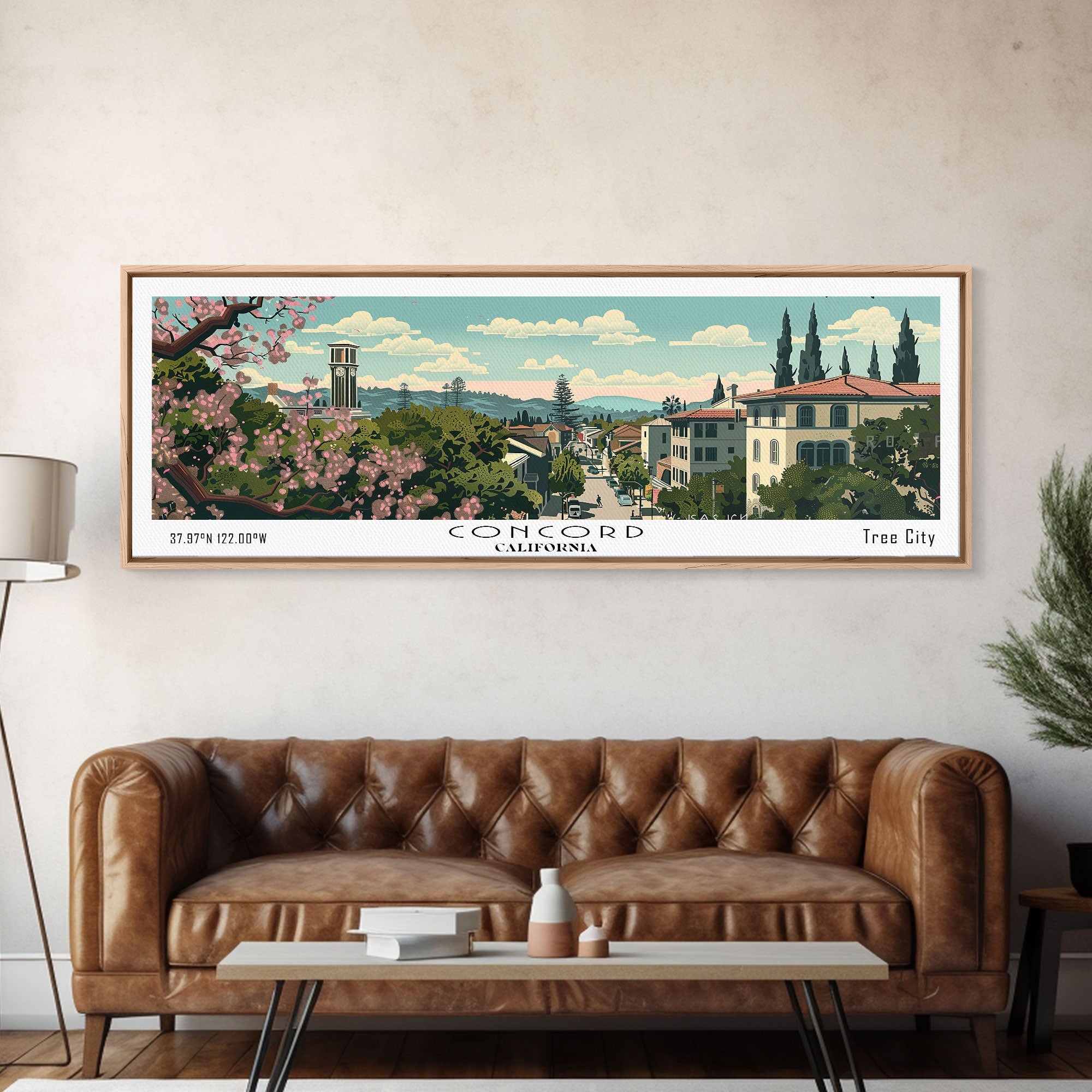 Concord California Panoramic Painting, Mid Century Modern Framed Canvas Print, Retro Pop Art Travel Poster, City Wall Decor, Office Decor
