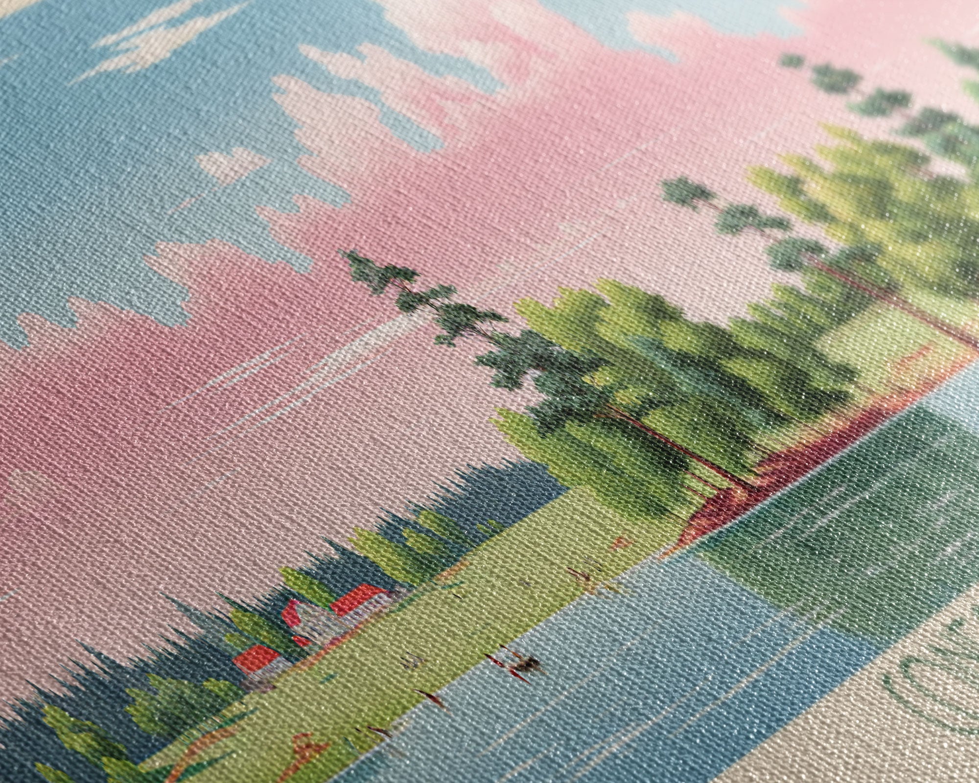 Most of our canvases are made in the USA, with the exception of canvases ordered with the light oak unstained frames, and any large canvases (24x48, 30x60, 16x48 and 20x60) ordered WITH a frame. These are temporarily made in and shipped from Europe, while we try to find a more consistent supplier in the USA.