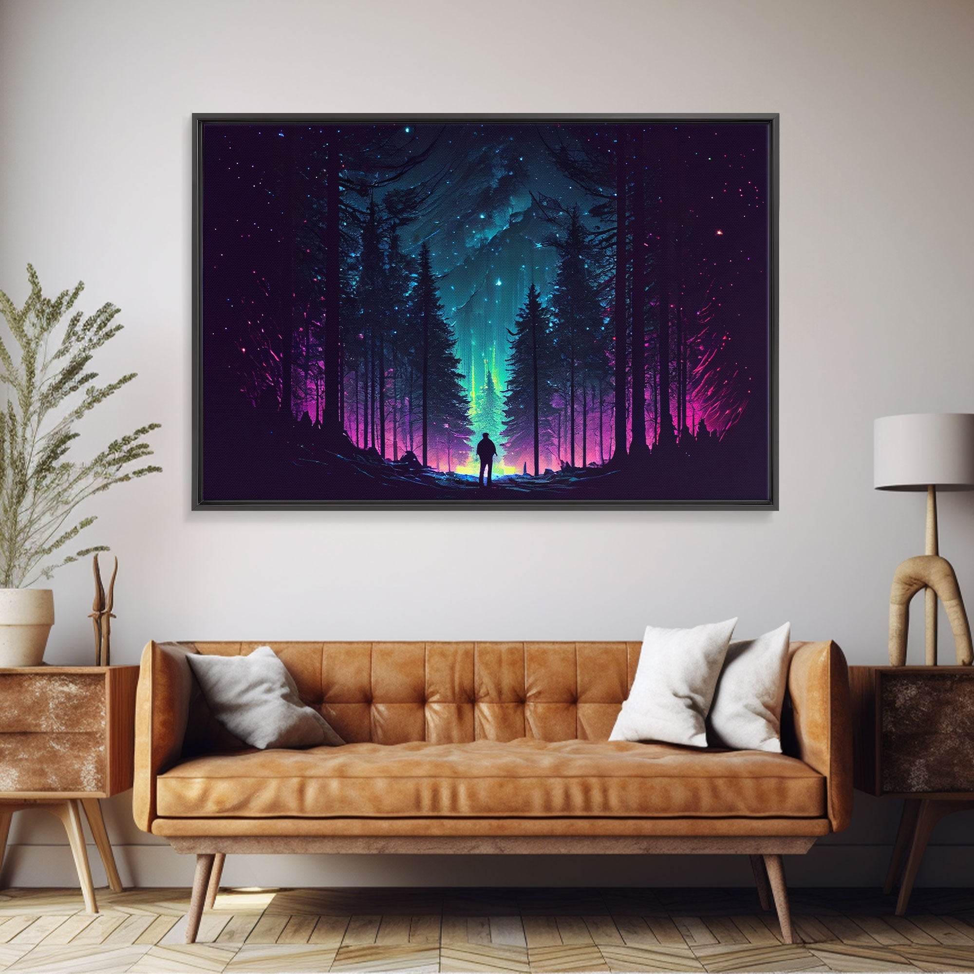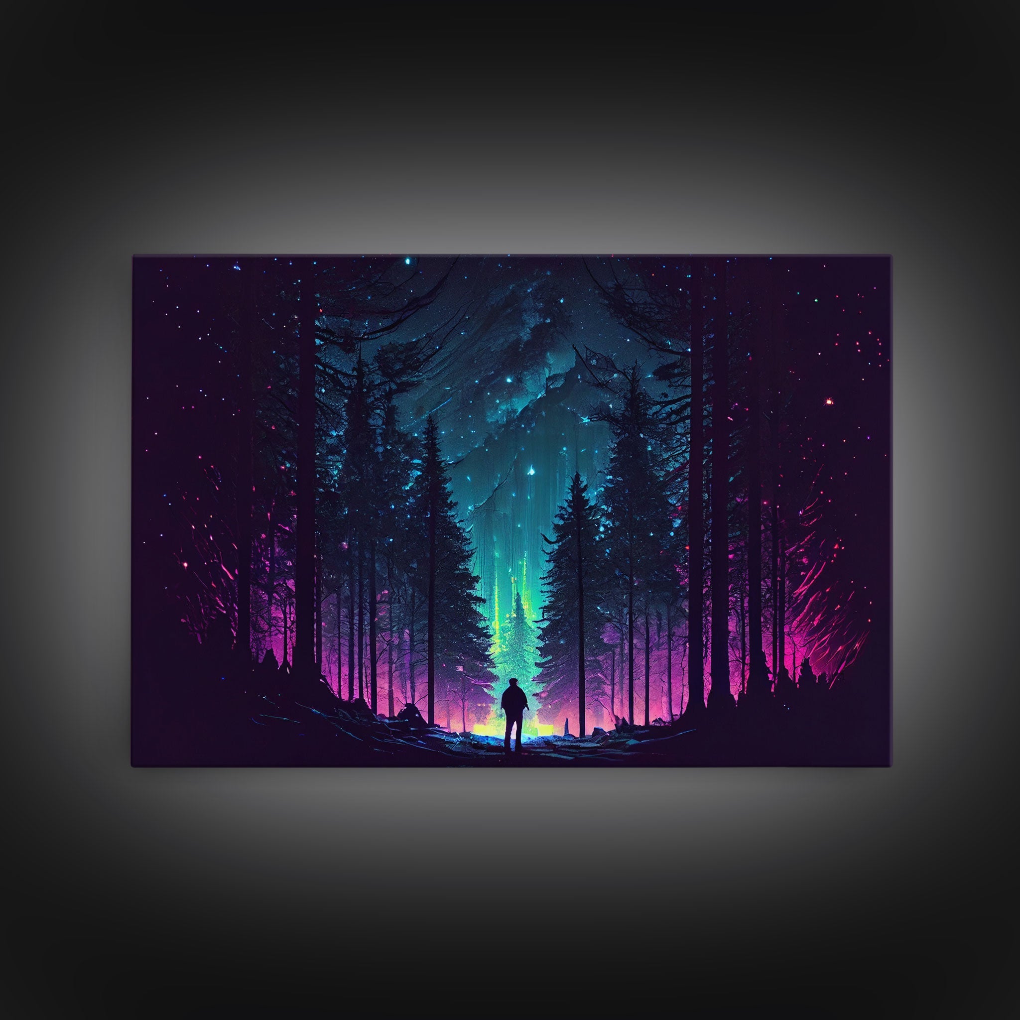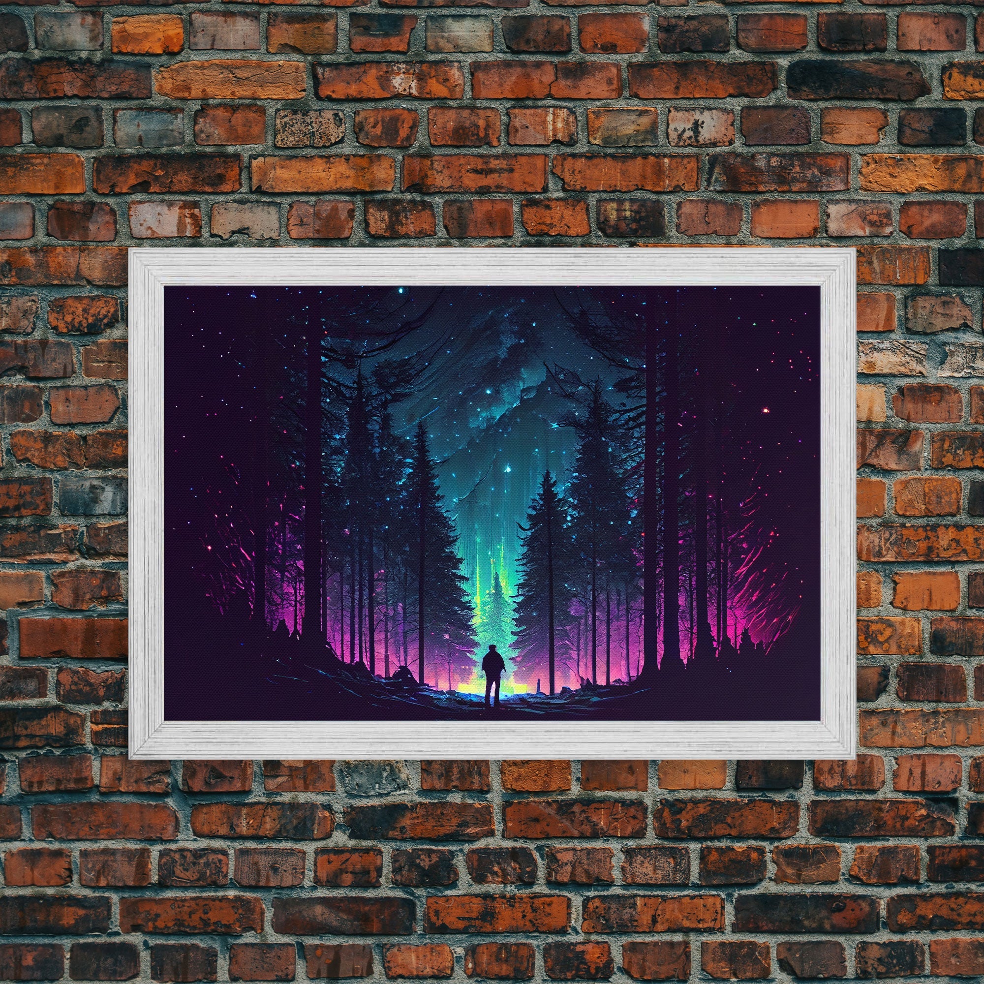 Contemplating the stars, vaporwave aesthetic, forest art, starry night, framed canvas print