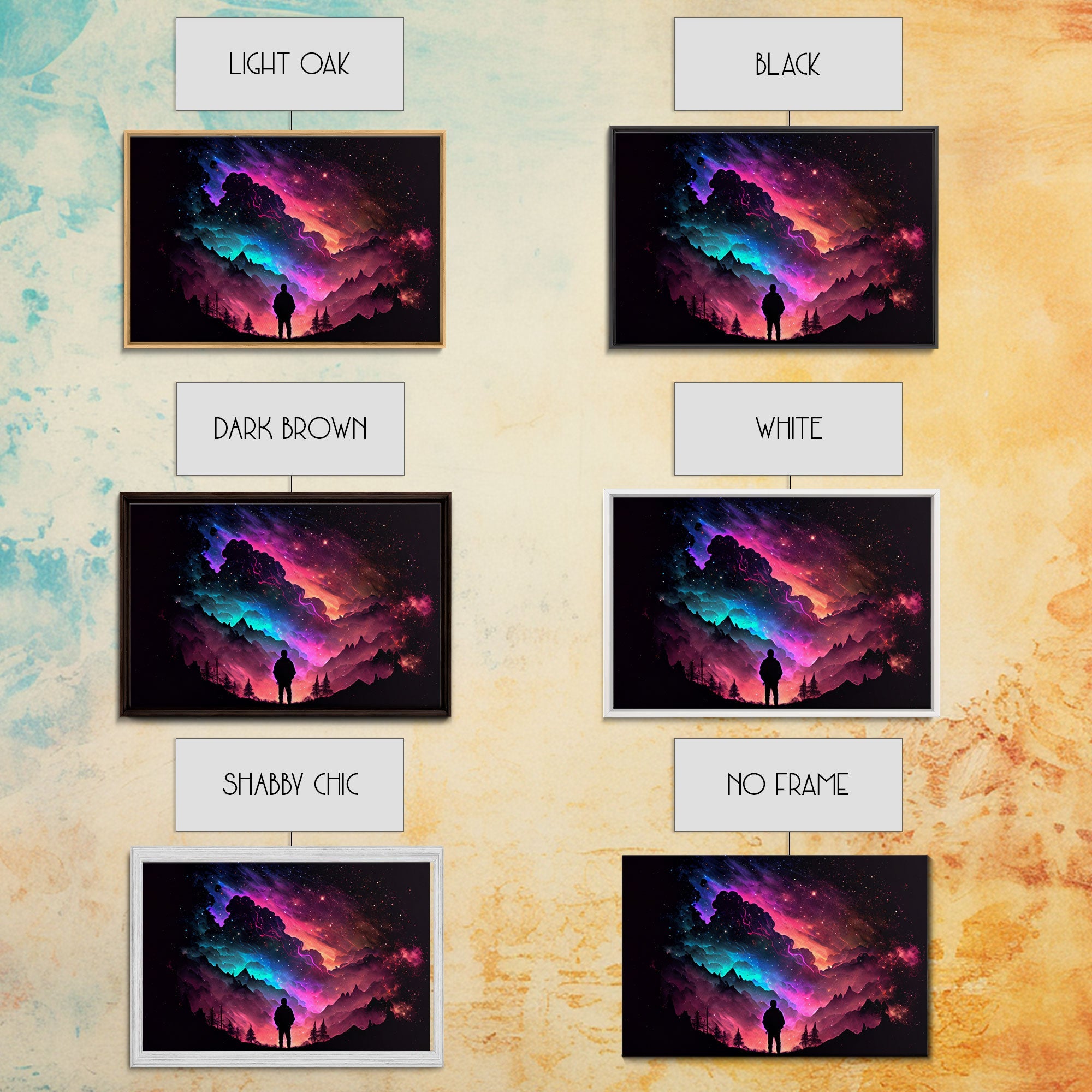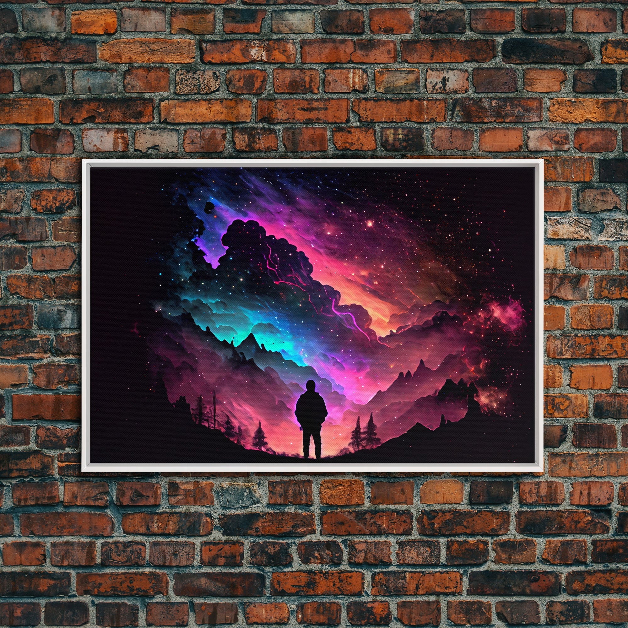 Contemplating the Universe, retro style space art, framed canvas print, synthwave space decor