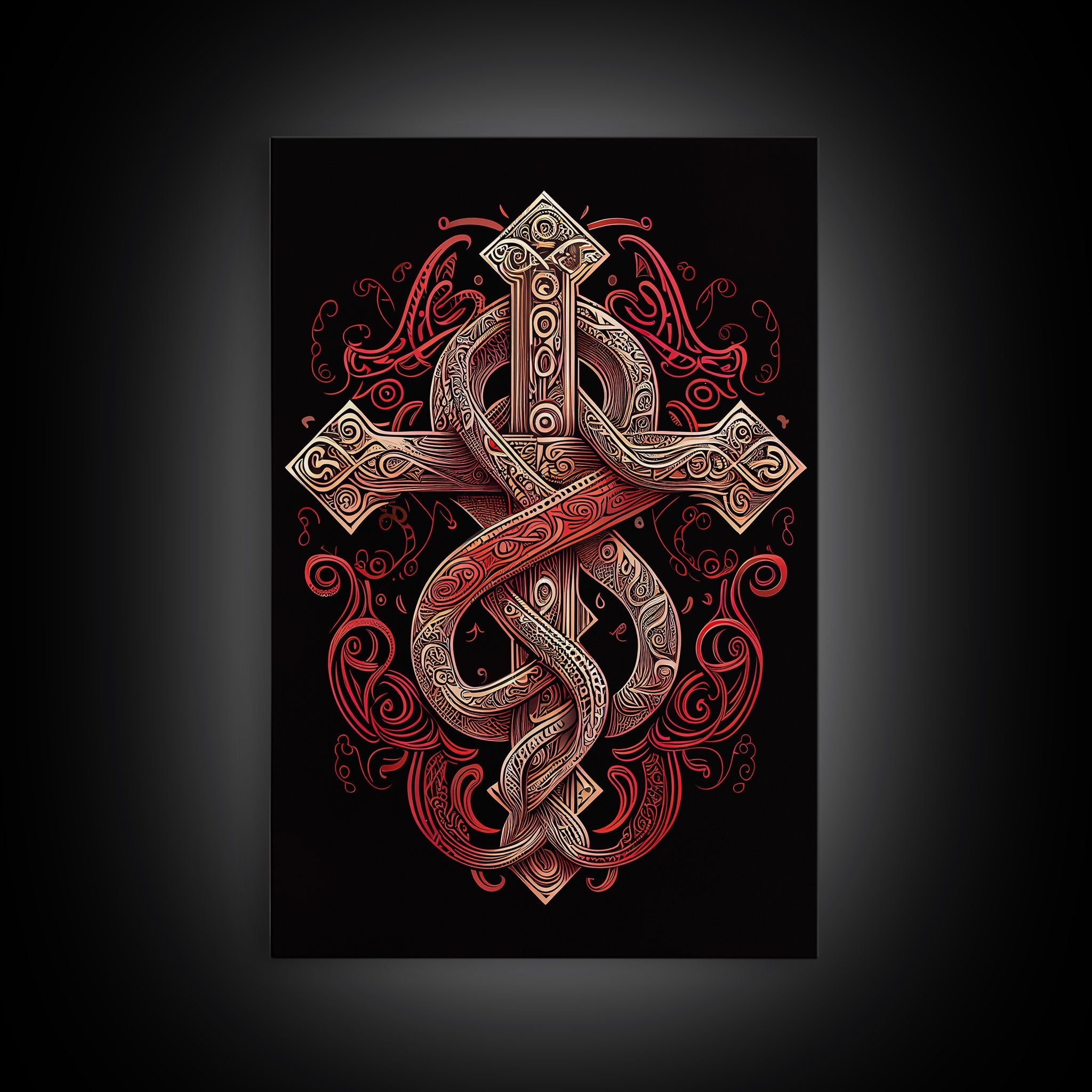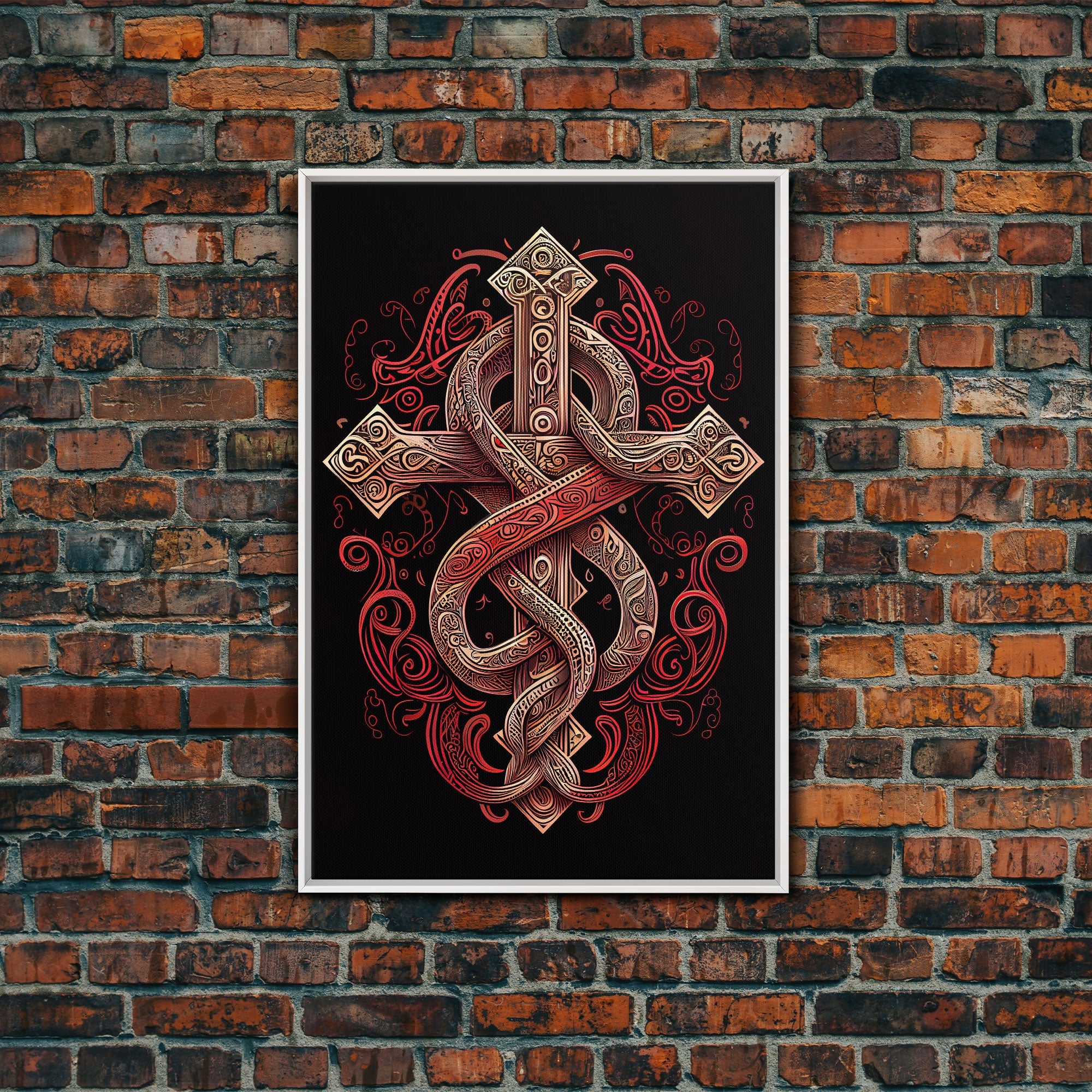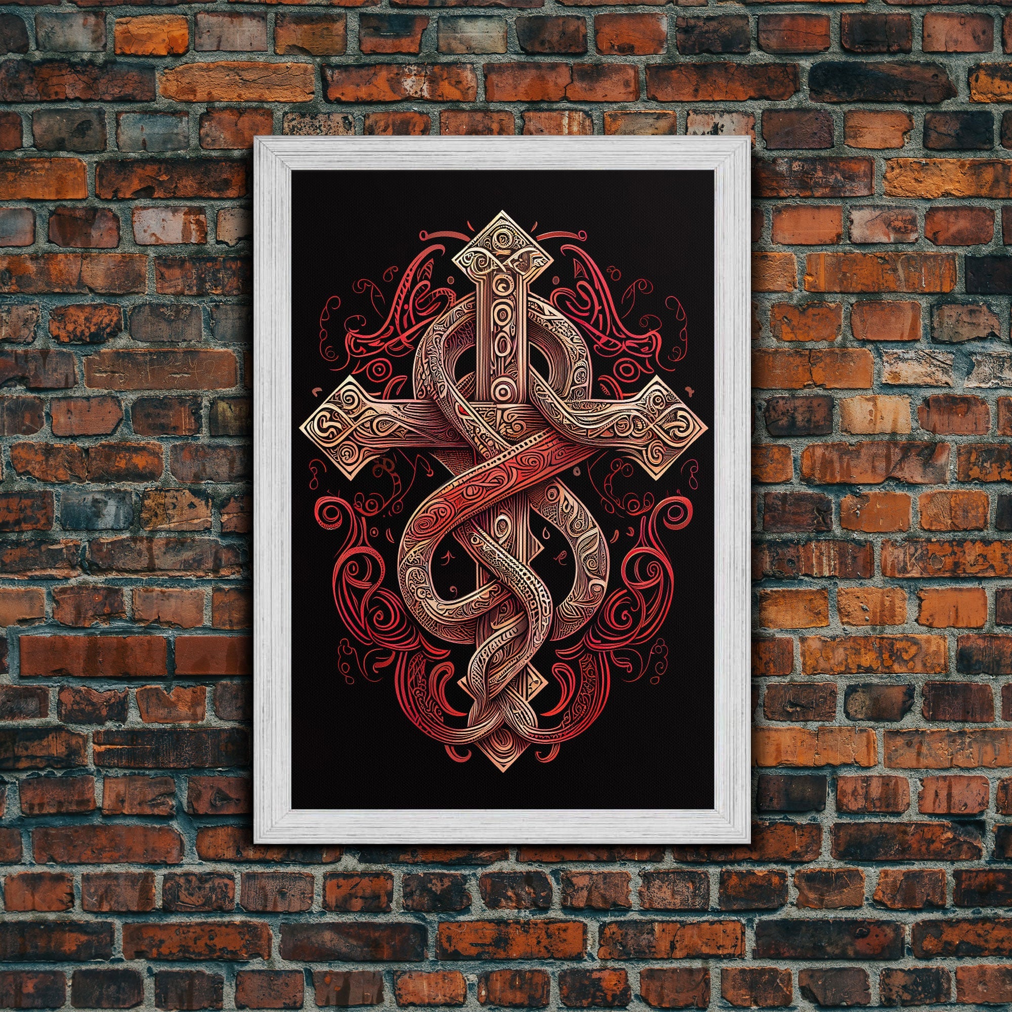 Cool Cross Art | Wall Art | Gothic Cross | Framed Canvas Print | Framed Art | Red and White Cross & Snake