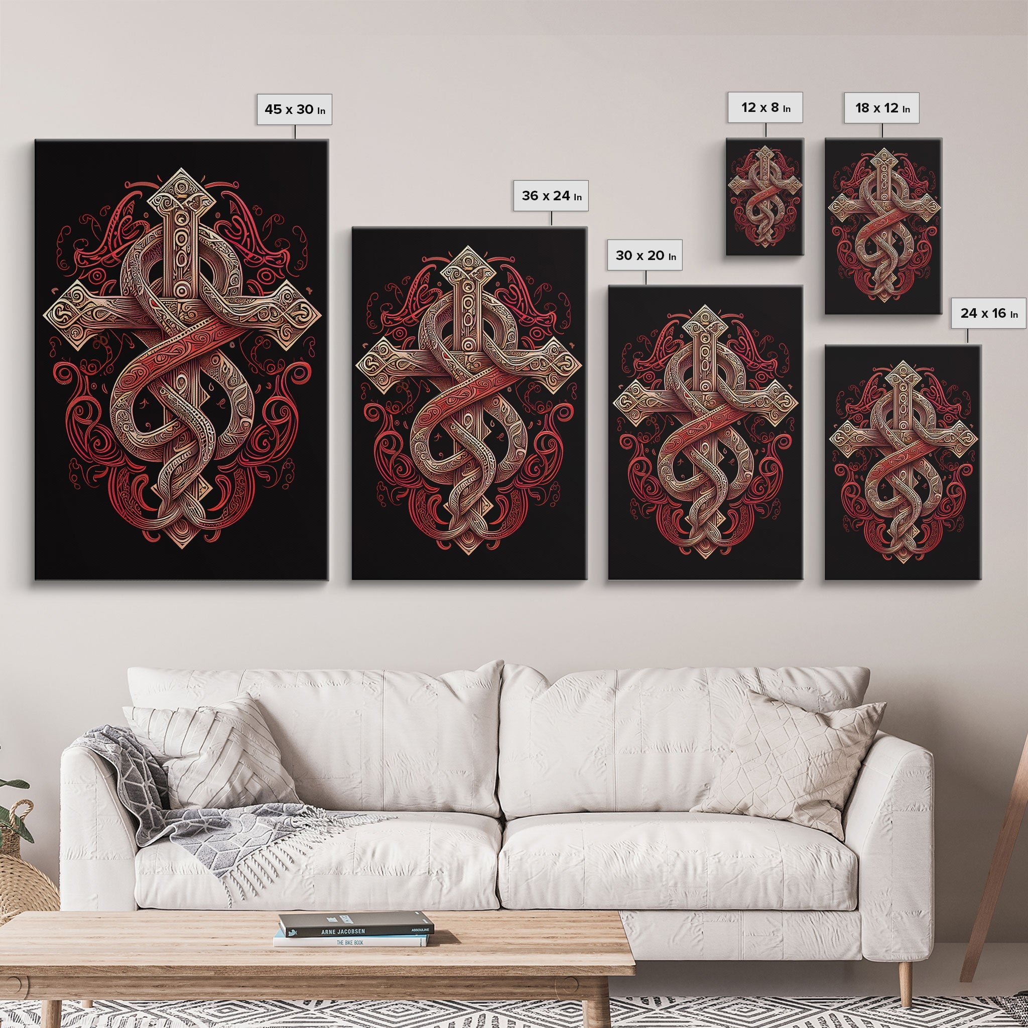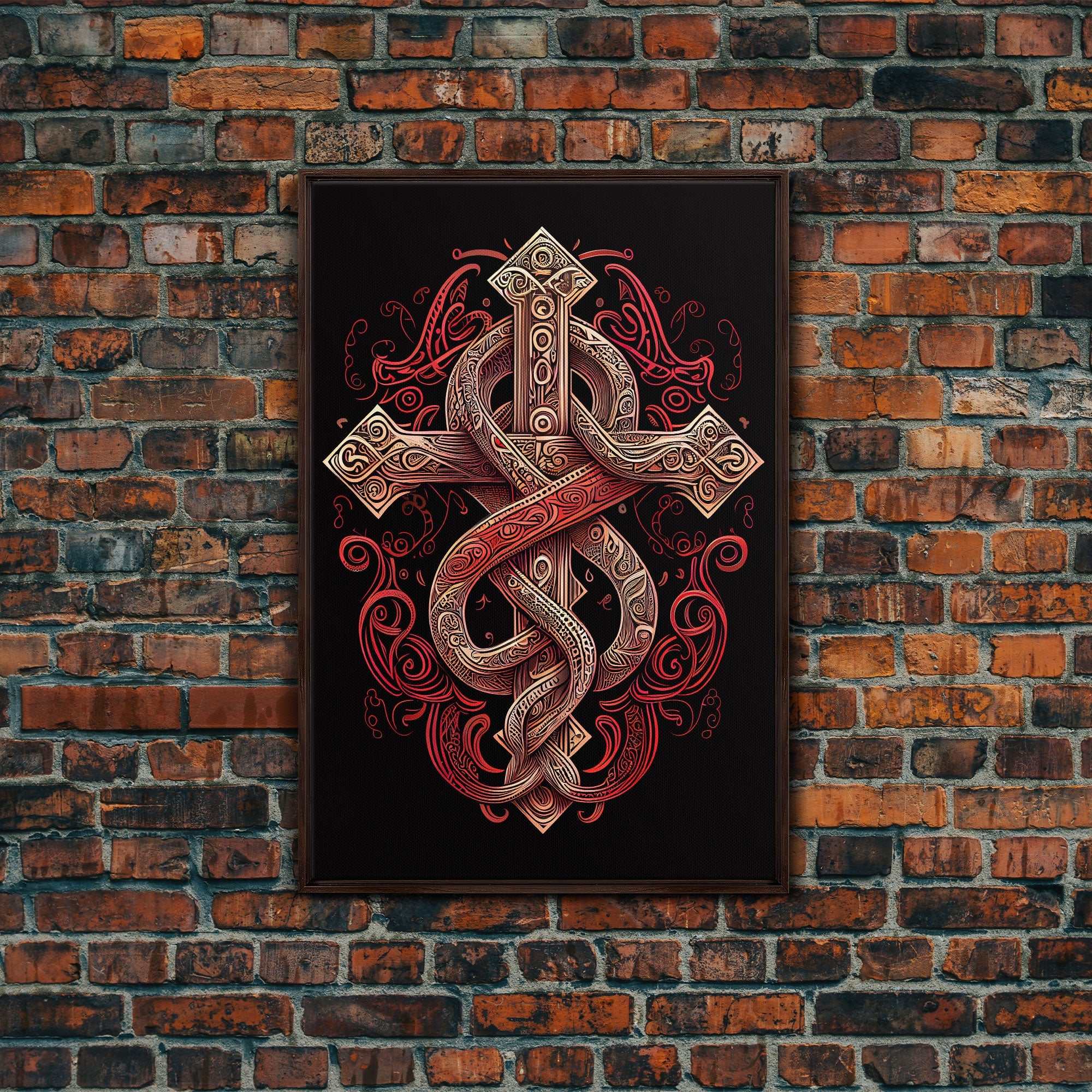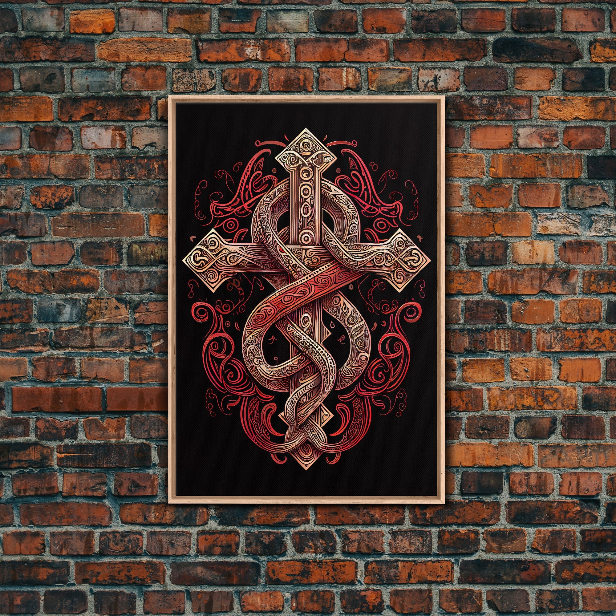 Cool Cross Art | Wall Art | Gothic Cross | Framed Canvas Print | Framed Art | Red and White Cross & Snake