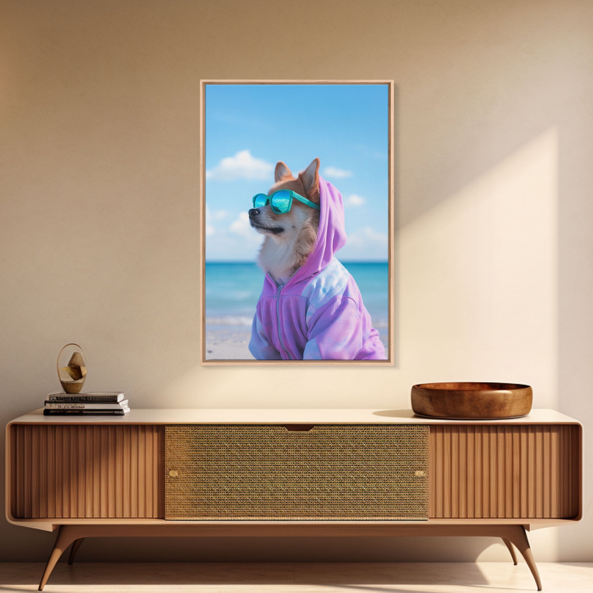 Corgi In Purple Hoodie Sunglasses Wall Print, Beach Art, Dog Print, Dog Portrait, Framed Wall Art, Framed Canvas, Wall Print, Wall Canvas