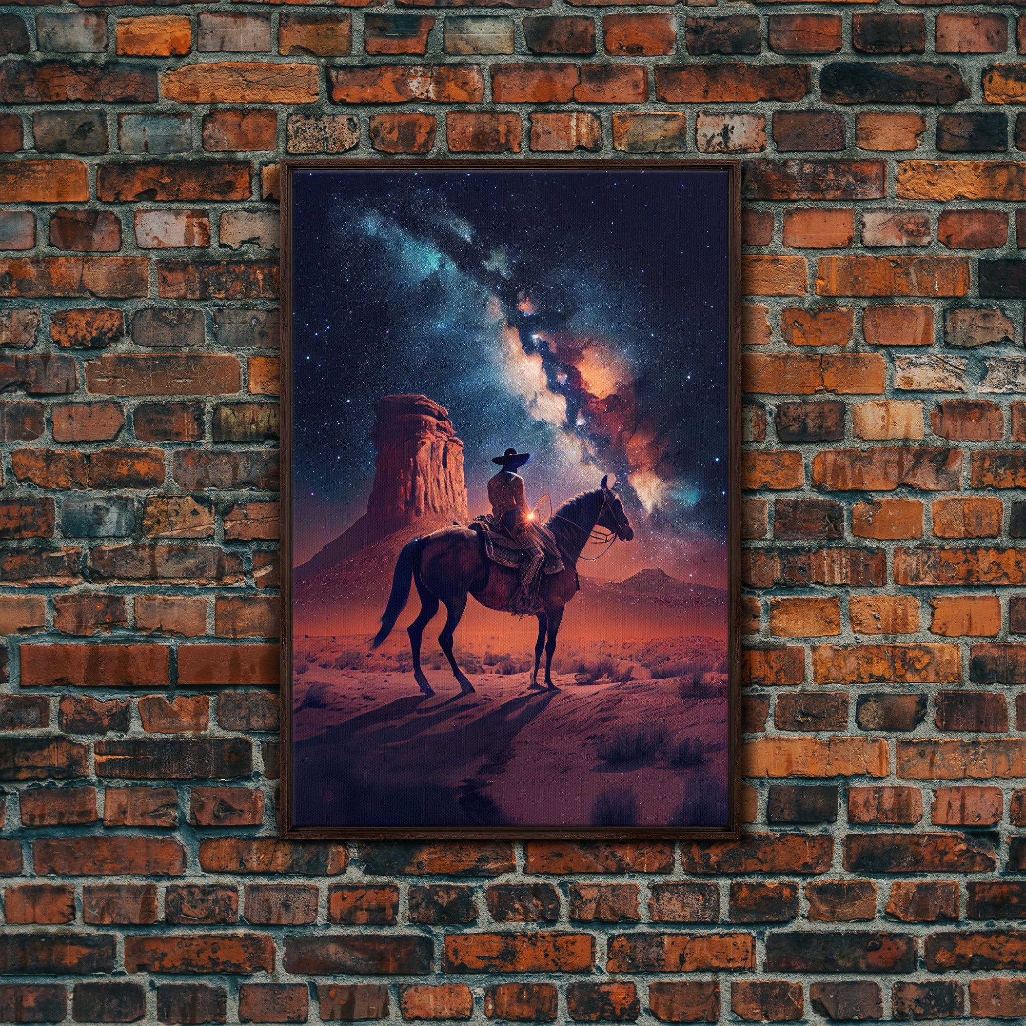 Cowboy contemplating the stars, framed canvas print, wild west art, western decor