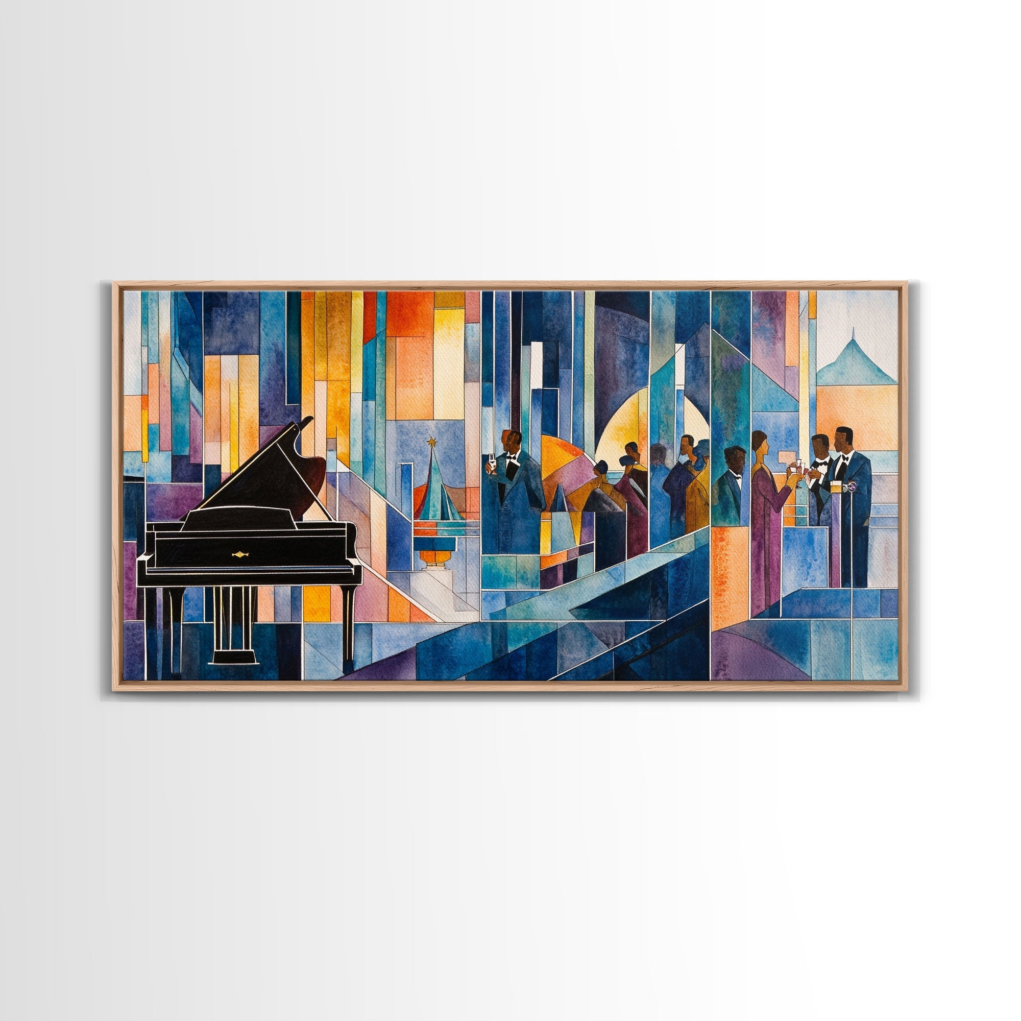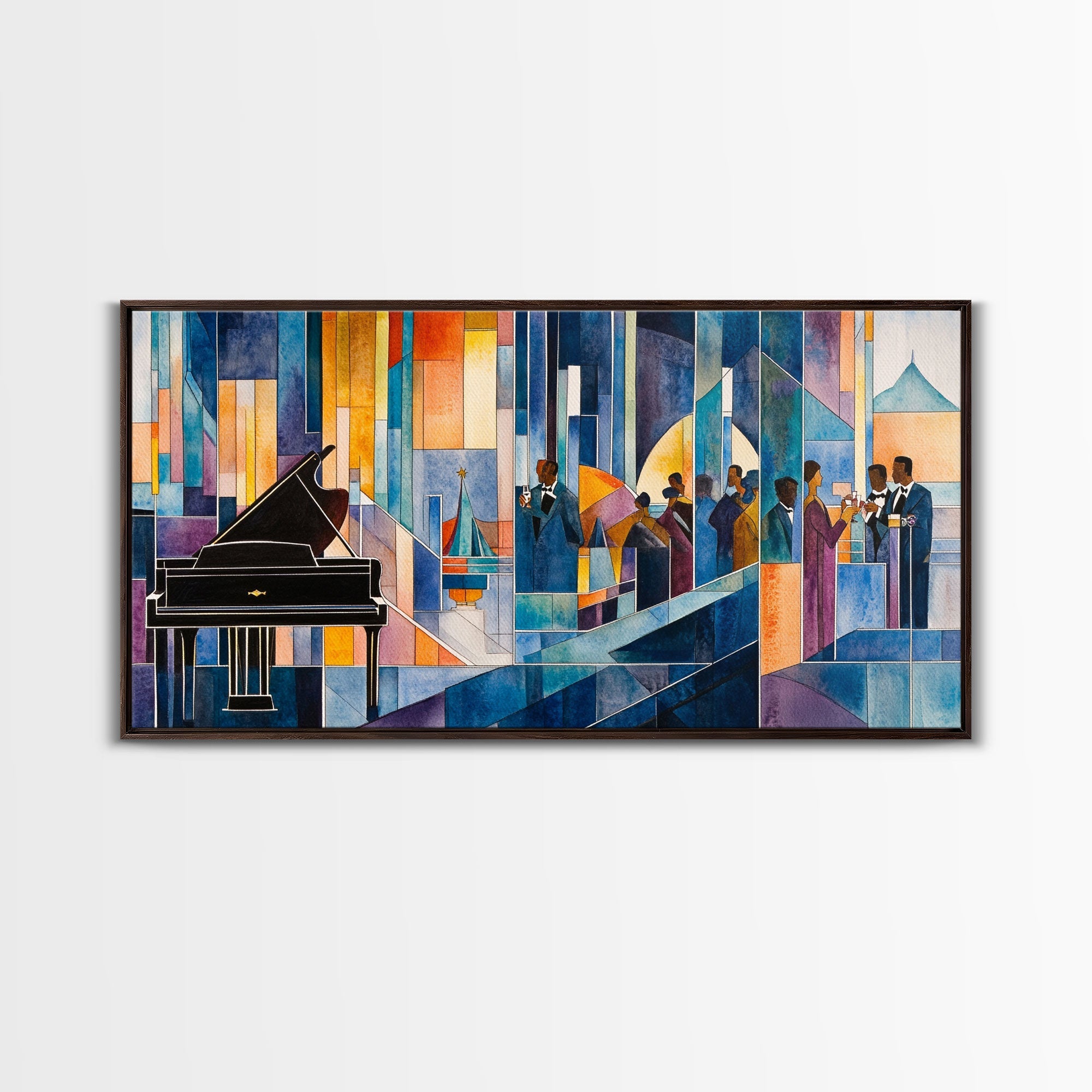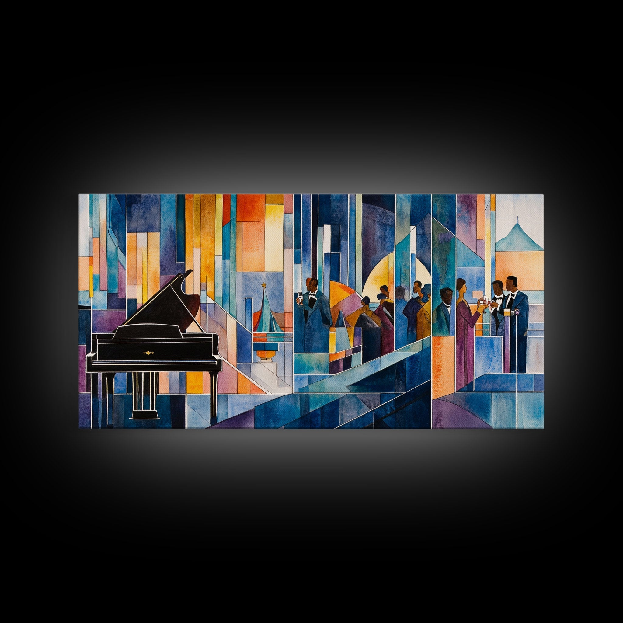 Abstract jazz party scene with grand piano, colorful stained glass aesthetic, framed canvas print ideal vibrant music wall art decor