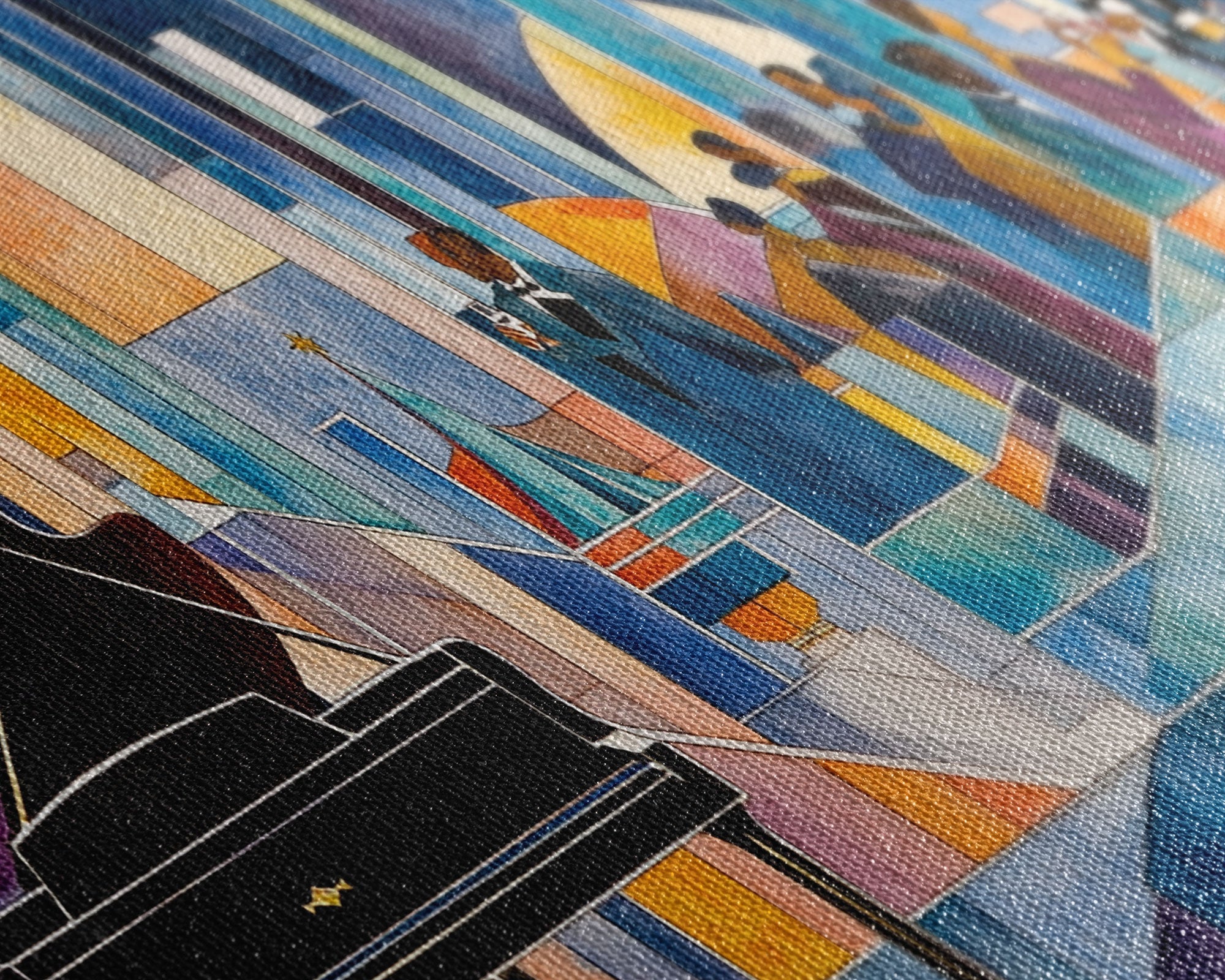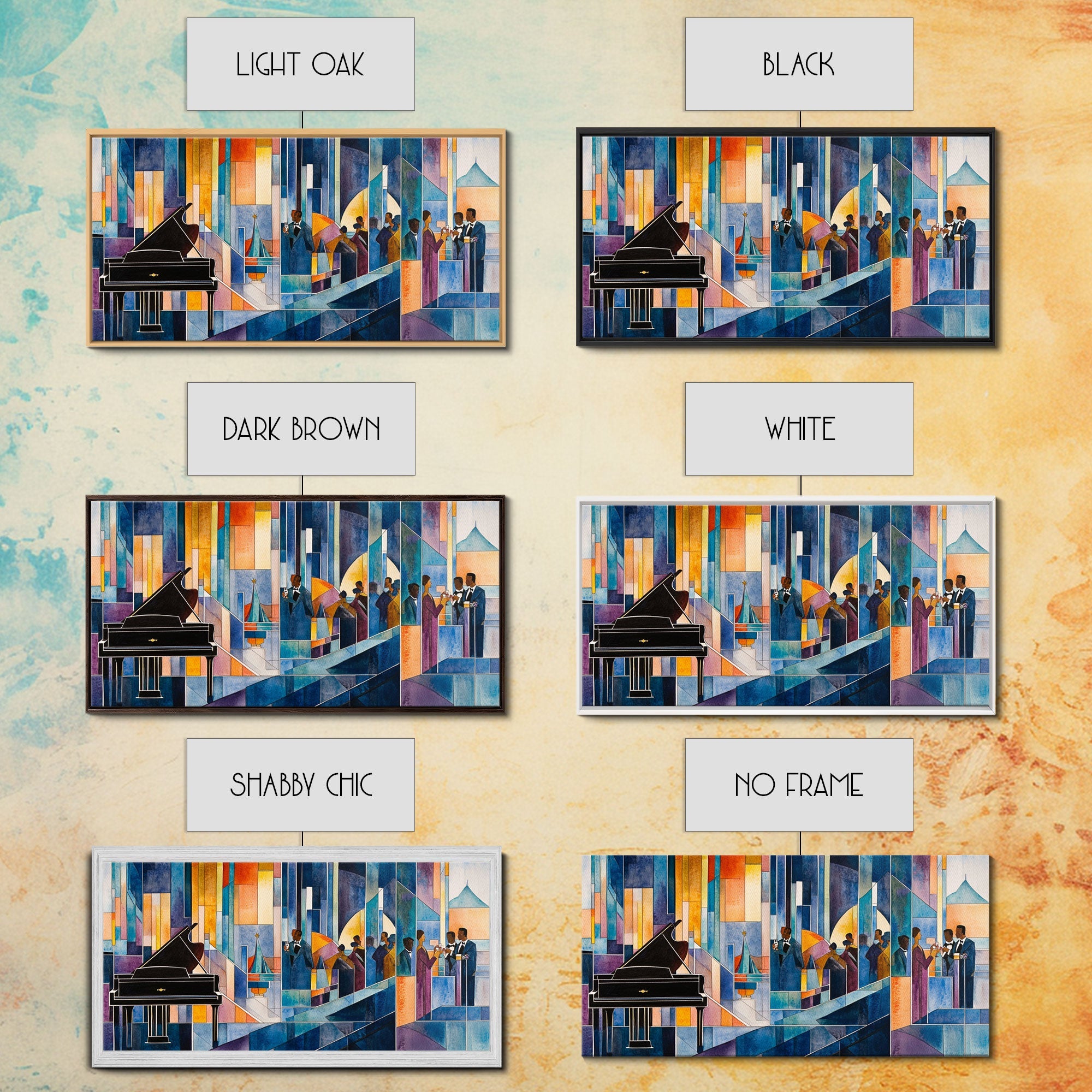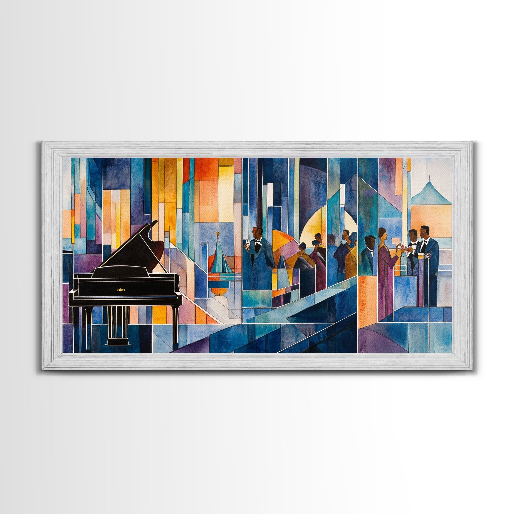 Abstract jazz party scene with grand piano, colorful stained glass aesthetic, framed canvas print ideal vibrant music wall art decor